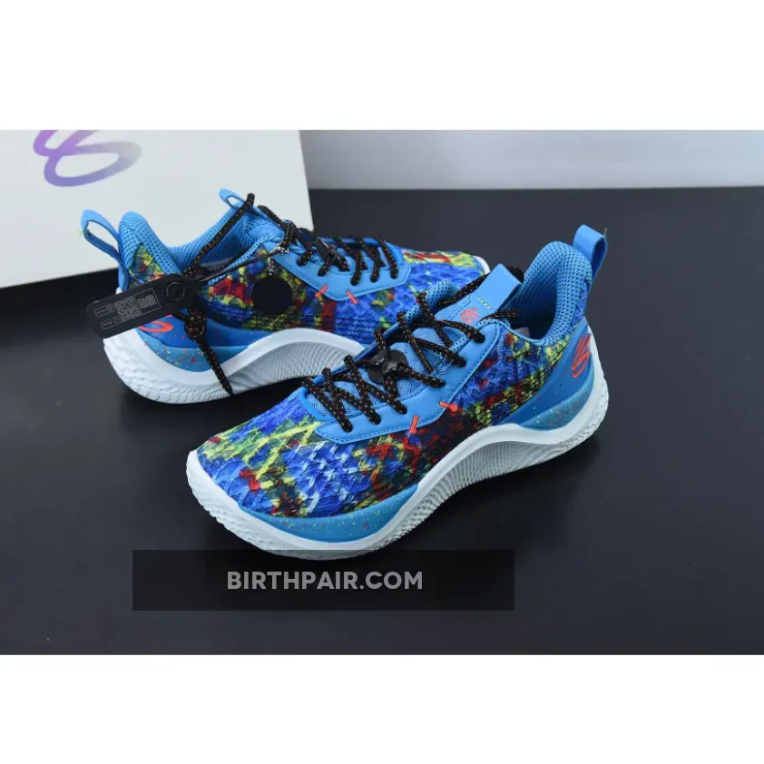 Across the model, a mainly blue upper comes accented by multi-color hits featuring graphics of Sour Patch Kids and its packaging. This all sits on the UA WARP mesh upper while blue leather eyestays, a mesh tongue, and mesh sockliner come accented by a black/multi-color set of laces. Atop the tongue and back on the heel, a leather pull tab features Steph Curry’s logo that also makes an appearance on the lateral sides blue TPU overlay. This overlay as well as the one located on the forefoot comes with a multi-color splatter print that matches the rest of the uppers graphics. Rounding out the design is the UA Flow cushioning system which comes in all-white with an internal midfoot shank adding support and stability for on-the-court action.