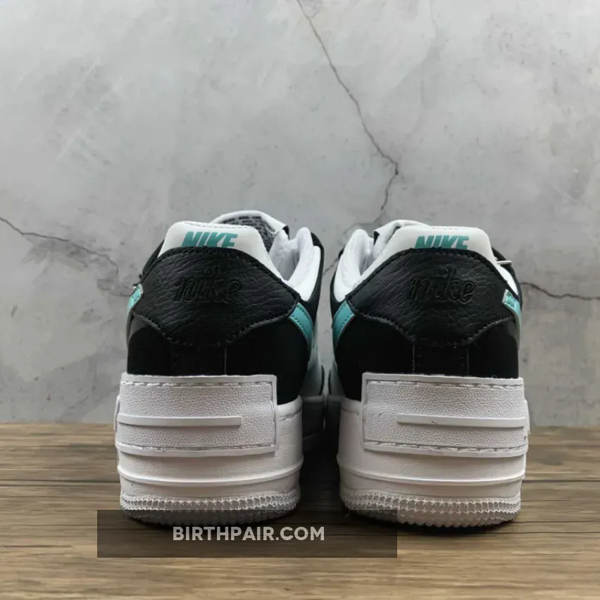 Luminous blue Swooshes light up the sidewalls with the deconstructed Swoosh across the lateral side stretching back to the overlayed panel across the heel. Doubled-up details take this white black blue AF1 Shadow to the next level, with a script logo embroidered on to the heel layered over a bright blue ‘NIKE’ motif.