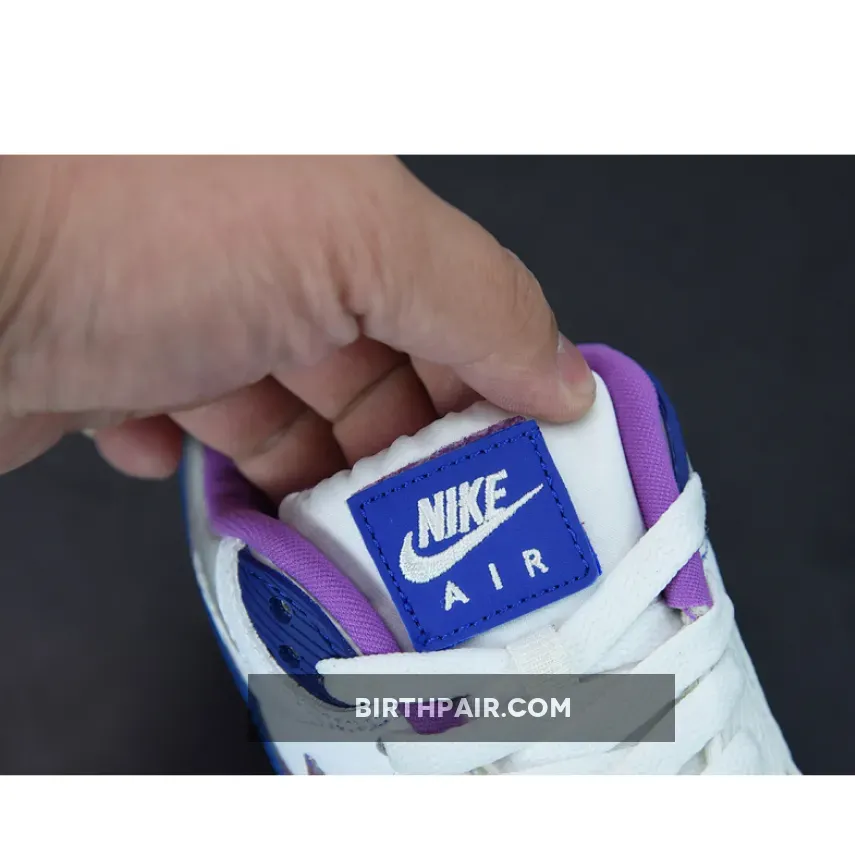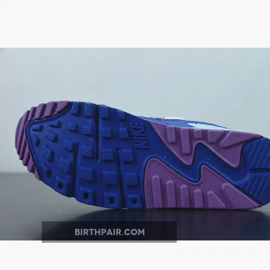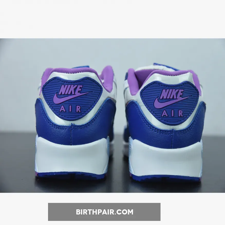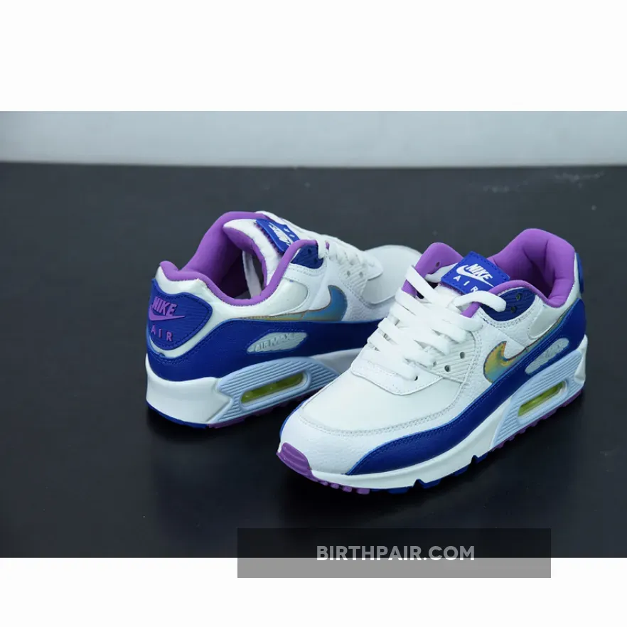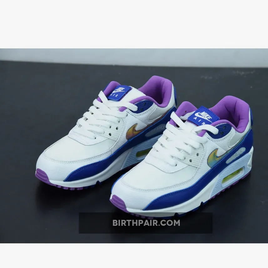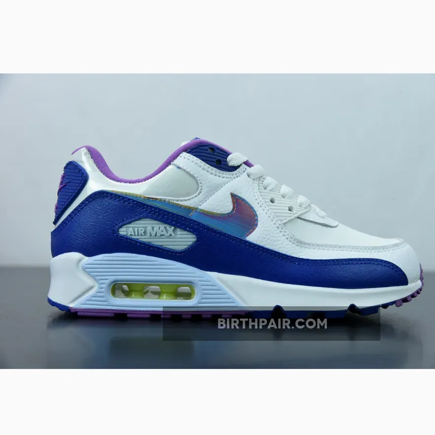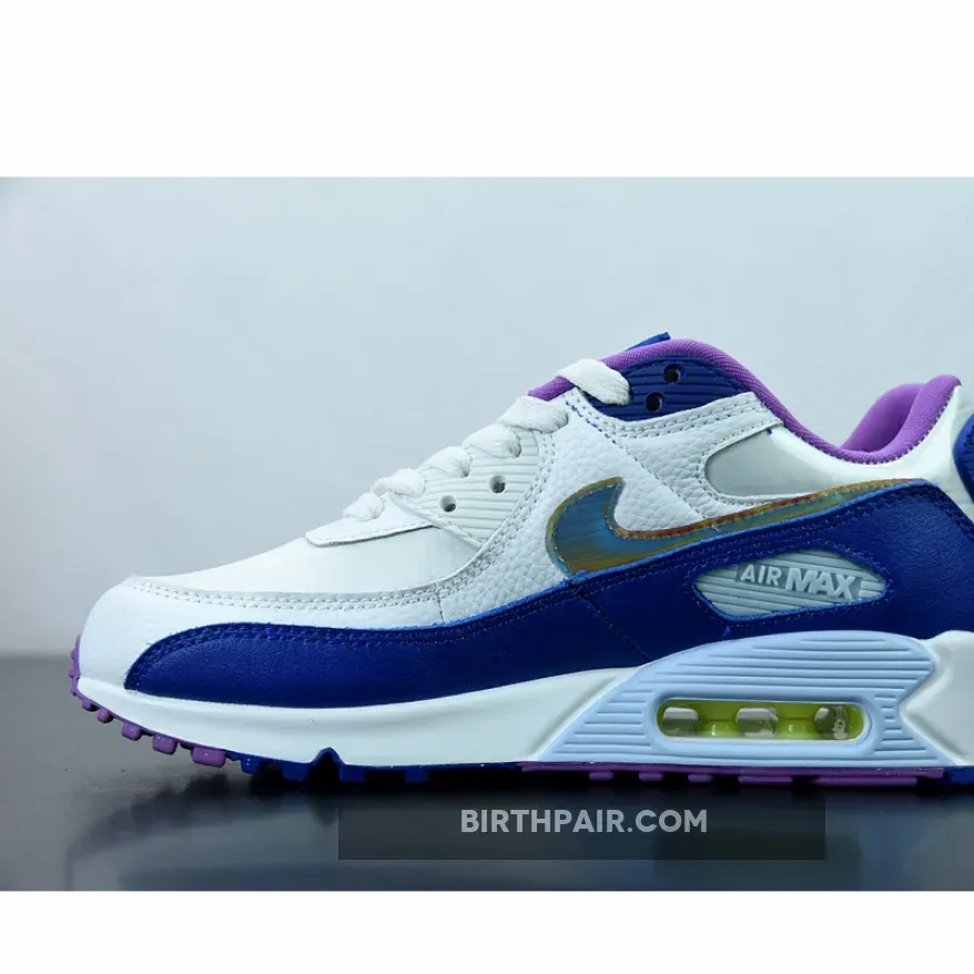 this Nike Air Max 90 comes highlighted with White across the upper while tumbled leather lands on the overlays and Blue leather is applied to the mudguard. Following we have Purple and a lighter shade of Blue detailing, iridescent on the Swoosh logos across the panels and Volt used on the Air unit. Finishing the look is a velcro patch on the tongue that unveils a cracked egg while the same branding is seen on the insoles.