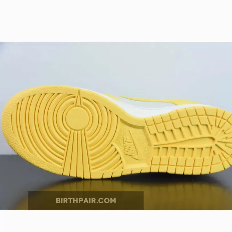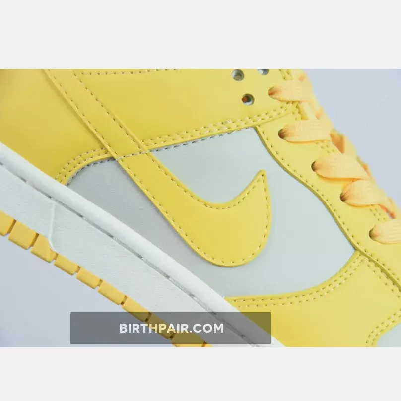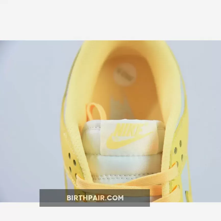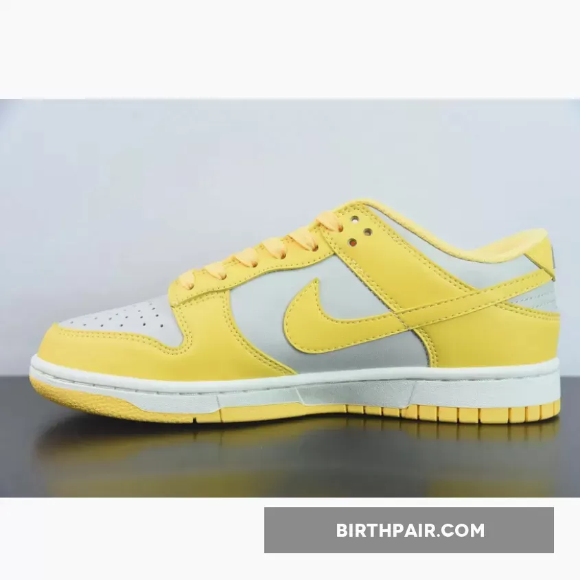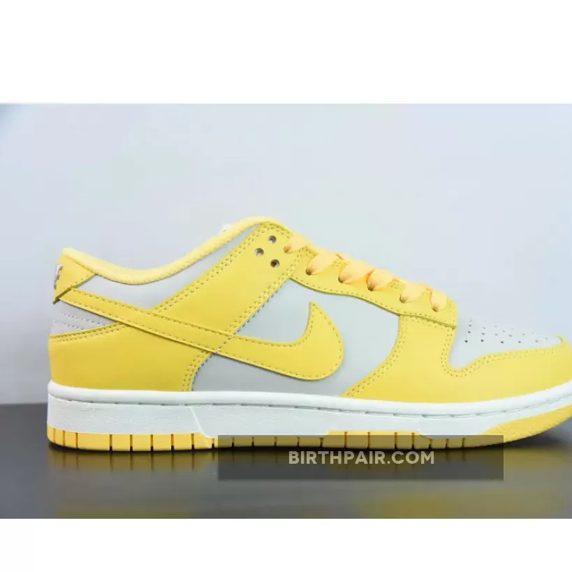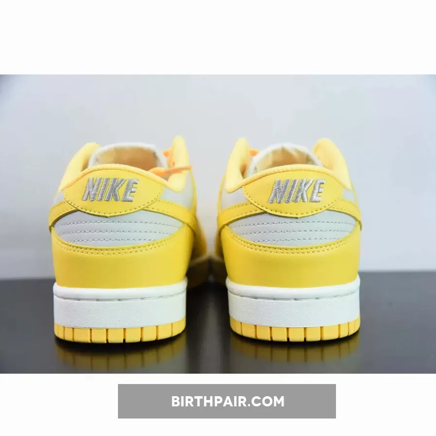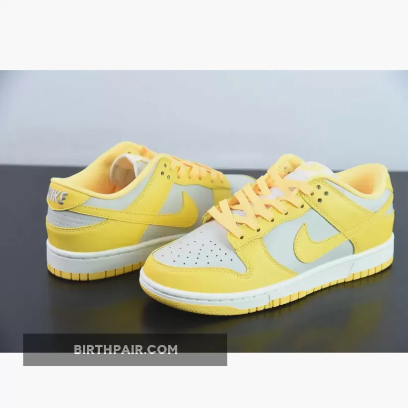 Covered in an official color scheme of Light Bone, Citron Pulse, and Sail, this Nike Dunk Low features a full leather build on the upper with a light grey seen on the base and the highlight Citron Pulse noted on the overlays, Swooshes, and inner liners.