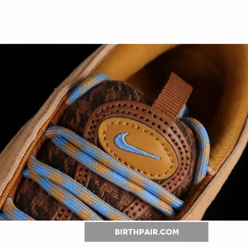 The bullet train and mountain bike-inspired Nike Air Max 97 has a surprising new look that deviates from its mesh-and-leather combo. Take a closer look at the Nike Air Max 97 Teddy Bear. This Air Max 97 has a woolly light brown Harris Tweed base. The rest of the rippled design on the upper are hairy “Teddy Bear” suede with a strip of light brown smooth leather closer to the bottom layer. A chocolate brown woven fabric peeks out of the mid-panel cutout and shows off an embroidered University Blue mini Swoosh. The tongue is also made from the same brown woven fabric that sets off the tan leather tongue tab with University Blue embroidered Swooshes. The rope laces are a gradient mix of brown and blue. An adorable brown and blue teddy graphic graces the brown mesh insole.