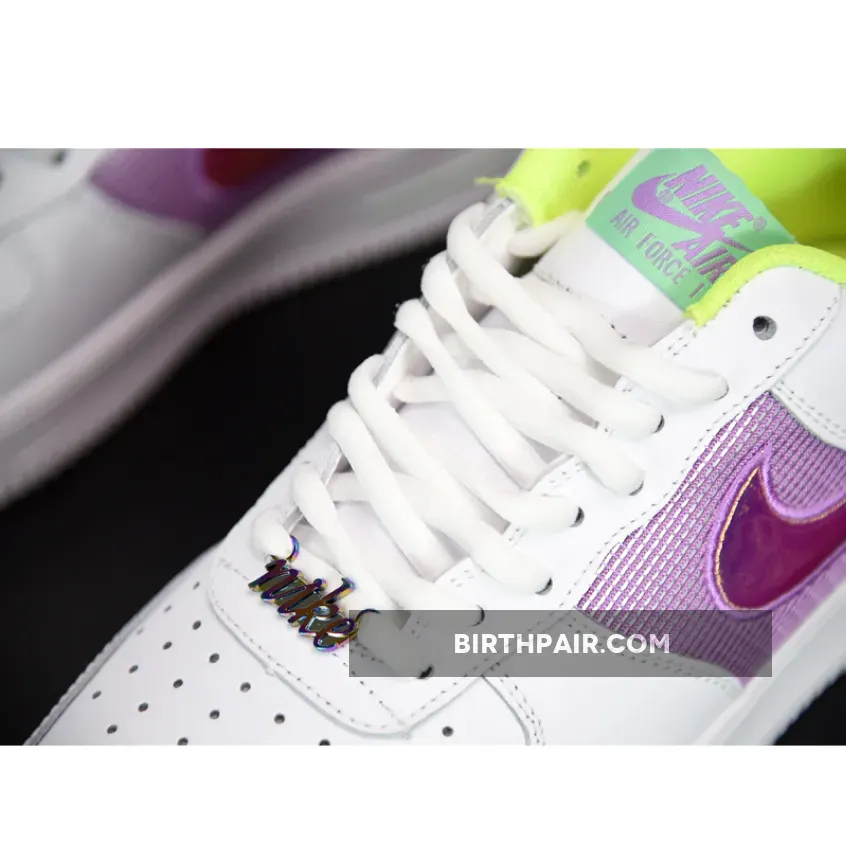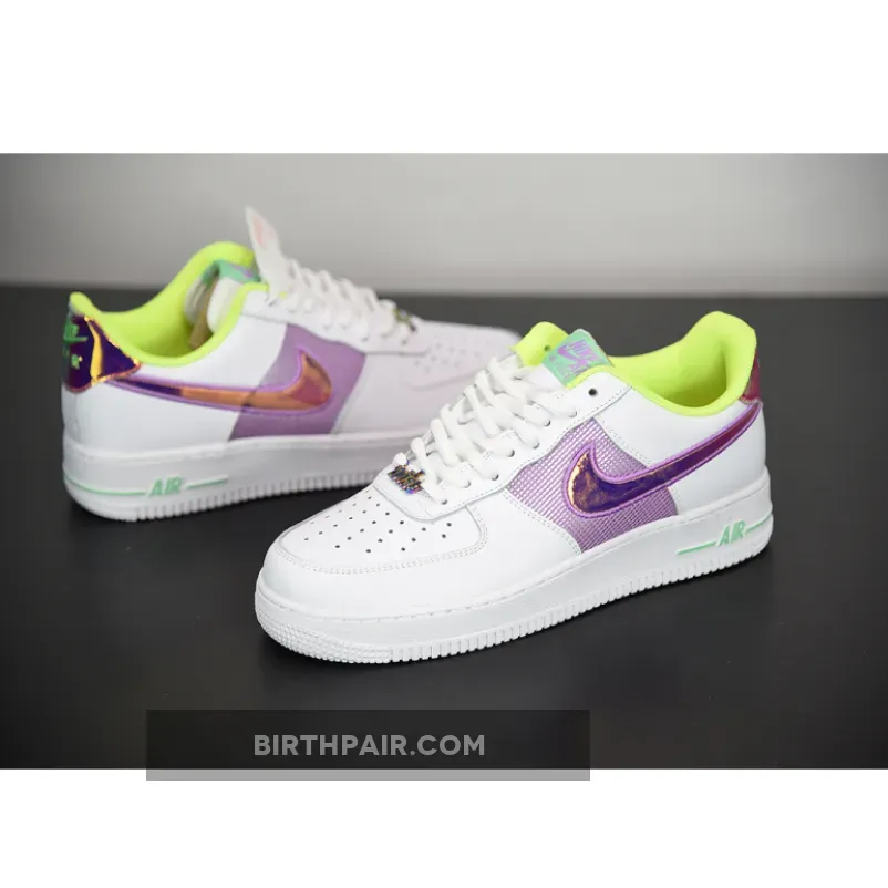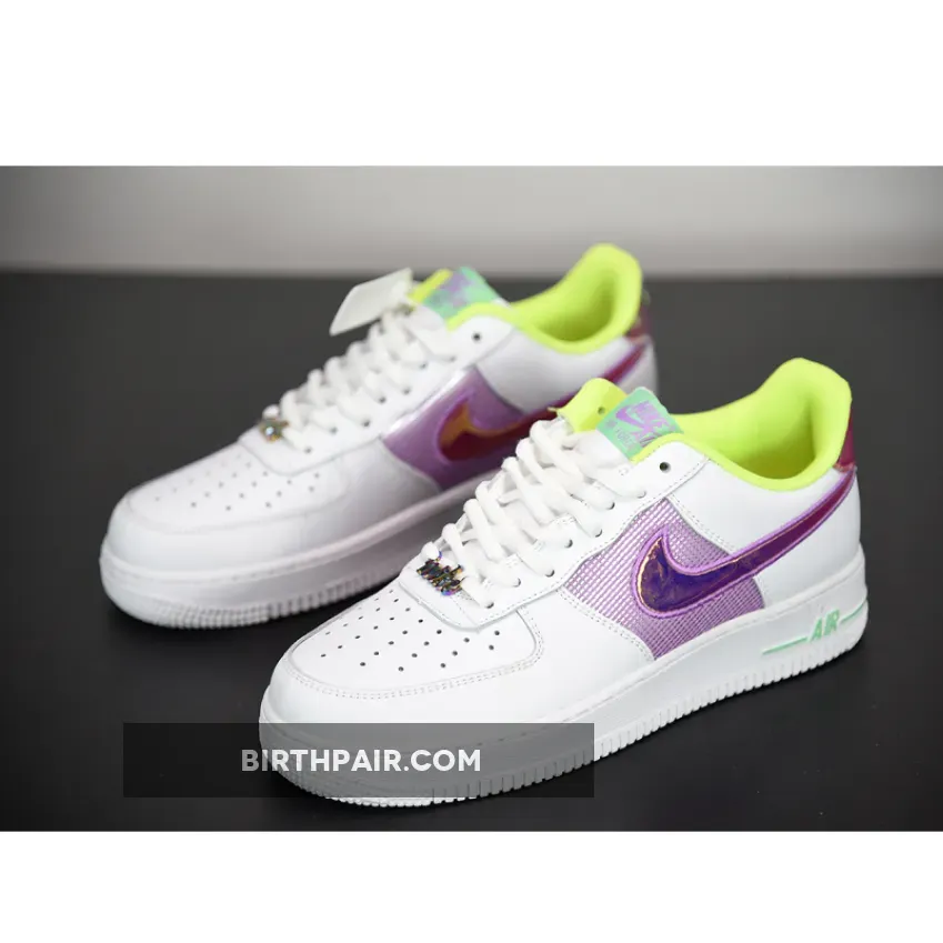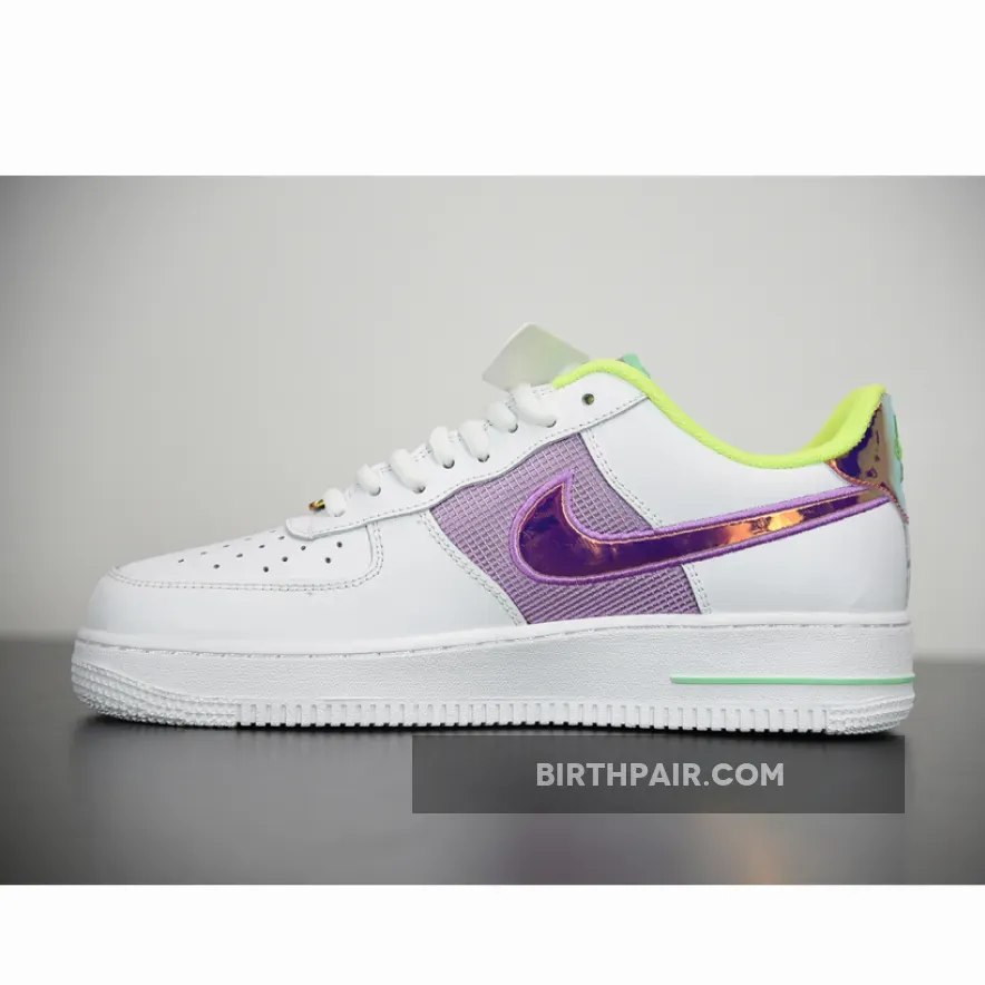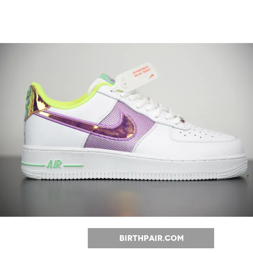 Like the official Air Force 1 Easter 2020, “White” sets the stage for multicolored accents. Smooth leather covers much of the upper, but it’s interrupted by Jordan 4-like windows at the midfoot. Profile Swooshes are trimmed by these panels’ purple hue, but they make a bolder statement via their copper finish. Heel tabs follow suit, though their “NIKE AIR” branding introduces a rich green into the mix that becomes lighter across the tongue, collar and midsole. While free of any cracked egg-graphics, tongue labels deliver an April 12th-appropriate color scheme, similar to a previous “Oracle Aqua/Barely Volt” Air VaporMax Plus. Vintage-style “nike” lace dubraes, which have also surfaced on the Air Max 97, add more metallic flair to the ’82 design.
