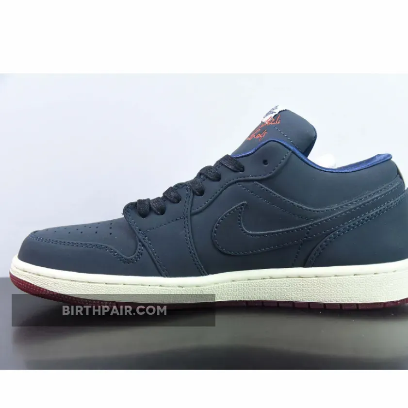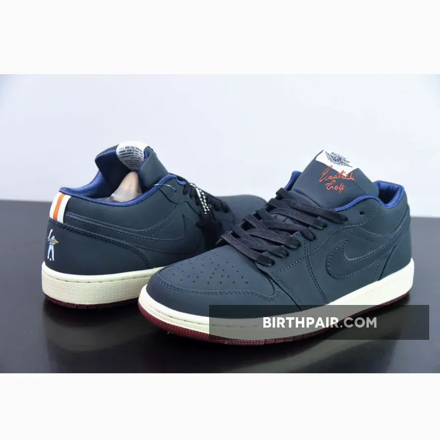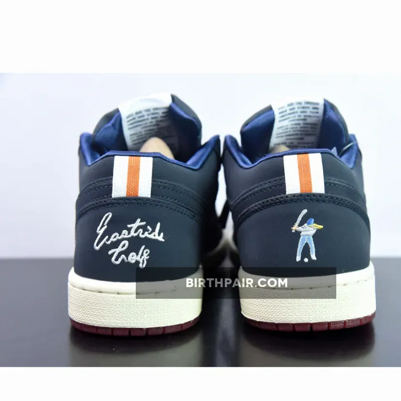 From the exterior point of view, the shoes are designed with a rather understated motif. the Eastside Golf x Air Jordan 1 Low comes dressed in a Midnight Navy, Burnt Sunrise, and White color scheme.