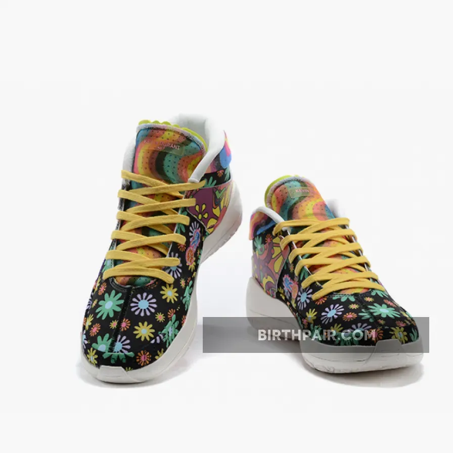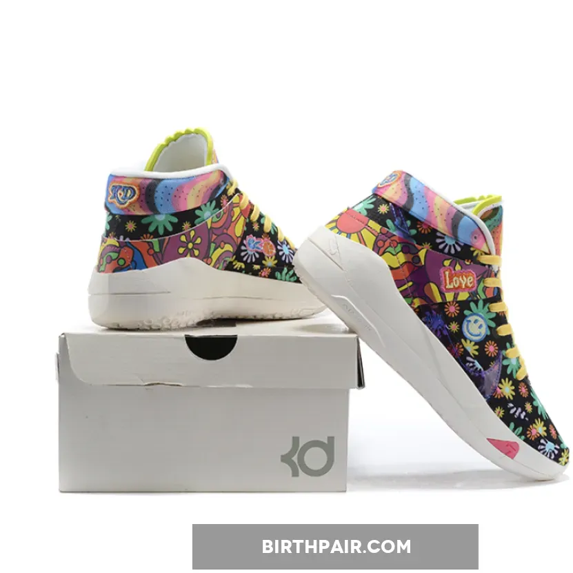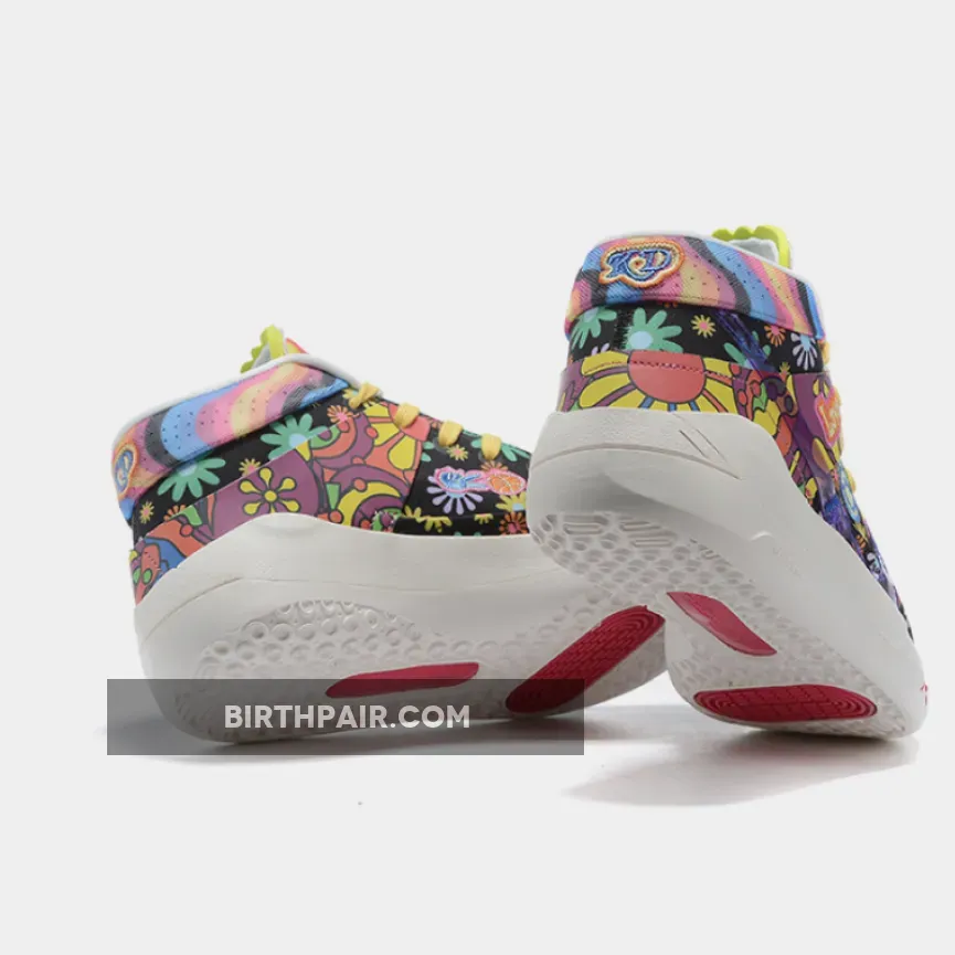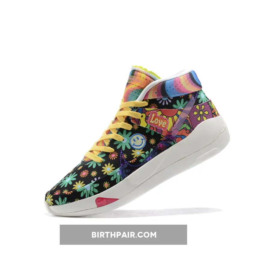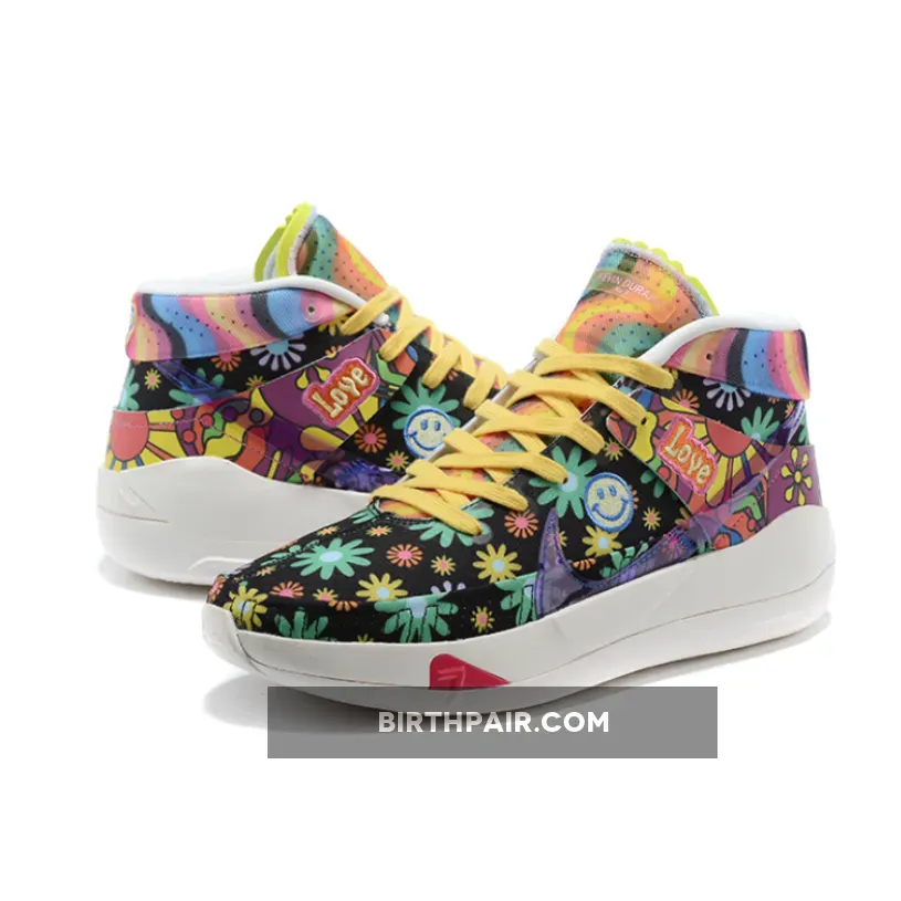 this Nike KD 13 comes with Black across the base while multicolor daisy florals are spread throughout which gives them a hippie vibe. Patches are seen throughout which includes peace signs and basketballs. Some of the other highlights includes a transparent Swoosh, ‘Love’ and smiley face patches. Finishing the look is a White rubber outsole.