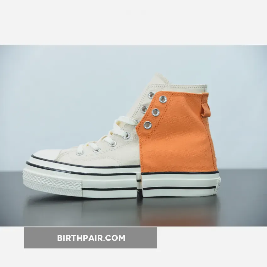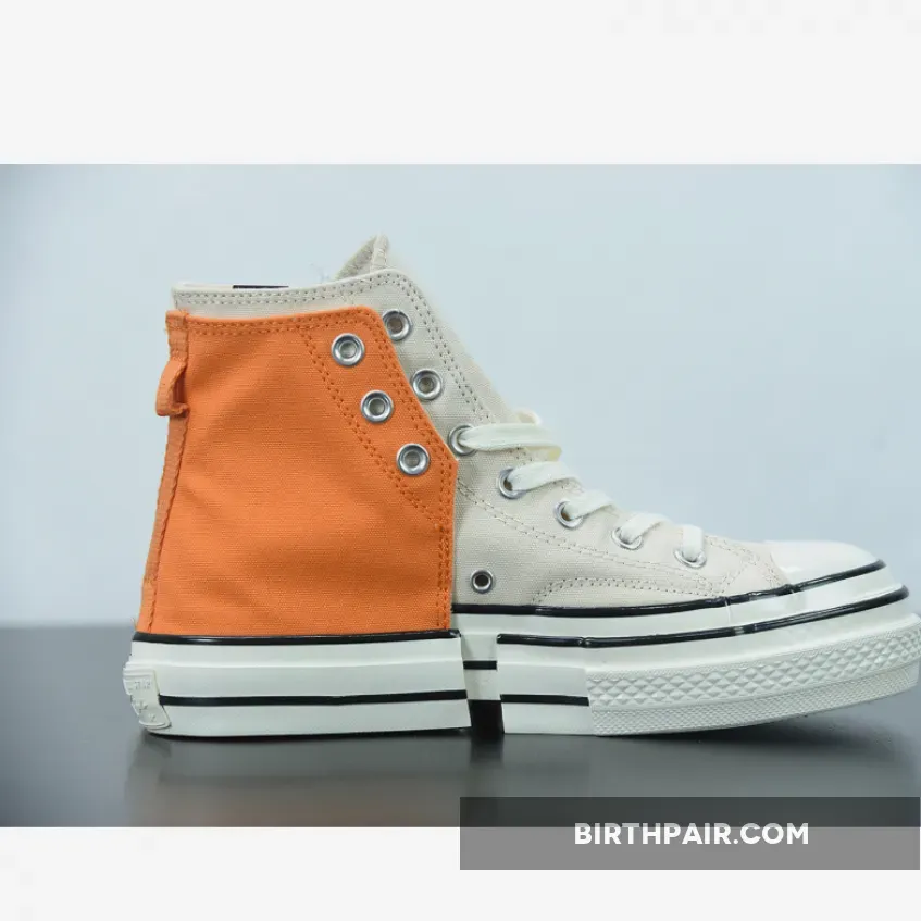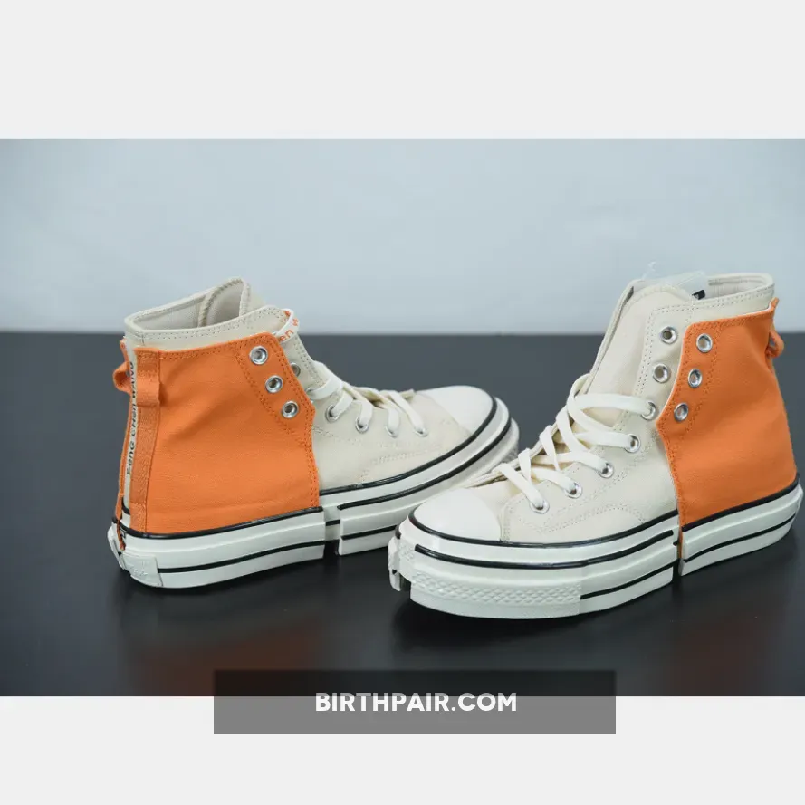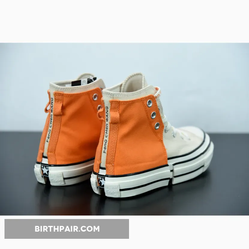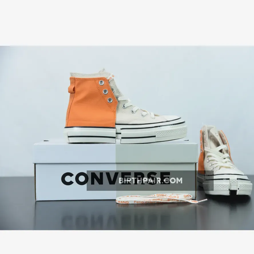 The Feng Chen Wang x Converse Chuck 70 High 2-in-1 Orange is one of two Chuck Taylor models releasing as part of Converse’s latest collaboration with Chinese designer Feng Chen Wang. The sneaker is a unique and high end take on the classic silhouette and the creative community are already eager to get their hands on a pair. Read on for a release date, a closer look and official images. They were first debuted at the designer’s New York Fashion Week show and have since been highly anticipated. The outer layer is crafted from durable canvas and leather, with classic Chuck Taylor characteristics still present. Branding features at the heel in the form of Converse’s star logo and Feng Chen Wang’s typeface logo, along with branded laces for a premium look. Underfoot, the Chuck Taylor All Star is reimagined with a chunky rear heel component similar to a concept shoe, making this one of the wildest high-top sneakers we’ve seen in a while.