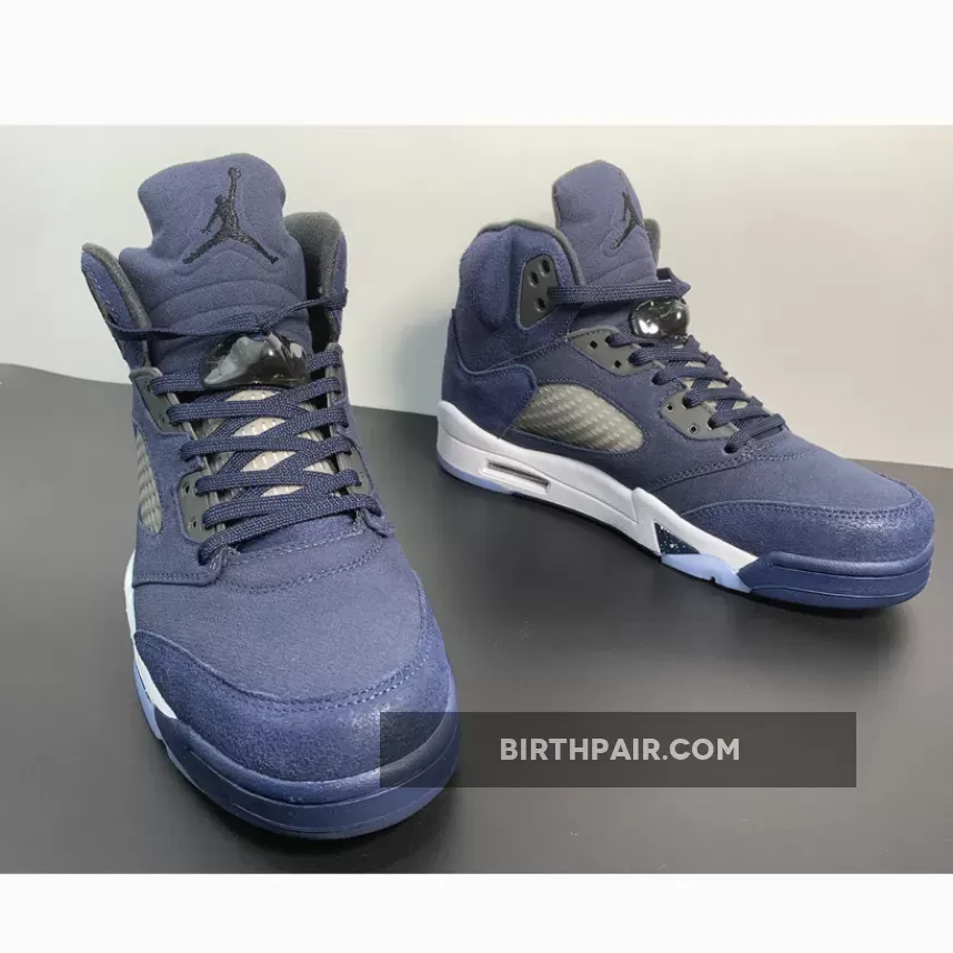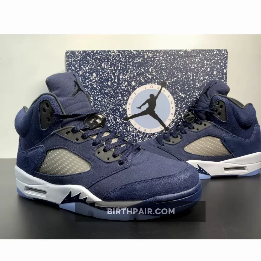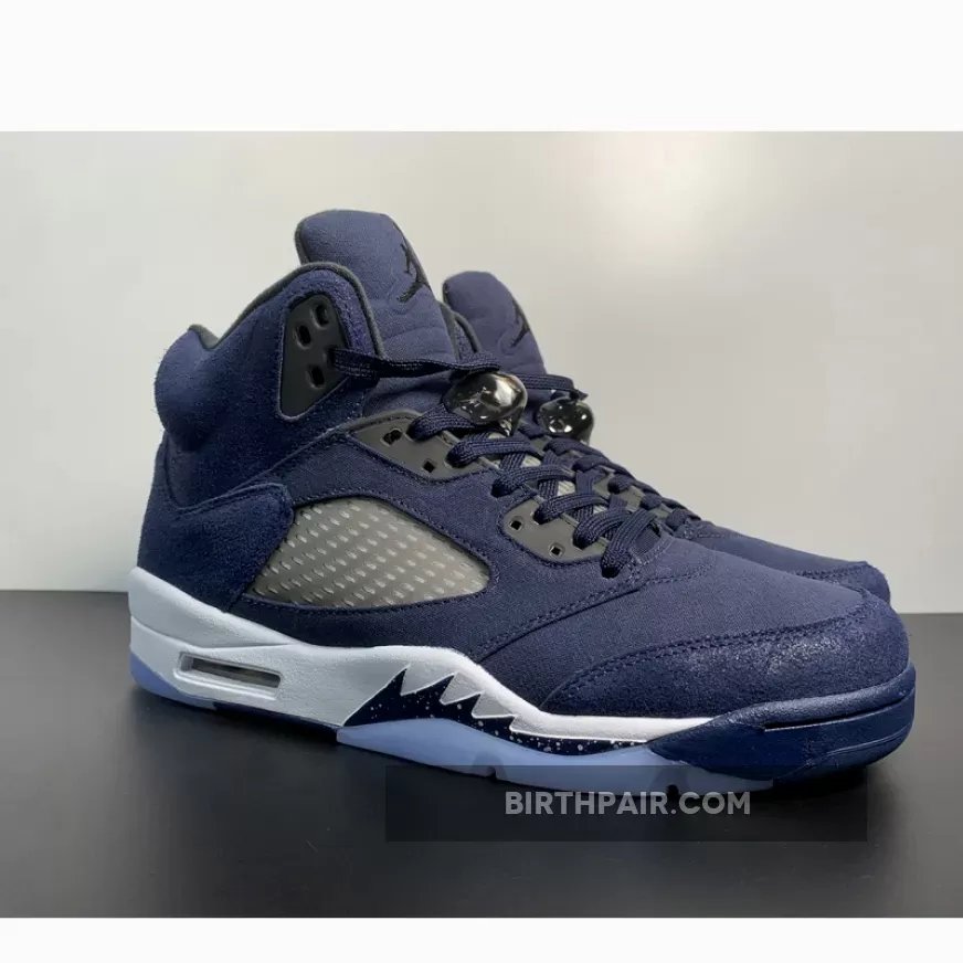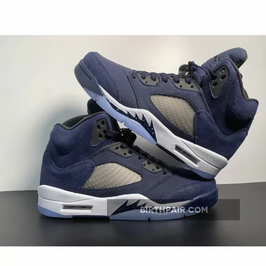 This Air Jordan 5 Georgetown come dressed in a Midnight Navy, Black, and Football Grey color scheme. The titular hue is predominantly featured throughout, giving off a “Fear” Jordan 5 vibe. Other details include Black eyelets and inner lining, Jumpman logos on the tongues and heels and the signature translucent side netting and branded lace locks.as well as the white midsole, speckled shark teeth overlays, and icy translucent outsole. the dark blue color blocking retains its connection to Georgetown University as grey hues envelop the mid-foot window in closing.