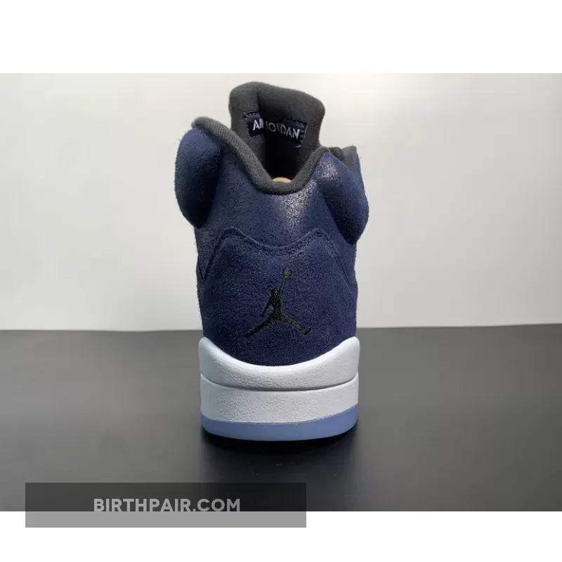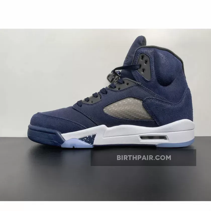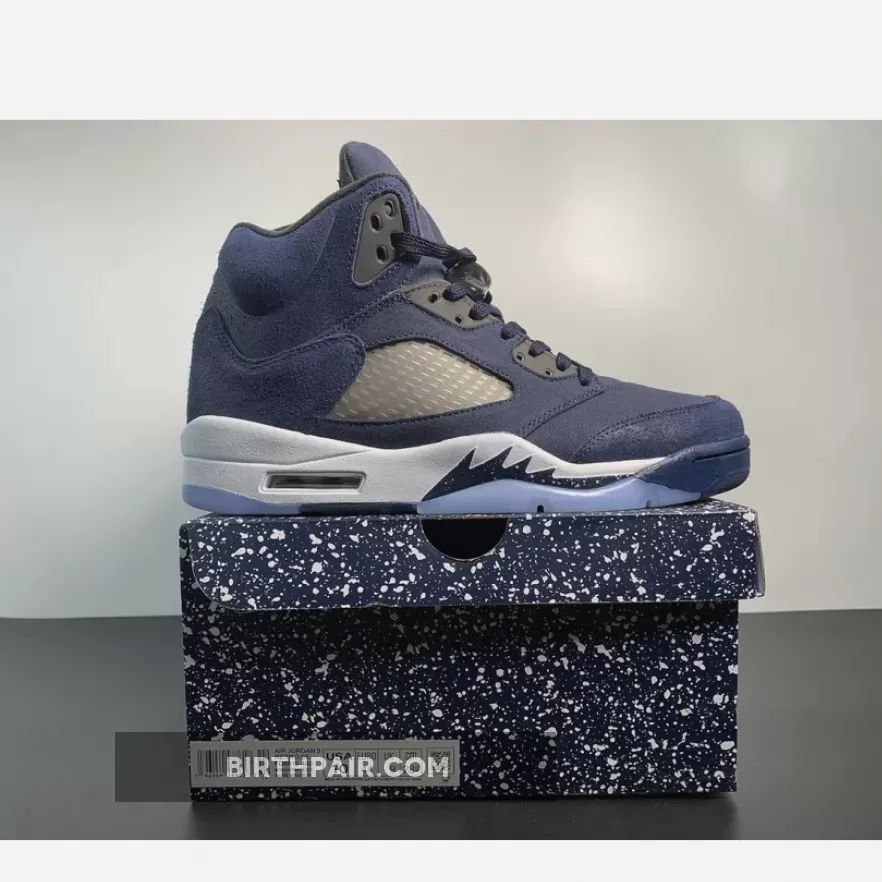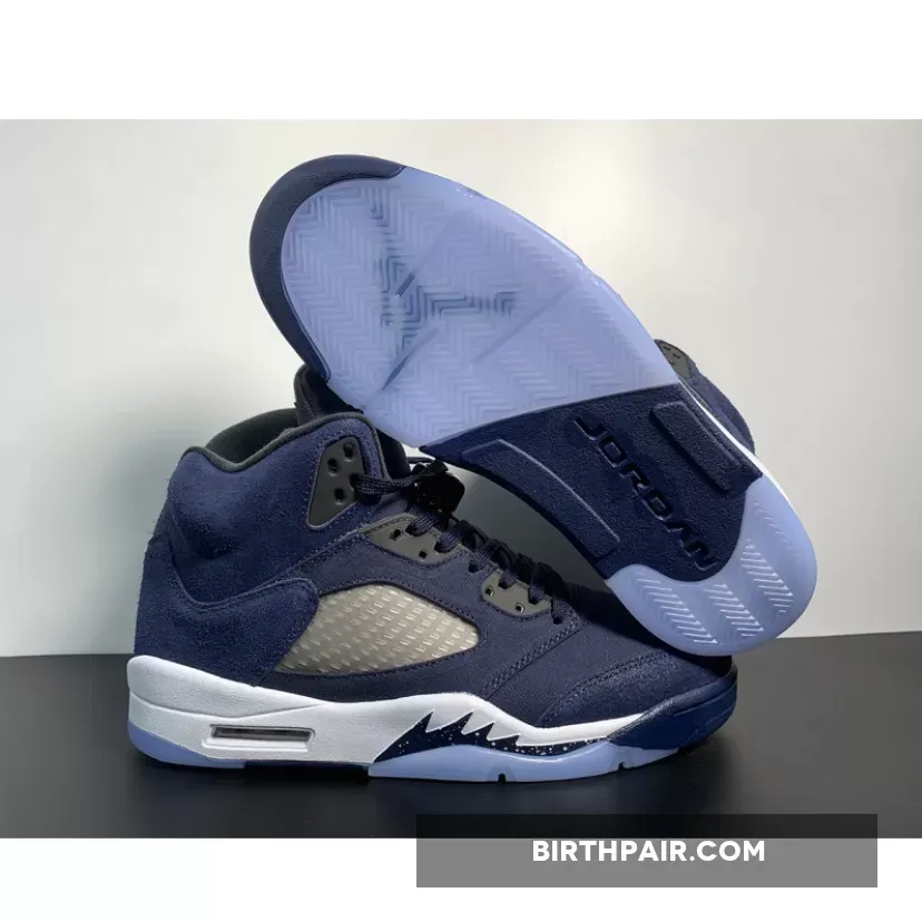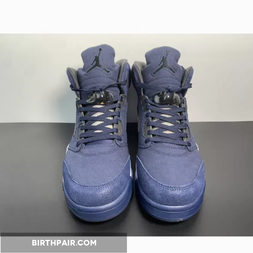 This Air Jordan 5 Georgetown come dressed in a Midnight Navy, Black, and Football Grey color scheme. The titular hue is predominantly featured throughout, giving off a “Fear” Jordan 5 vibe. Other details include Black eyelets and inner lining, Jumpman logos on the tongues and heels and the signature translucent side netting and branded lace locks.as well as the white midsole, speckled shark teeth overlays, and icy translucent outsole. the dark blue color blocking retains its connection to Georgetown University as grey hues envelop the mid-foot window in closing.