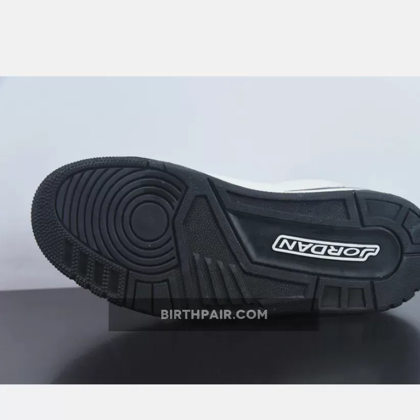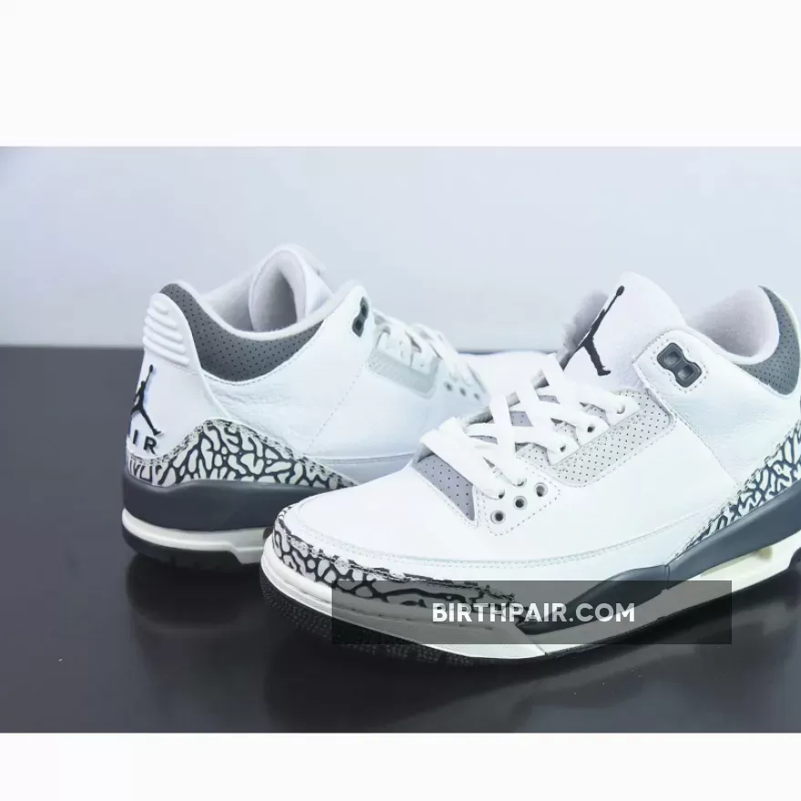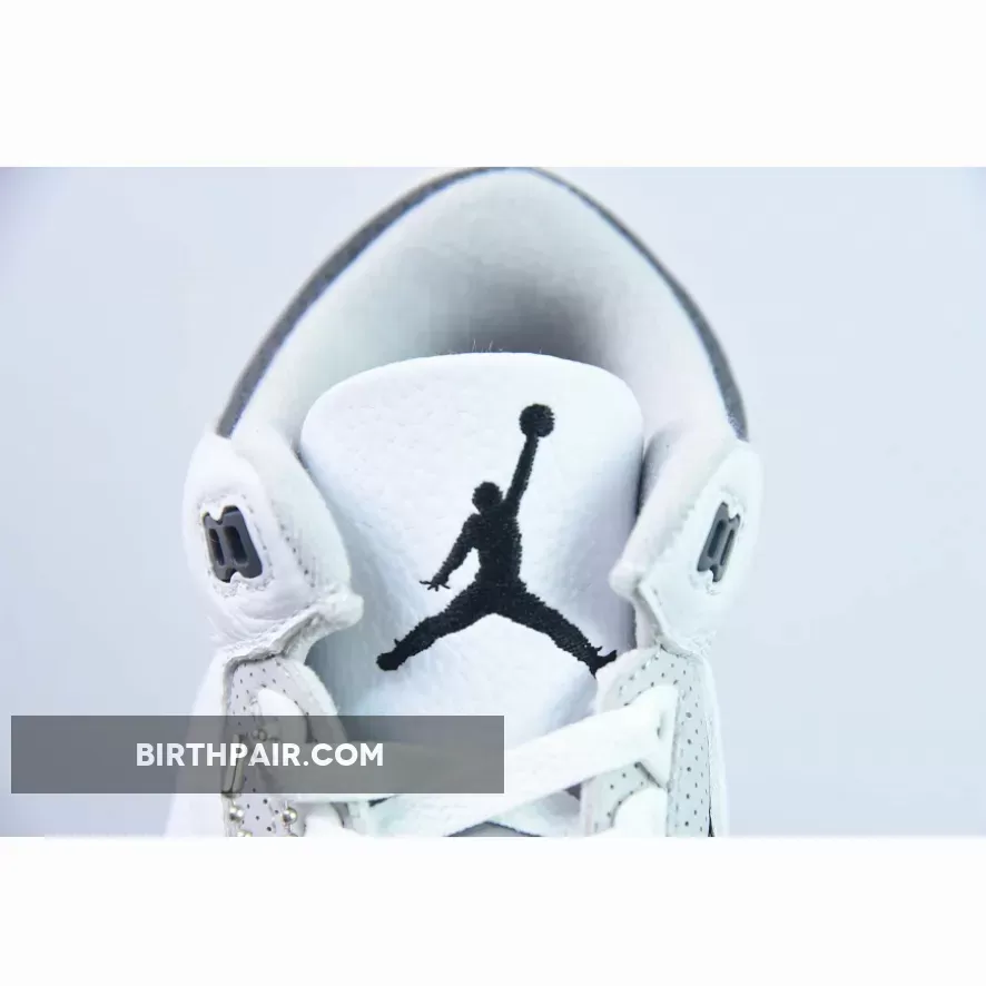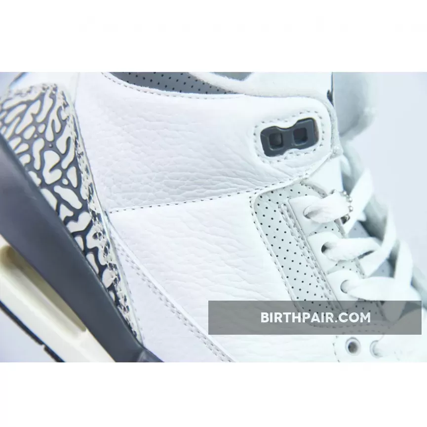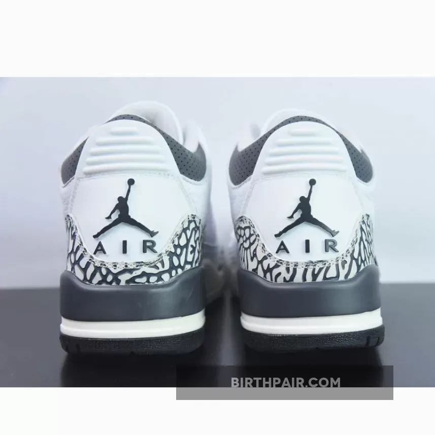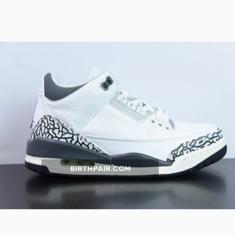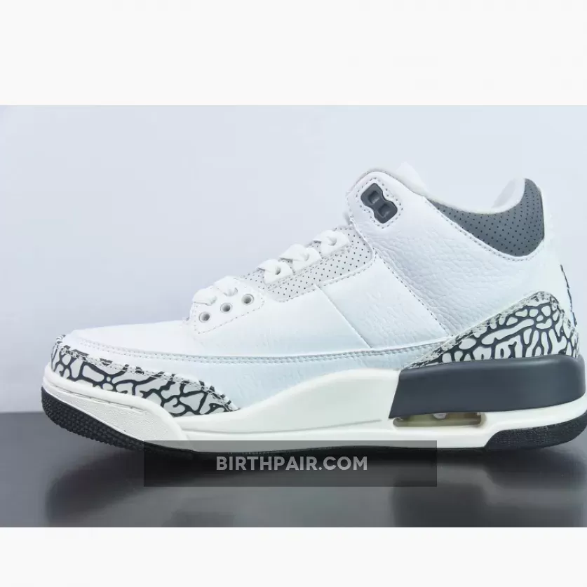 This smaller-sized AJ3 has a “White/ Black/ Iron/ Light Ash Grey/ Sail/ Cement Grey” colour palette. Most of this shoe’s upper is White, smooth leather on the first layer of the toe cap and mudguard and tumbled leather on the toe box, mid-panel and collar. The eye stay panel is perforated grey leather while the toe cap and heel counter overlays are in the signature AJ3 elephant print in Light Ash and Cement Grey. The underlay on the collar cutout is black perforated leather. The oversized white tongue features a contrasting black embroidered Jumpman.