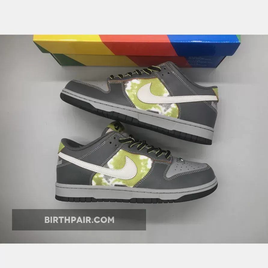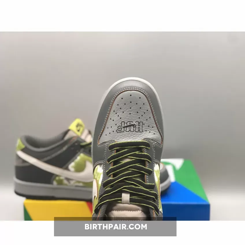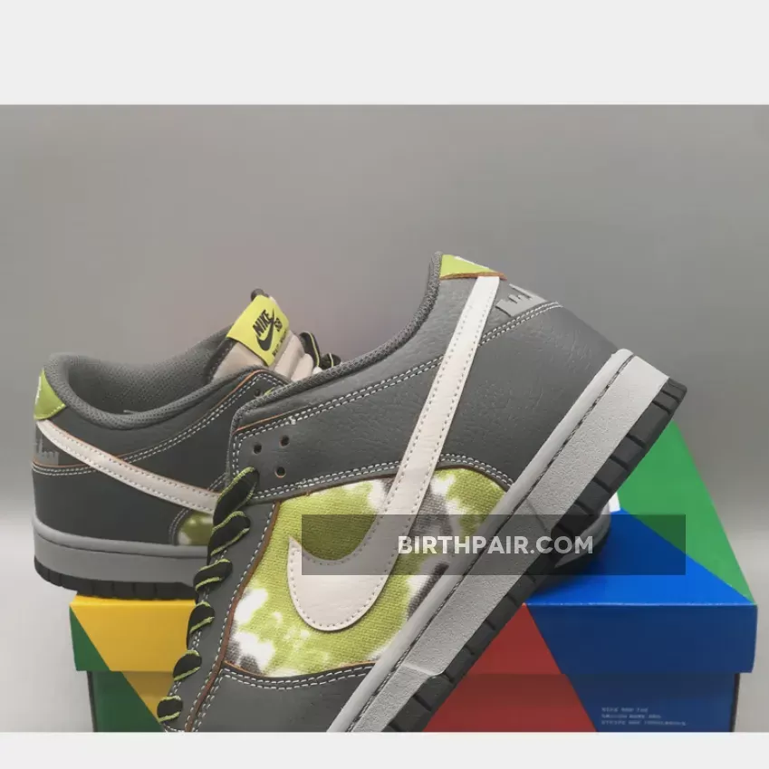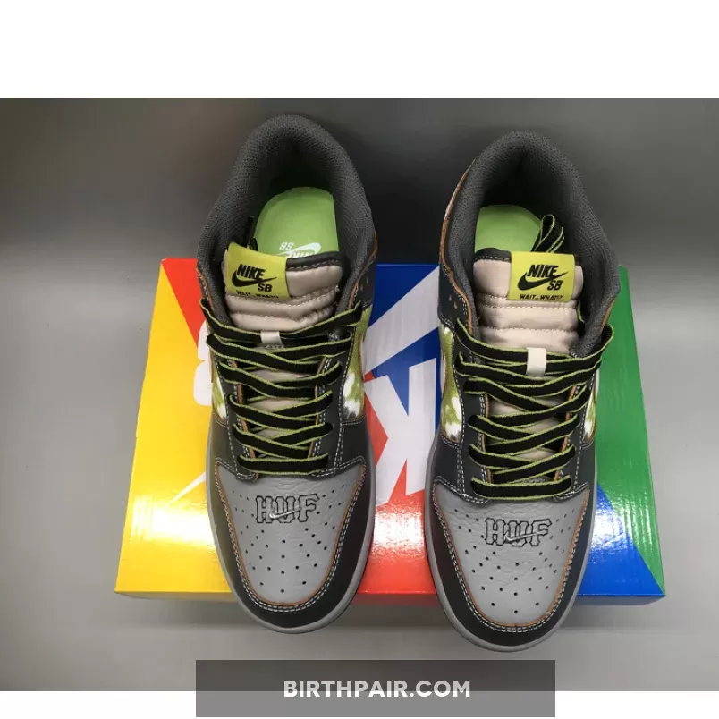 The sneaker takes after two of HUF’s previous collabs with Nike, the Air Max 1 and the SB Dunk High. The grey and green colorway takes after the AM 1, with the tie-dye quarter panel taking after the SB Dunk High. On the tongue reads “Wait…What?”, while the same branding via the SF Giants-style type appears on the heel and tongue.