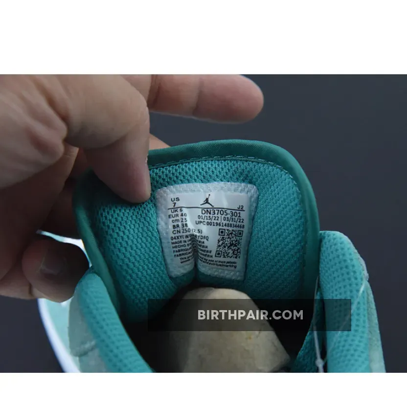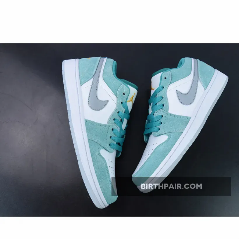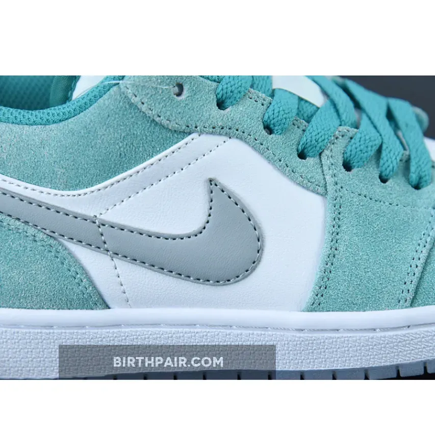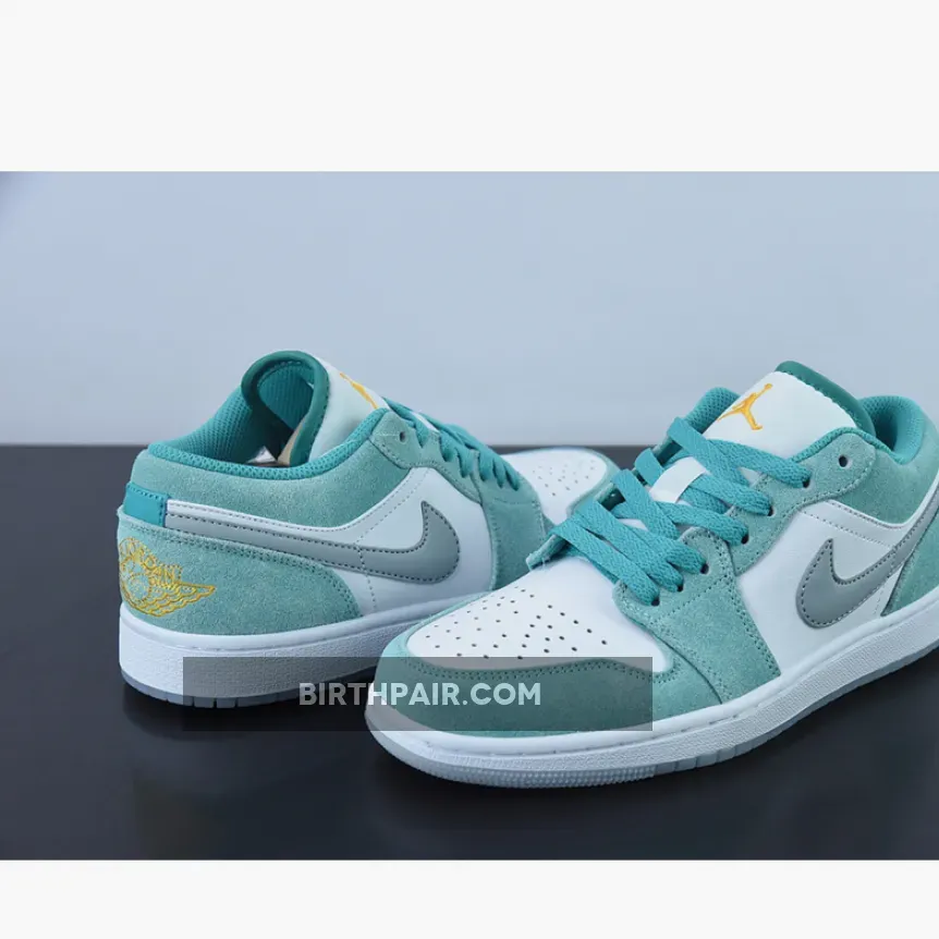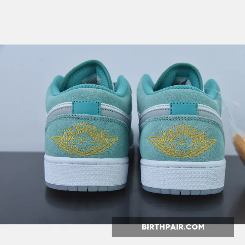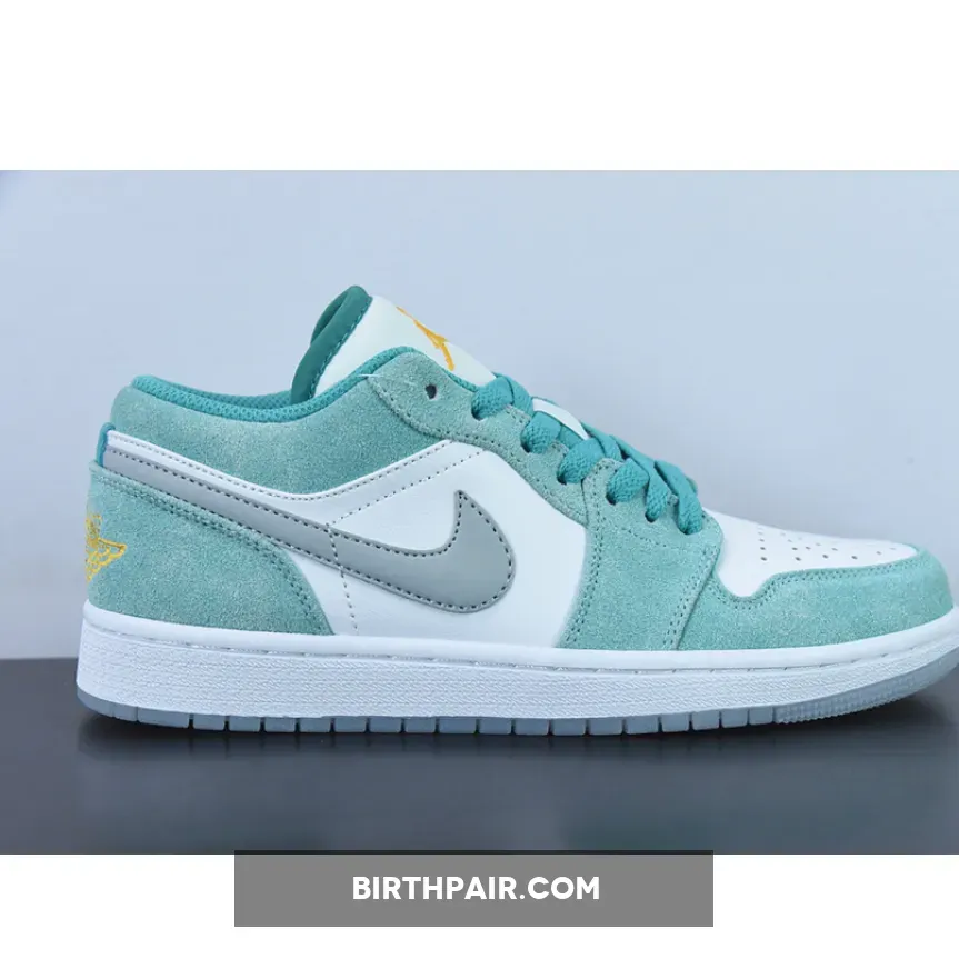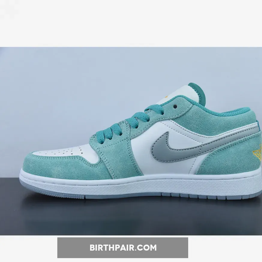 The Tinker Hatfield-designed Air Jordan 1 Low has a cool jewel-toned colourway, the Air Jordan 1 Low New Emerald. This AJ1 Low has a “New Emerald/ White/ Light Steel Grey” colour palette. This shoe has a white smooth leather base with brushed suede overlays in the titular Emerald Green. At certain angles, the sheen of the overlays gives the sneaker a bejewelled quality. The signature profile Swooshes on both sides of the shoe are in Light Steel Grey.