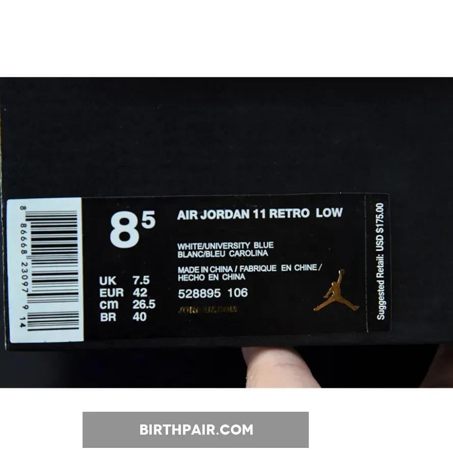Solid color scheme on the Air Jordan 11 Low UNC. Love the translucent outsole. Shipping was fast, definitely recommend!