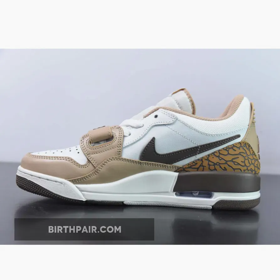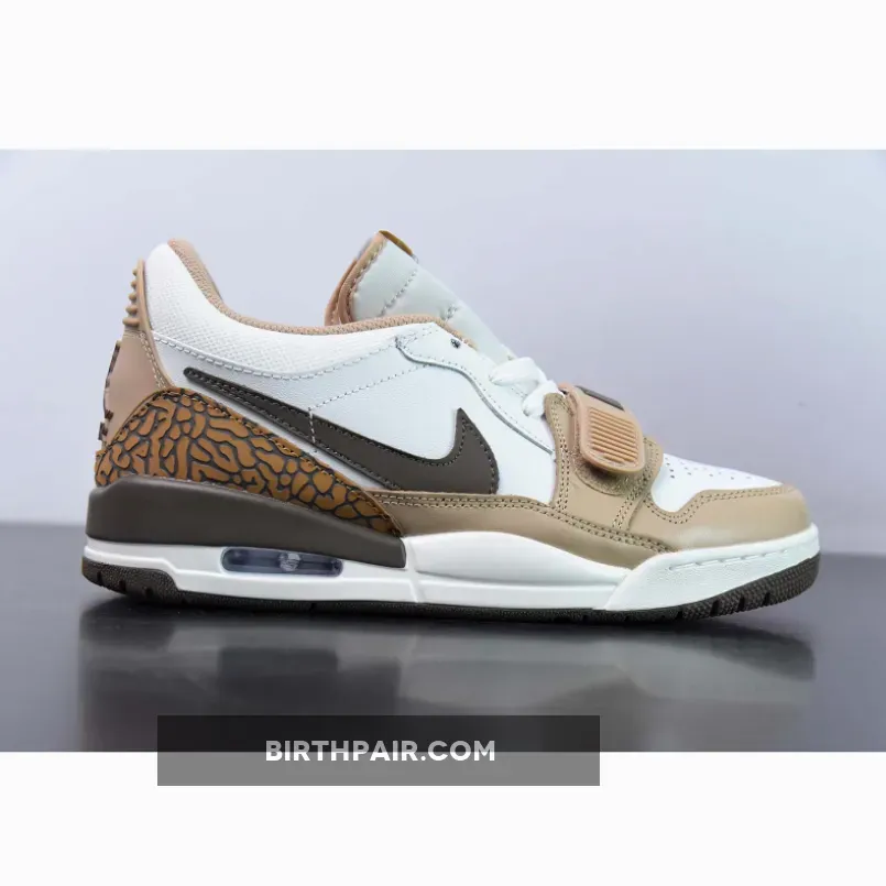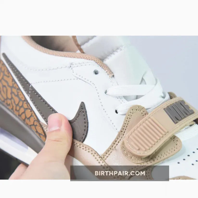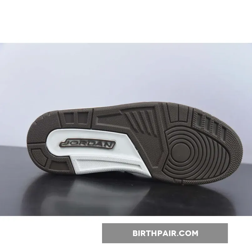 Light Cocoa hues determine the smooth leather mudguard and forefoot strap while balancing the Air Jordan 3-inspired heel tab from opposite ends.