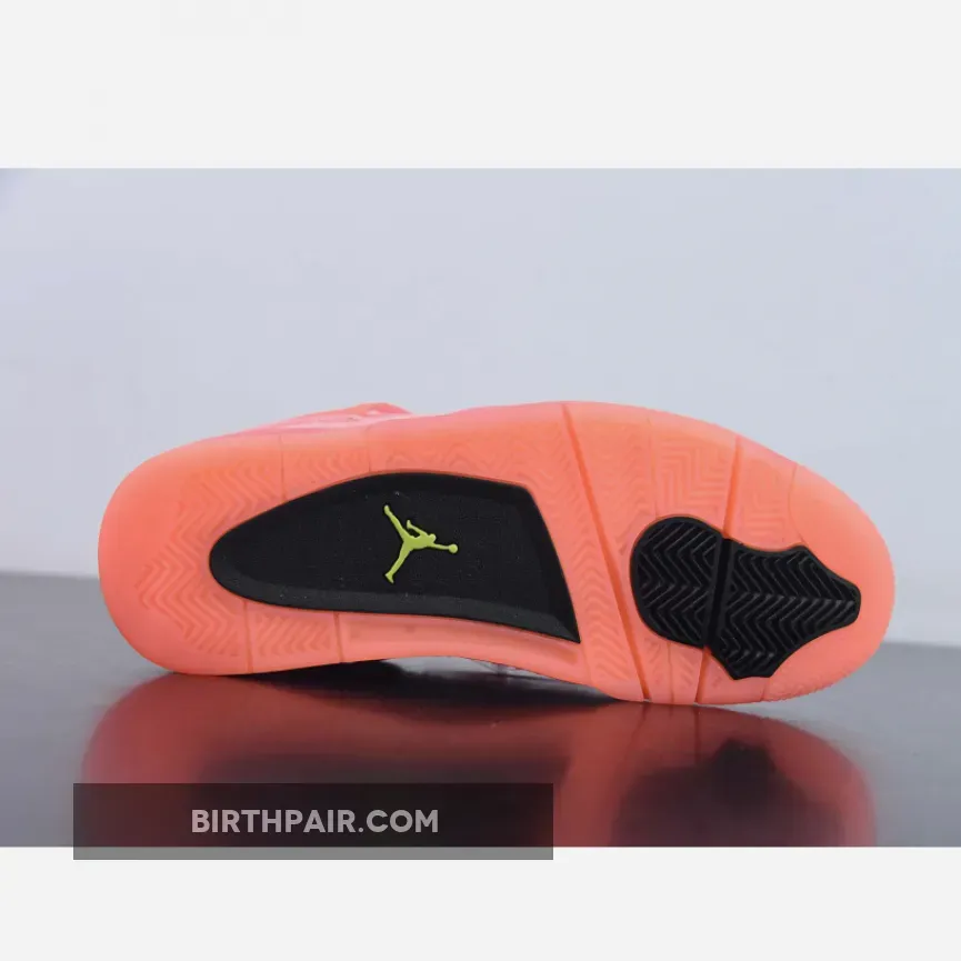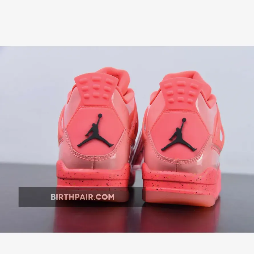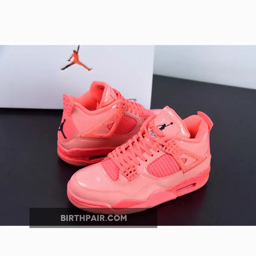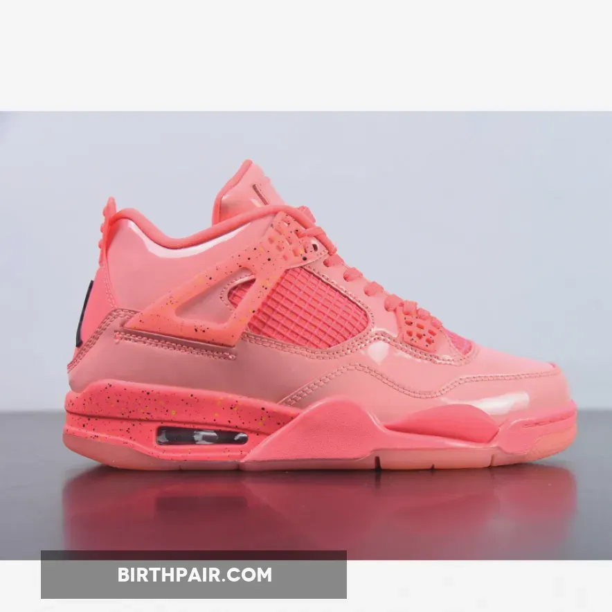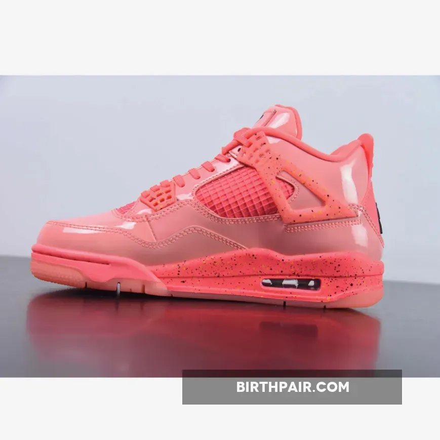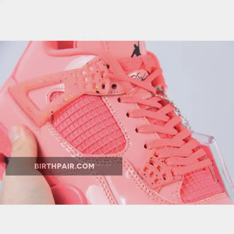 Dressed in a Hot Punch, Black, and Volt color scheme. This Air Jordan 4 features a Pink patent leather upper contrasting with Black detailing throughout.