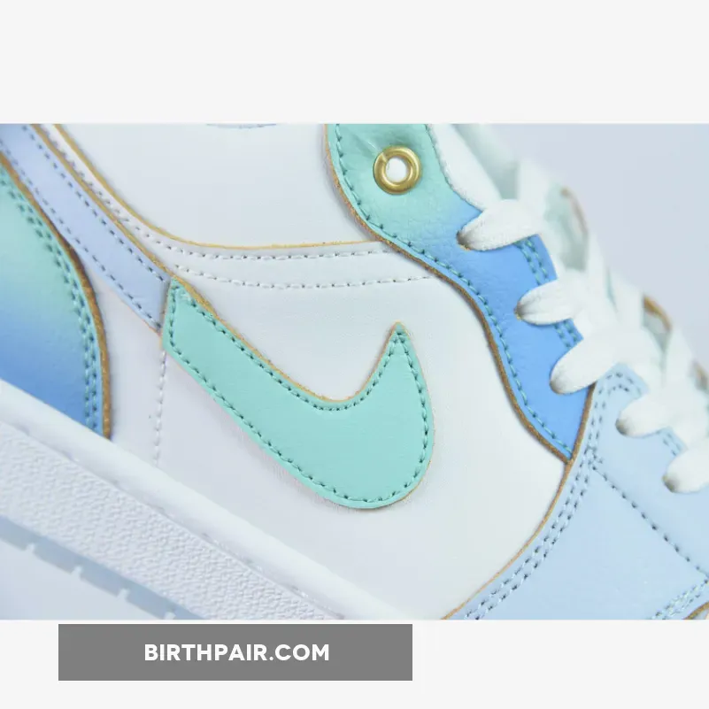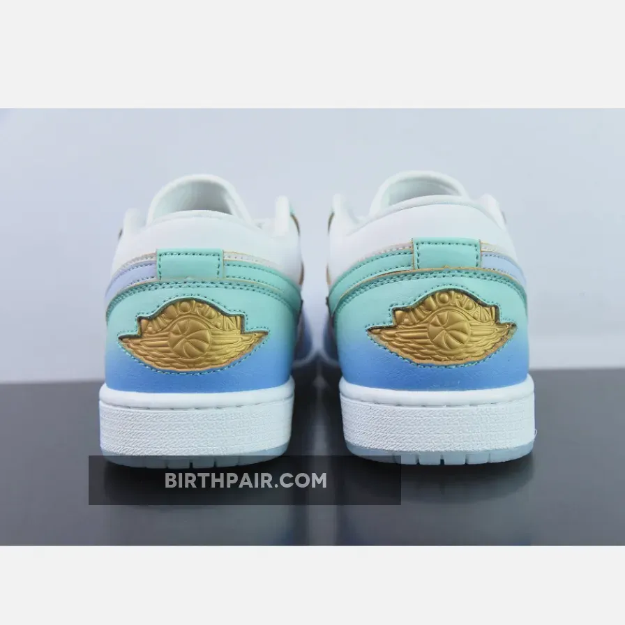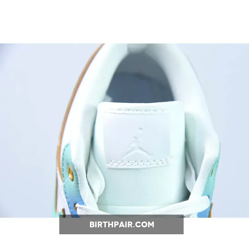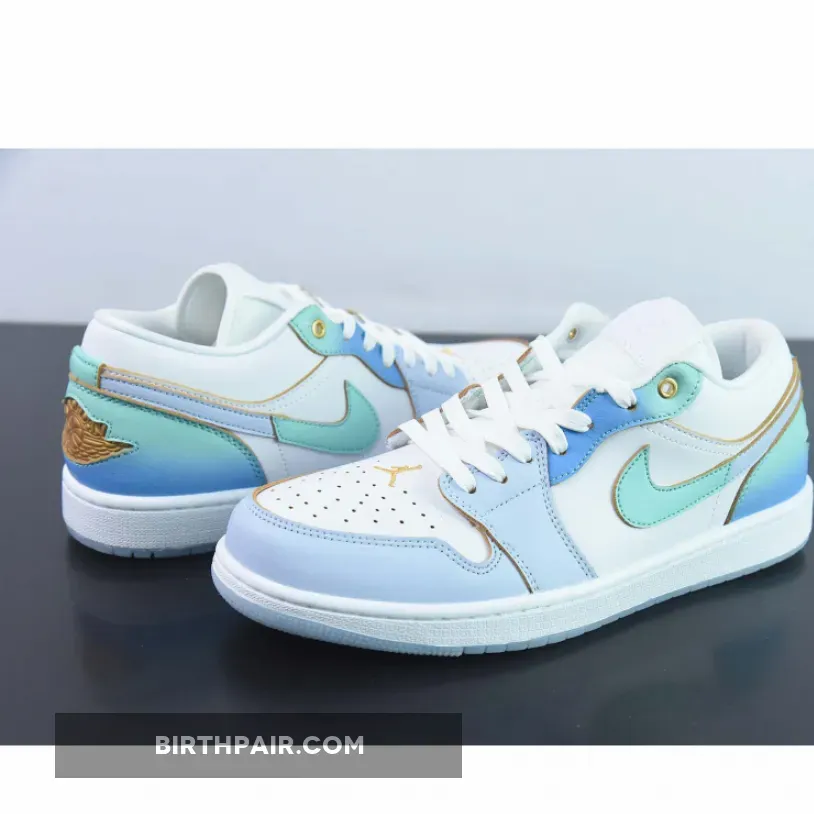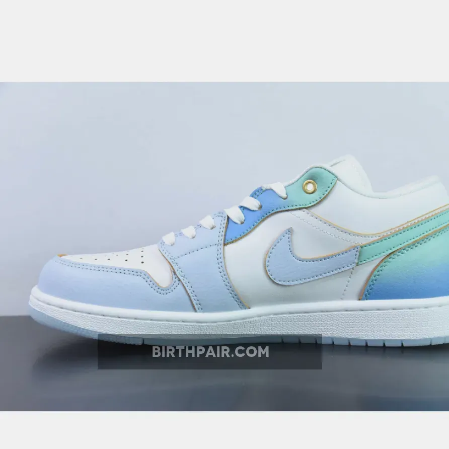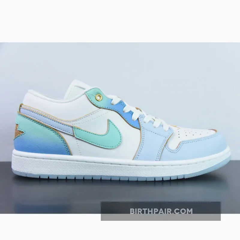 the Air Jordan 1 Low comes dressed in a White, Emerald Rise, Football Grey, Ice Blue, and University Blue color scheme. The sneaker blends smooth and tumbled leather materials, along with mesh tongues and a soft sockliner. The base has a “White” leather exterior paired with tumbled leather overlays. The eyestay and heel counter are painted with a gradient finish that fade from turquoise to mint.