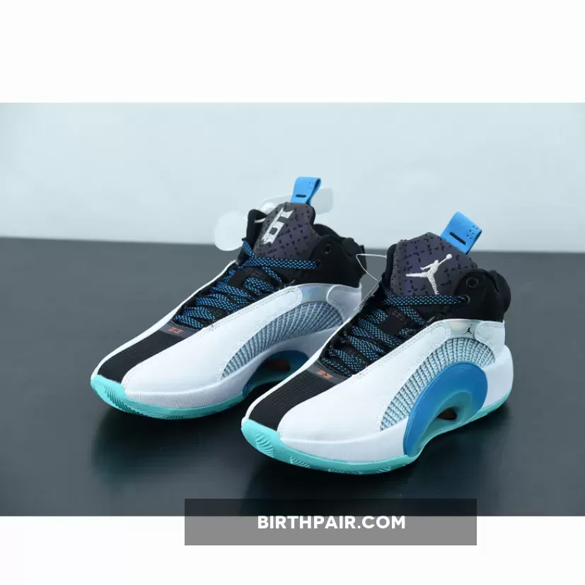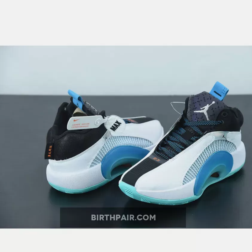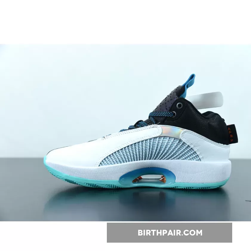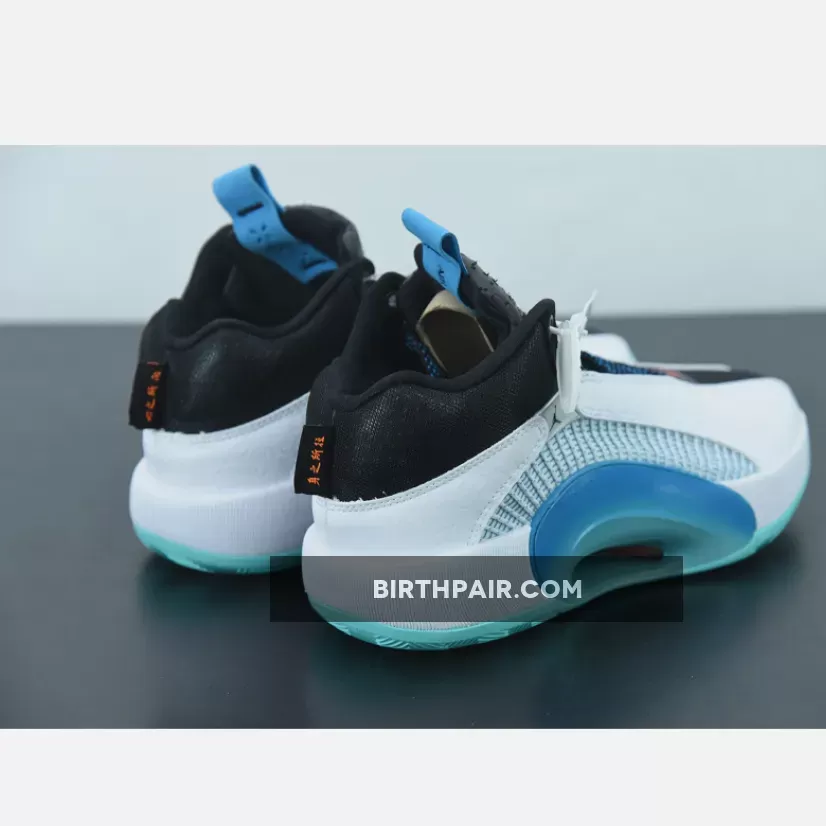 Going over this Air Jordan 35, it features both White and Black throughout the base. Next, we have Teal and Blue on the Eclipse plate, side panels, laces, tongue pull tab, and the rubber outsole. Guo Ailun’s logo adorns the right tongue while a Jumpman logo lands on the left. Following, the heel tag features Chinese characters in Red while more Red lands on some of the branding. Lastly, a unique graphic covers the insoles.