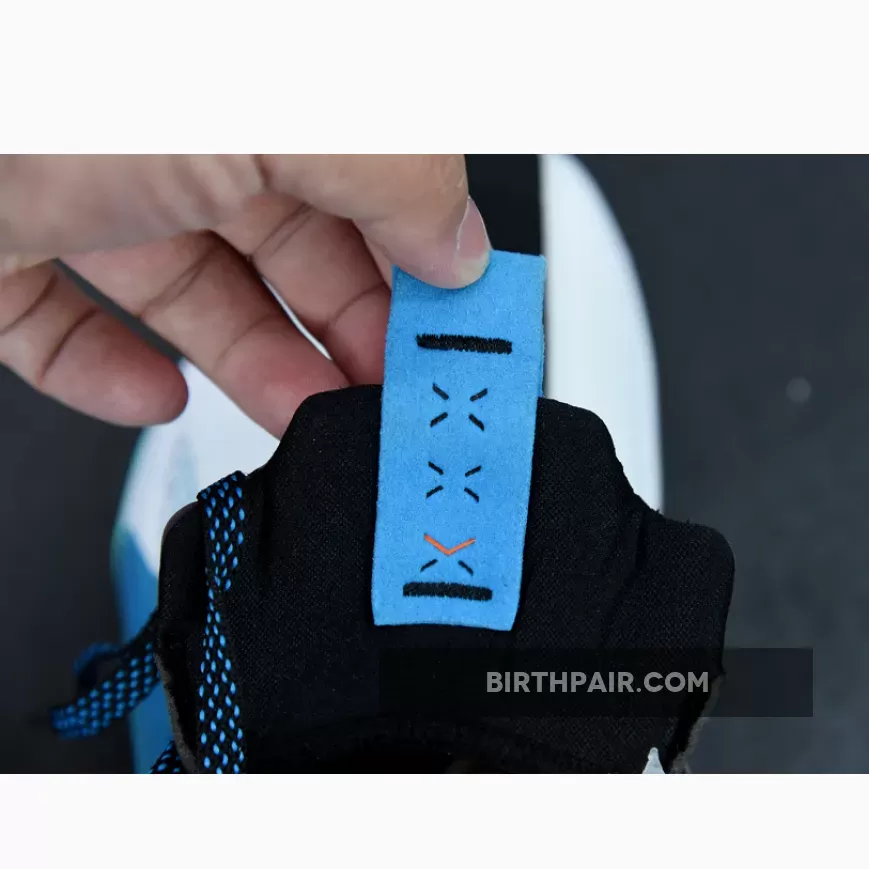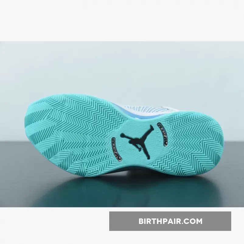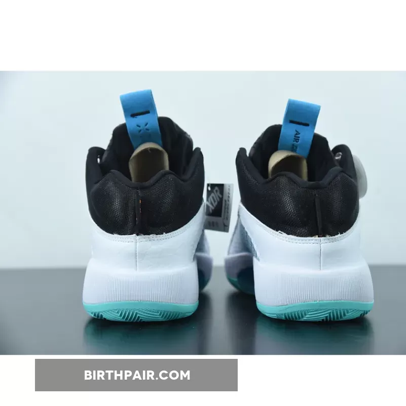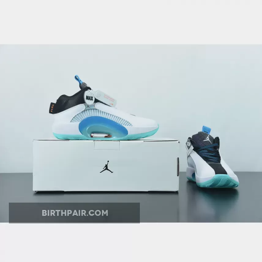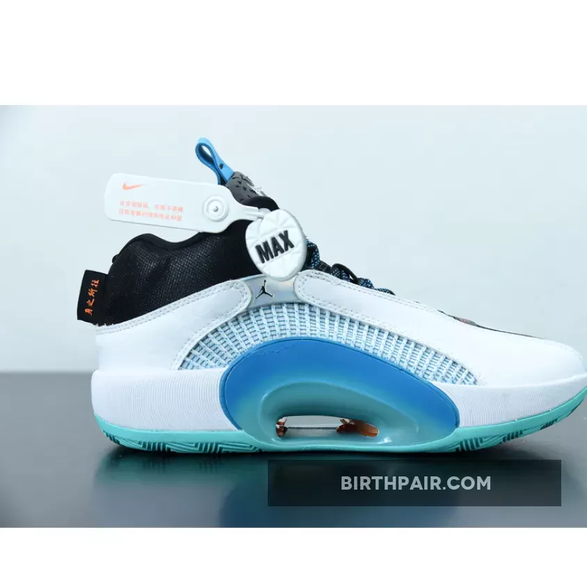 Going over this Air Jordan 35, it features both White and Black throughout the base. Next, we have Teal and Blue on the Eclipse plate, side panels, laces, tongue pull tab, and the rubber outsole. Guo Ailun’s logo adorns the right tongue while a Jumpman logo lands on the left. Following, the heel tag features Chinese characters in Red while more Red lands on some of the branding. Lastly, a unique graphic covers the insoles.