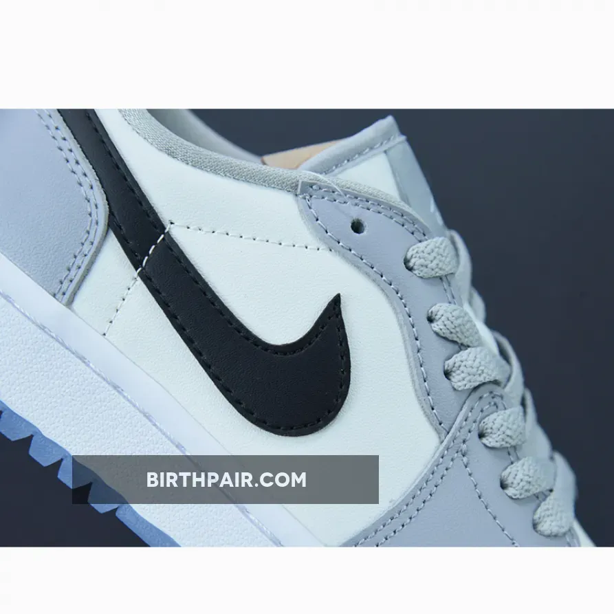 The golf sneaker uses light grey leather on the base of the upper with Wolf Grey on the tongue and overlays throughout. The Swoosh is seen in black, which is giving of Air Jordan 1 Di vibes.