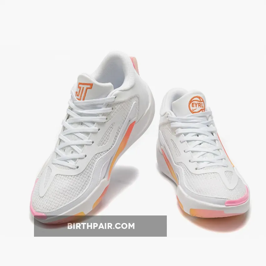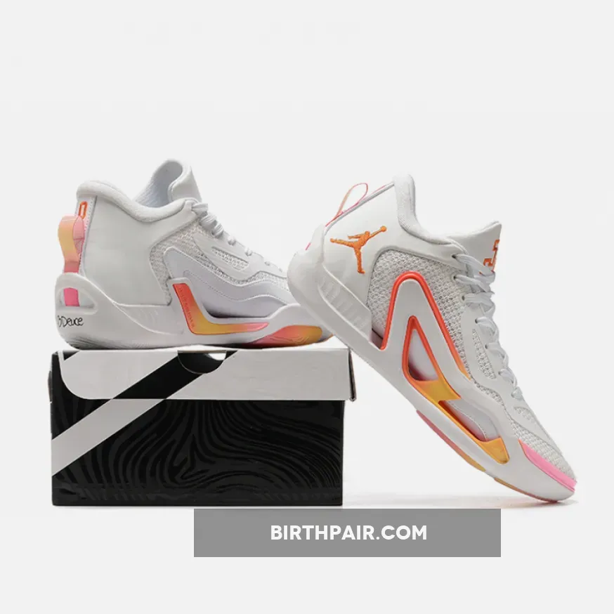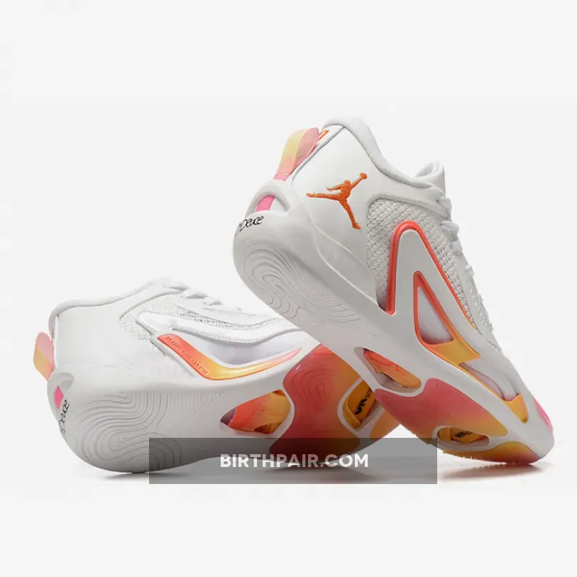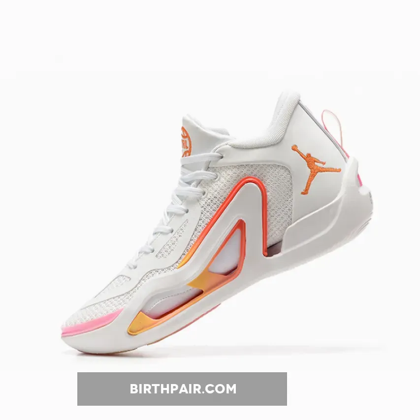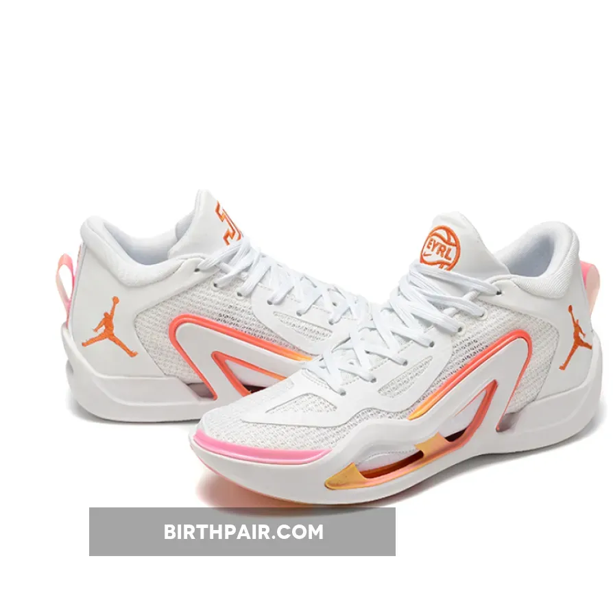 this EYBL-themed pair comes primarily in a white color scheme. These logos, along with the heel’s Jumpman logo and Tatum’s number 0, receive hits of pink.