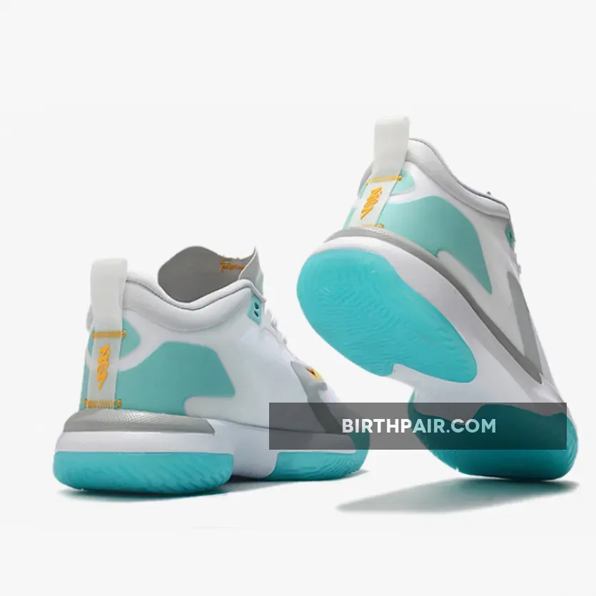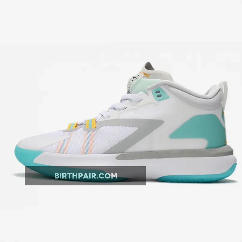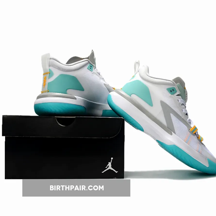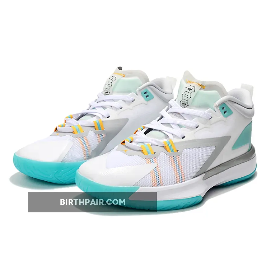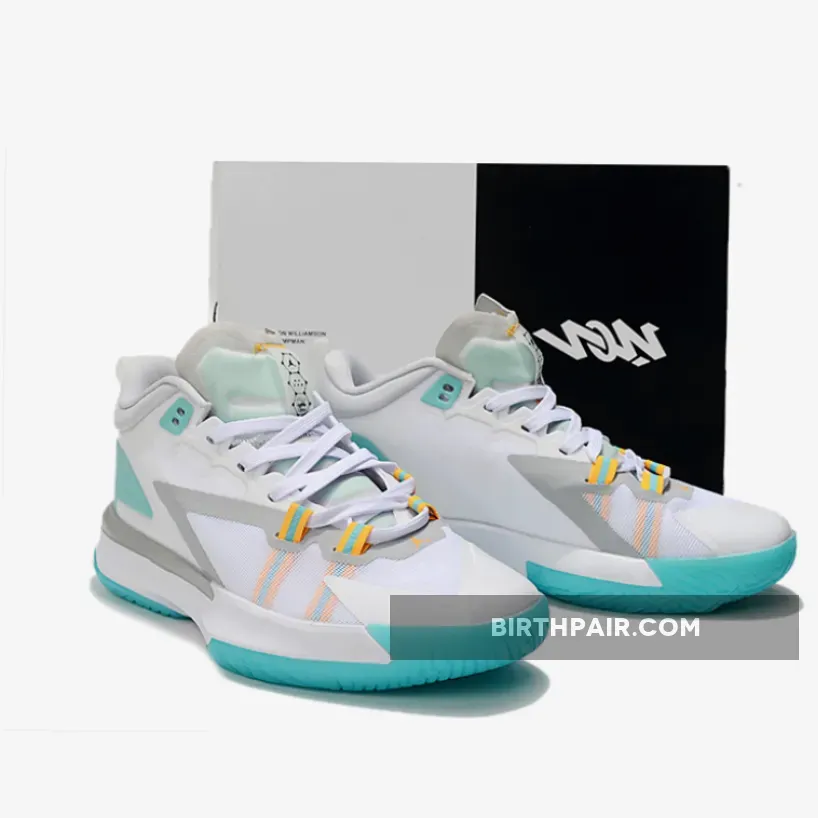 This spring/summer-inspired colorway of the Jordan Zion 1 gets covered in white on the majority of the upper with hits of grey, orange, and teal placed throughout the upper, branding, midsole, and outsole to finish off the design.