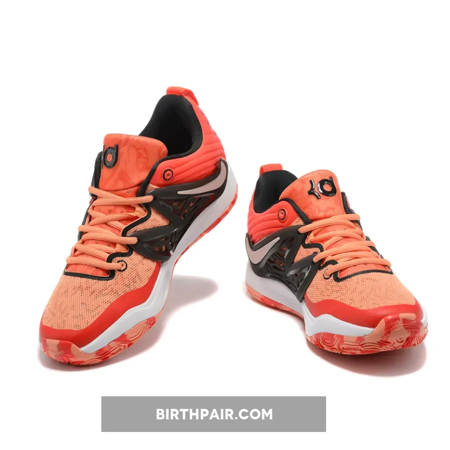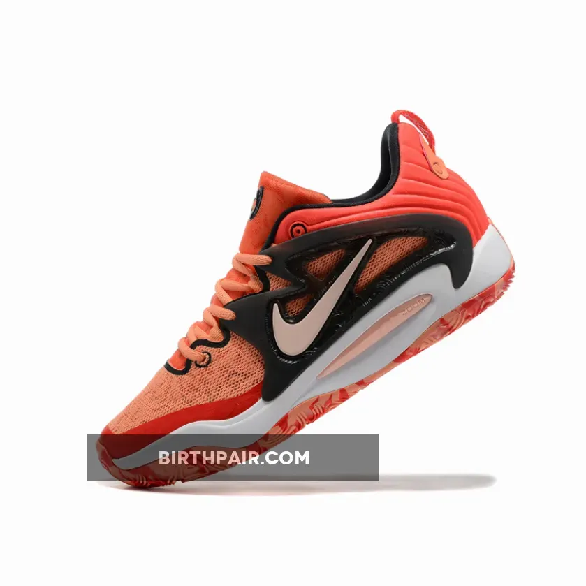 The upper on this Nike KD 15 is made with a soft, breathable mesh in a shade of coral pink. The base is accented with a tinted TPU overlay that acts as the foundation for the signature Nike Swoosh. The Swoosh appears in soft pink which matches the Air Zoom badge on the white midsole. Towards the rear, the sneaker has a soft waved exterior. KD branding appears on the tongue and insole.