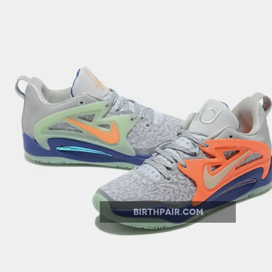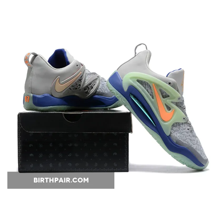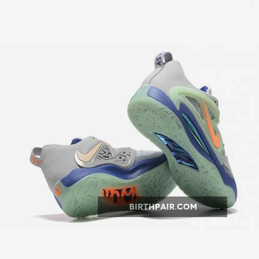 Cardo sticks to muted colors for the base of his collaborative offering, dressing the KD 15’s textile and suede in a light grey. Along the cage across the lateral, though, the pair features bright, alternating colors: on the left foot, the fixture embeds orange Swooshes into a light green panel, while the right flips the very same color combo. This duality is also echoed by way of the paisley-adorned insoles, the tongue’s embroidered logos, and the heel’s “EA$Y” and “07” markings.