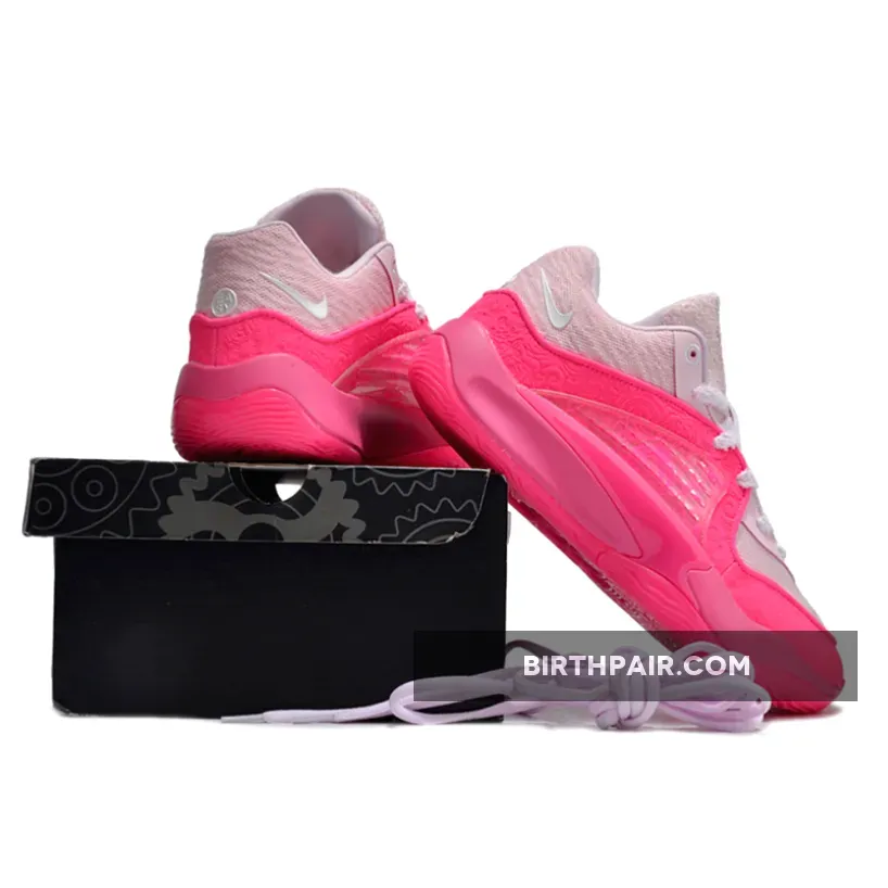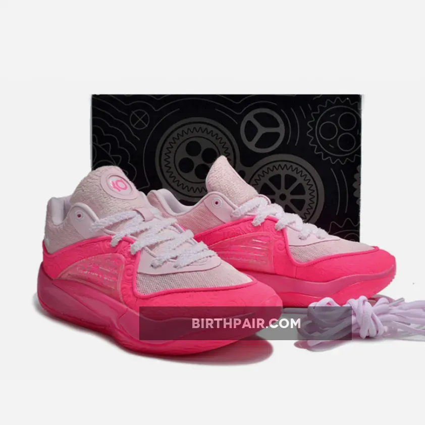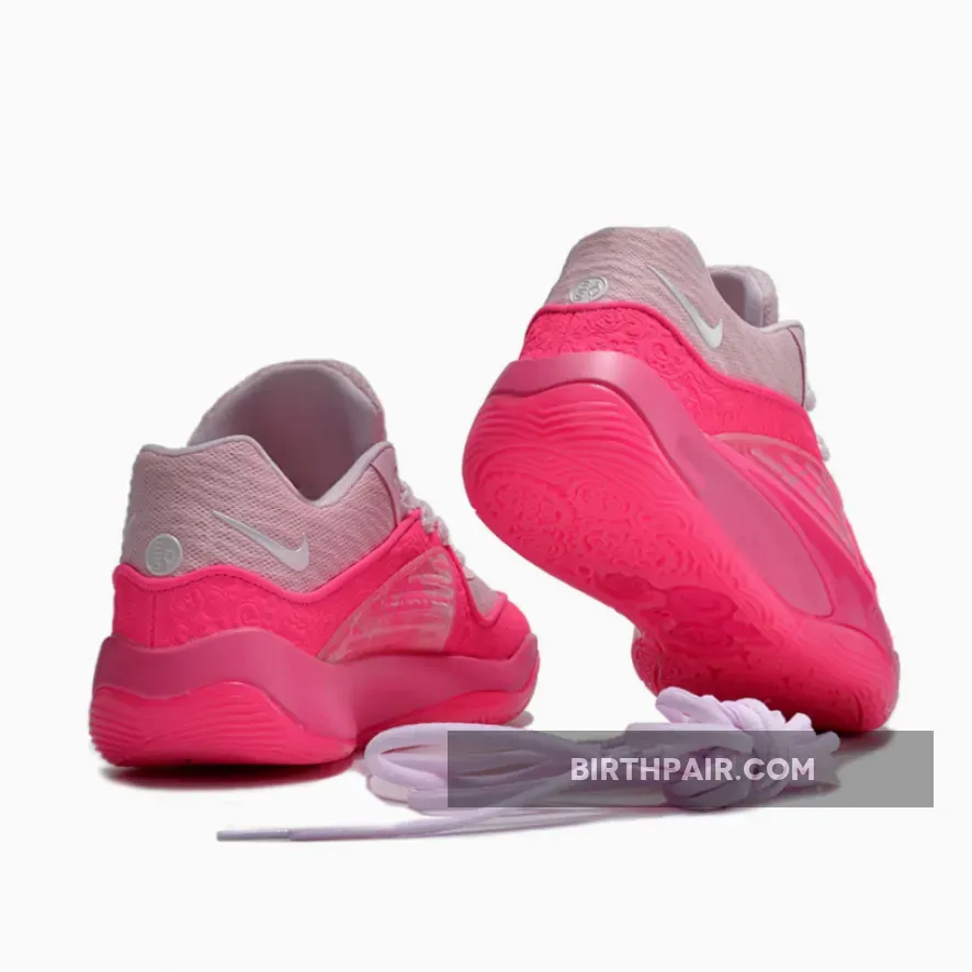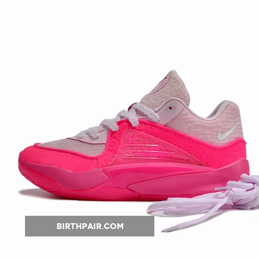 The Nike KD 16 Aunt Pearl is done in varying shades of Pink. Also, the upper is made of breathable mesh and features a floral pattern.