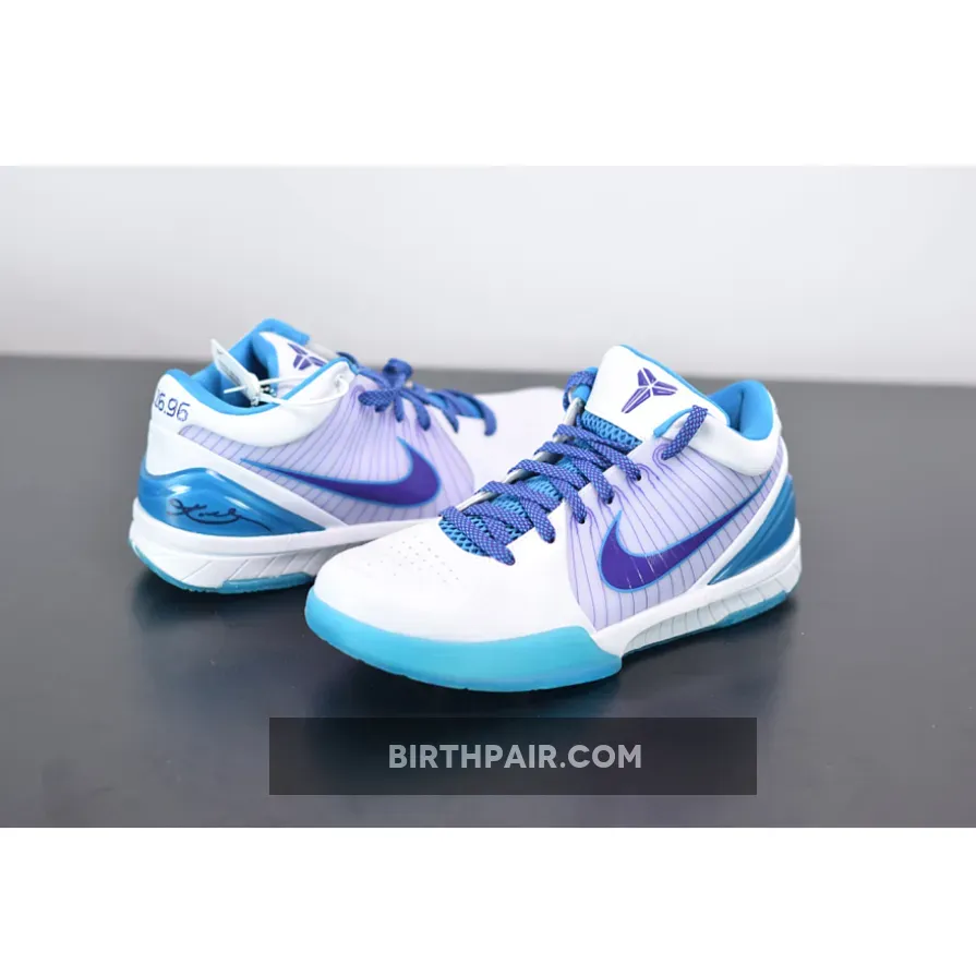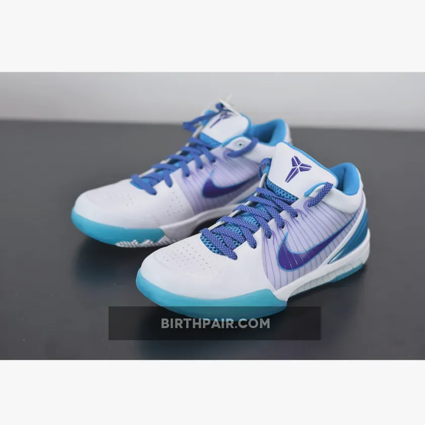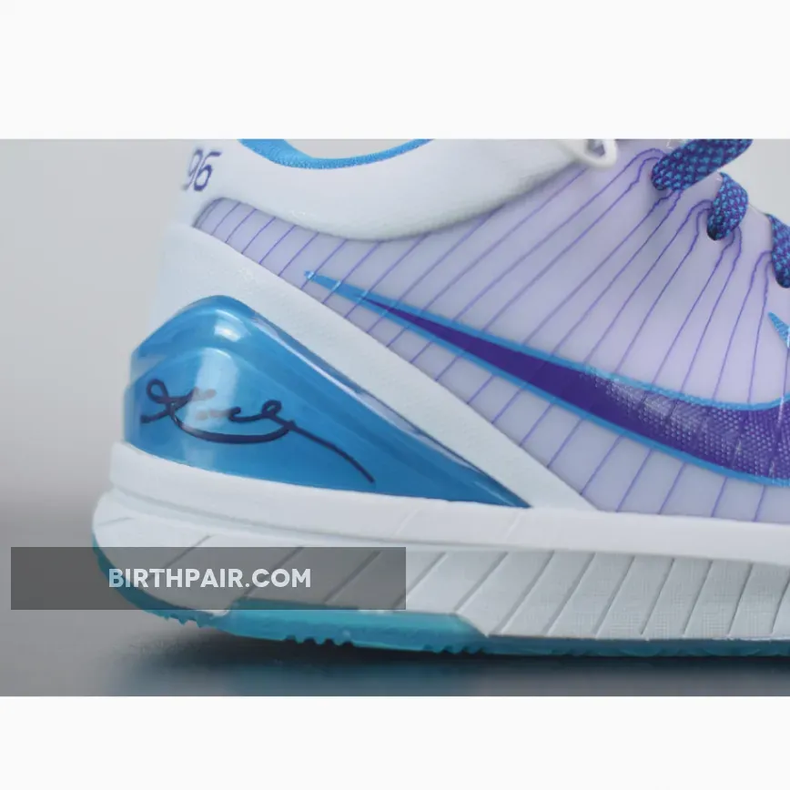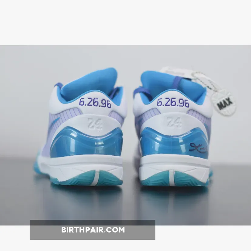 Dressed in a White, Orion Blue, and Varsity Purple color scheme. This Nike Kobe 4 Protro is expected to be the popular “Draft Day” colorway. The shoe features a White upper with Blue and Purple accents as a nod to Kobe Bryant originally being drafted by the Charlotte Hornets in 1996 before getting traded to the Los Angeles Lakers.