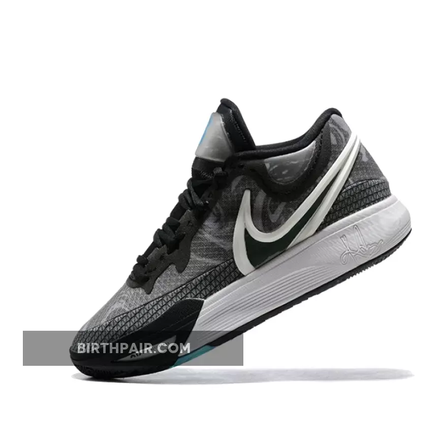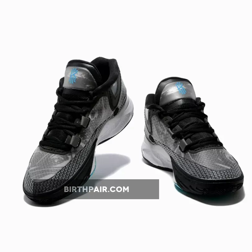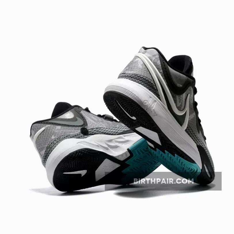 This Nike Kyrie 8 features a Black, Mercury Grey, White, and Light Menta color combination. Utilizing Light Grey with various patterns on the upper and two orcas swimming in a circle representing the yin and yang symbol on the right tongue (seen on the kid’s pair).