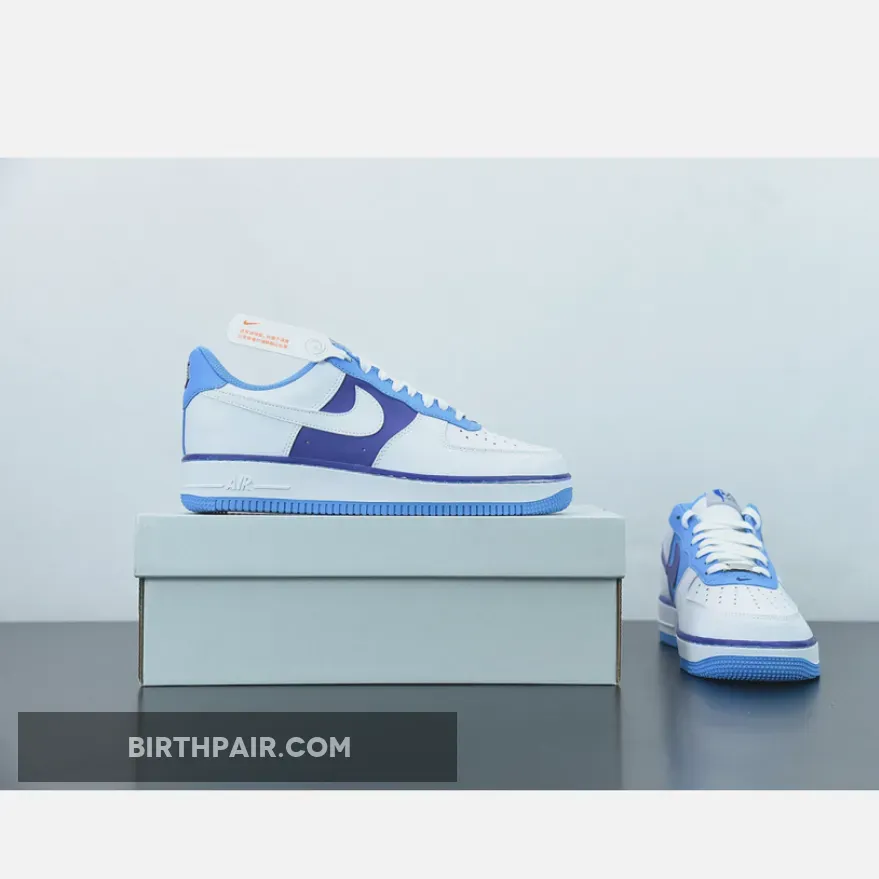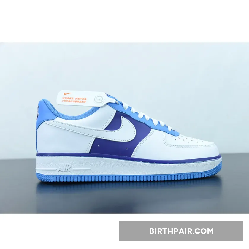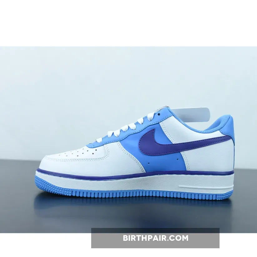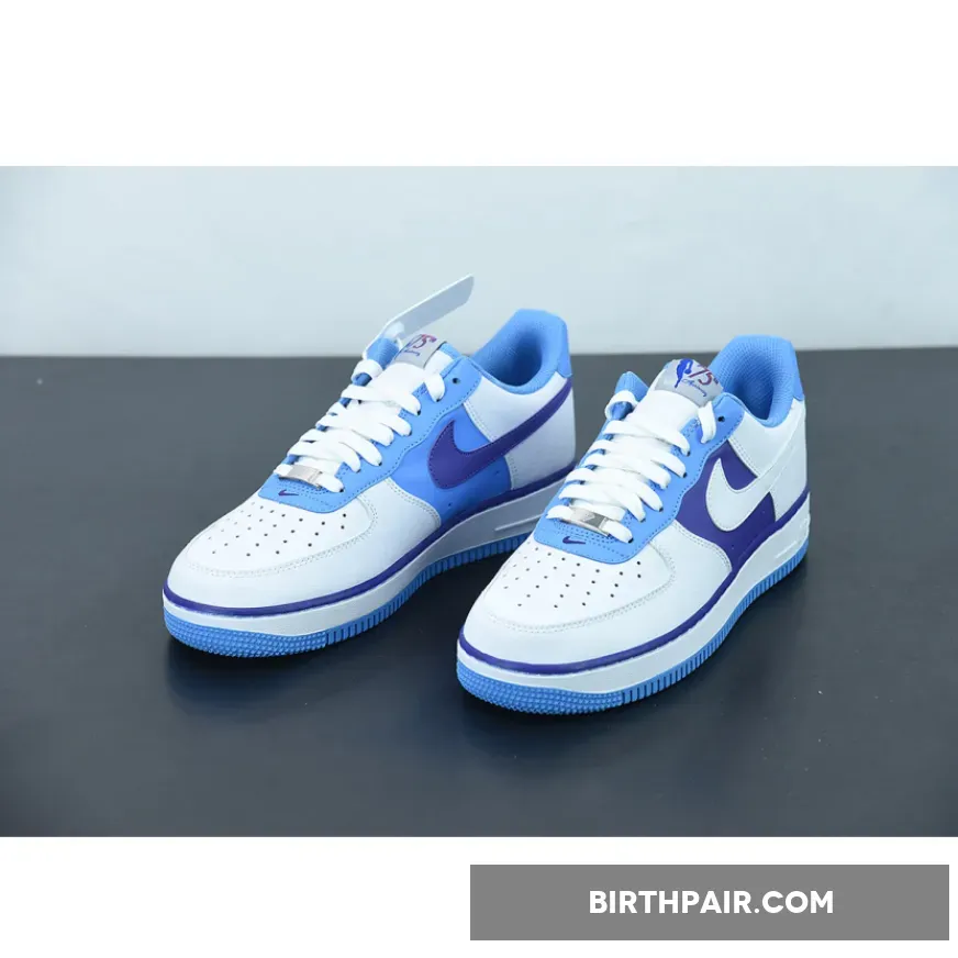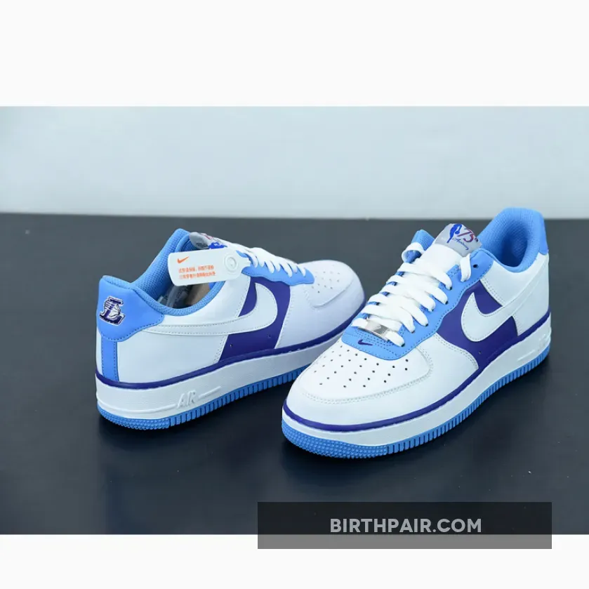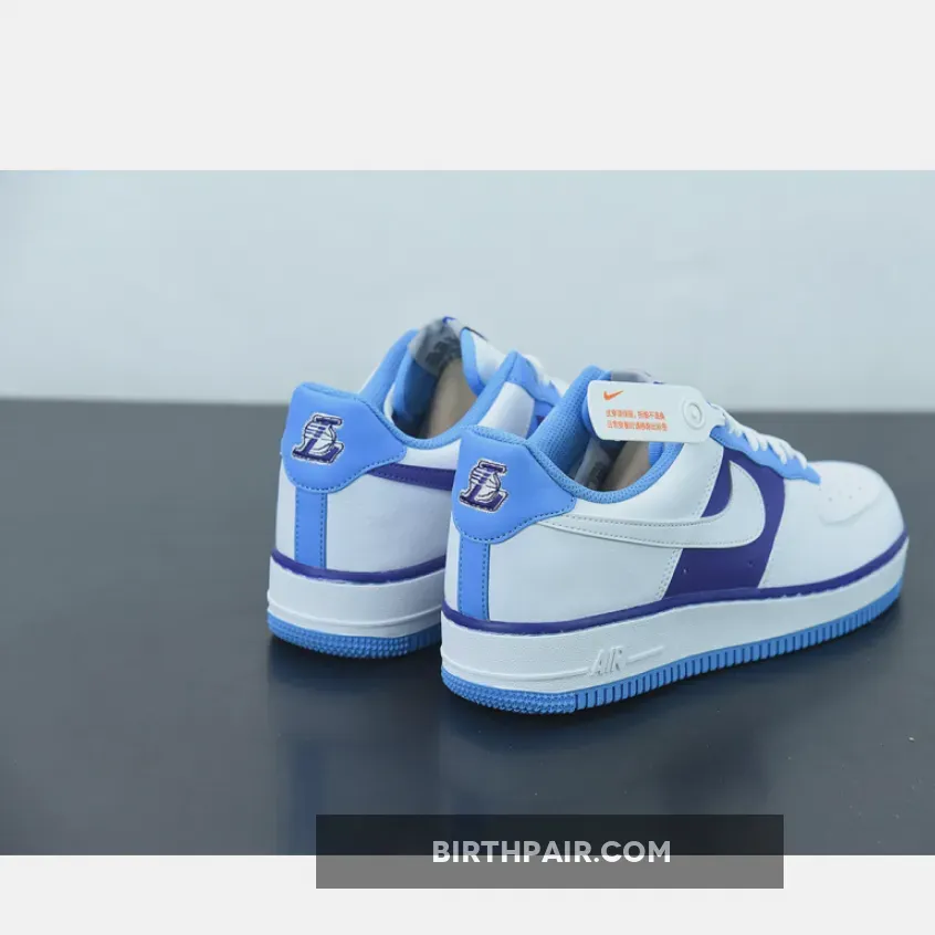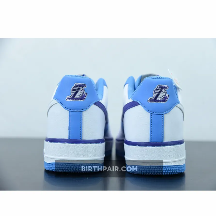 The entire vamp area and the quarter are a smooth white leather. The mid panel is a Lakers Purple matching the purple lining along the all-around feather edge. Baby blue comes out on the eye stay, the mesh sock liner, the tongue lining, the stitching right below the feather edge and the outsole. The lateral Swoosh in pure white stands out against the purple mid panel and blends in on the quarter. The diamond etched on the silver deubré is a nice finishing touch to this themed Air Force 1. Don’t froget to use our Air Force 1 size guide to know how it fits.