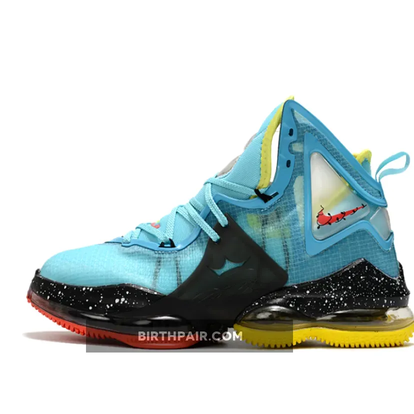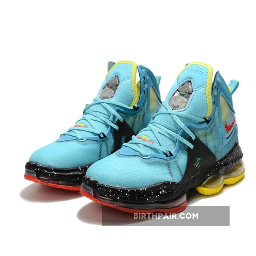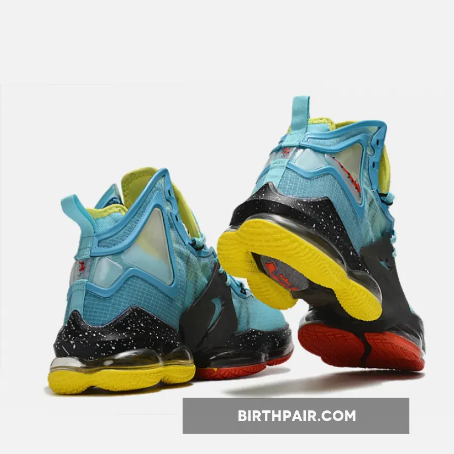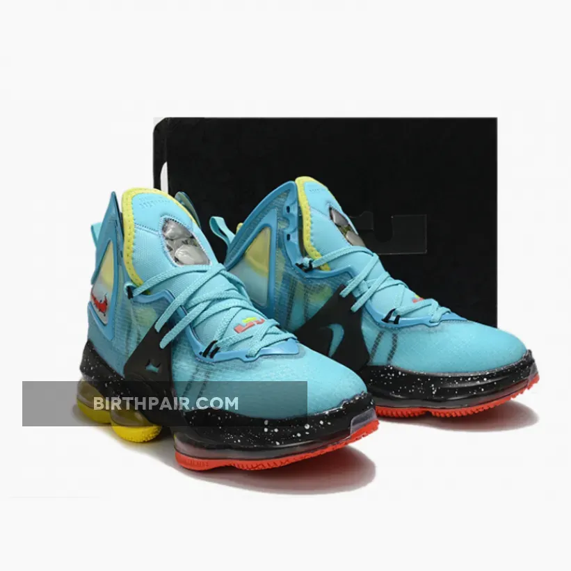 This Nike LeBron 19 features Aqua Blue throughout the upper while snow-speckles appear on the midsole, which resembles the ‘Christmas’ LeBron 8. Furthermore, Christmas lights run across the Swoosh logo and Dunkman on the heel. We also have Yellow on the liner and part of the outsole, which Orange joins to finish the look.