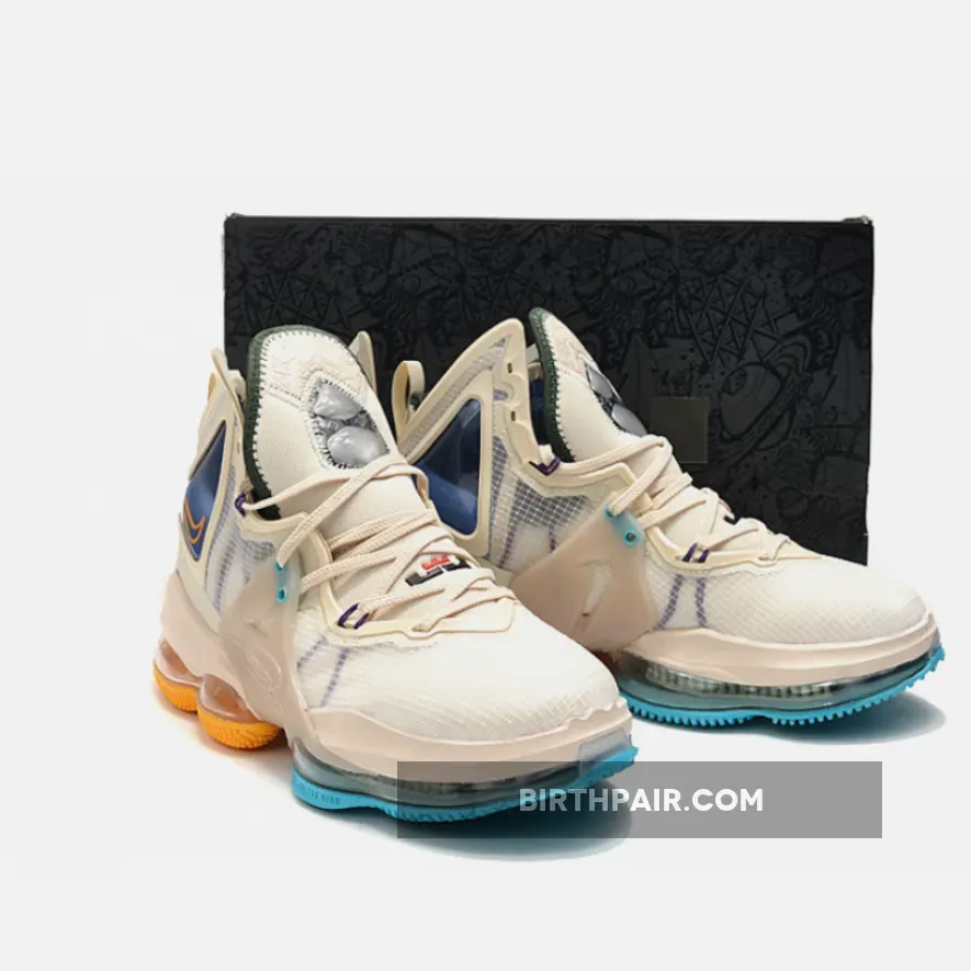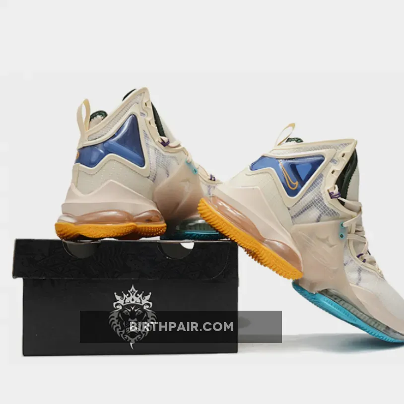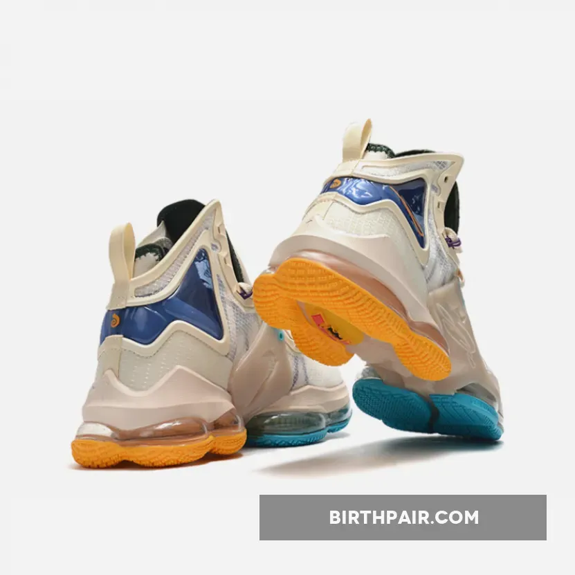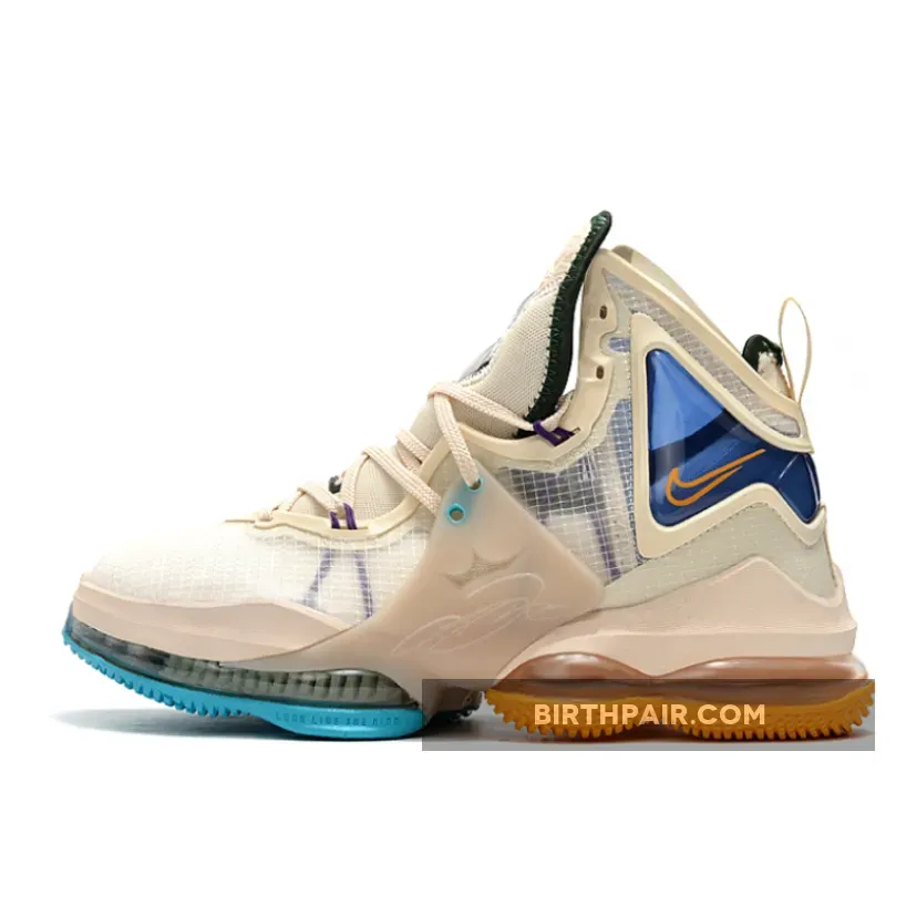 The Nike LeBron 19 is revealed in another colorway, this time in a stylish finish that may be inspired by the ’50s Minneapolis Lakers uniforms via its two-tone University Blue and Gold rubber outsole. Flaunting a tan/cream hue across its textile upper with molded TPU overlays, the silhouette is contrasted by teal and purple accents via the integrated Flywire cables, as well as the addition of the King James crown logo on the tongue and other markings on the heel. Finally, the distinct forefoot Zoom Air unit with dual-chambered Max Air under the heel rounds out the profile.