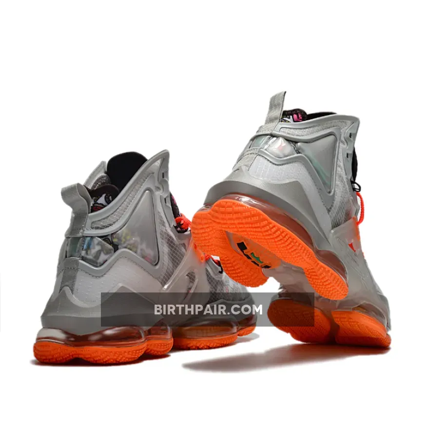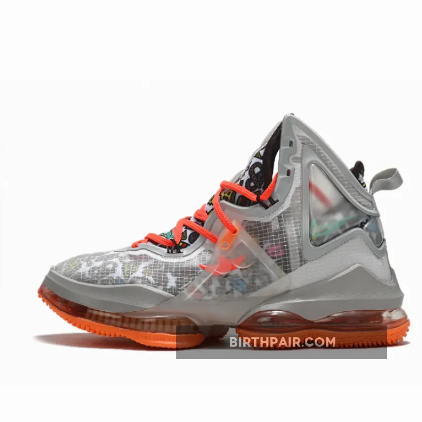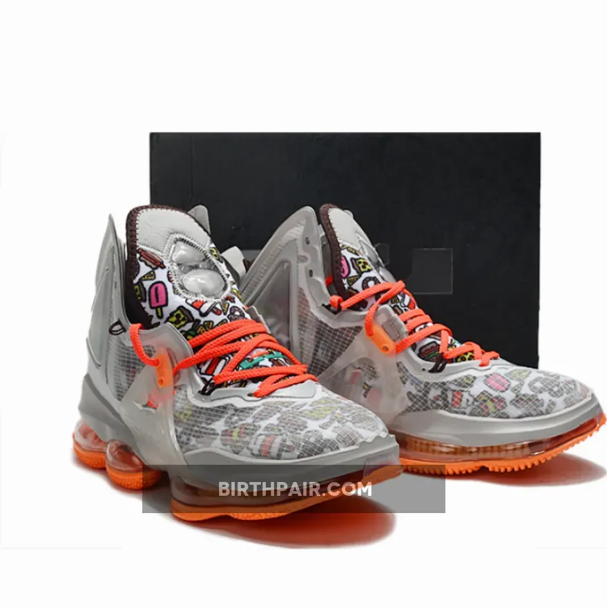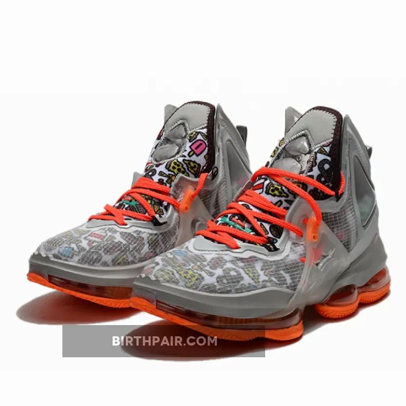 As you can see, this Nike LeBron 19 comes with White neoprene on the upper while junk food all-over print on the base. Laying over it, we have a transparent mesh. Built with a Zoom Air unit in the forefoot and a dual-chambered Max Air to finish the look.