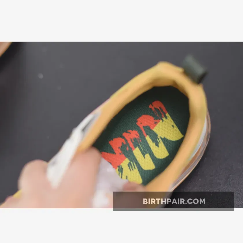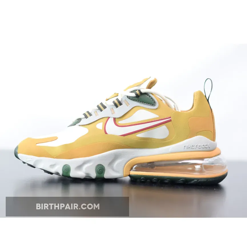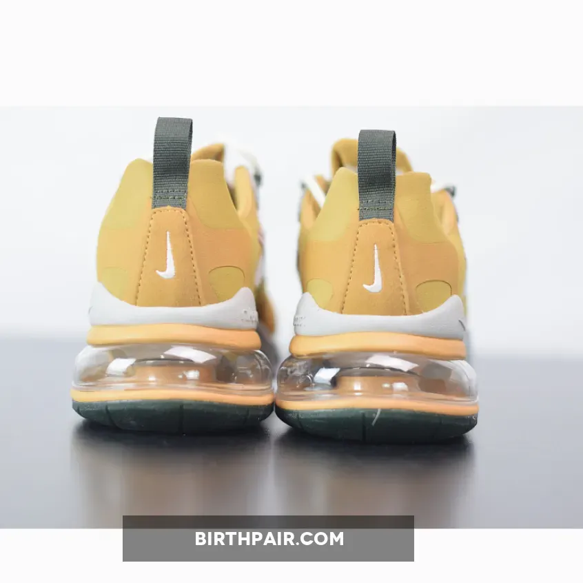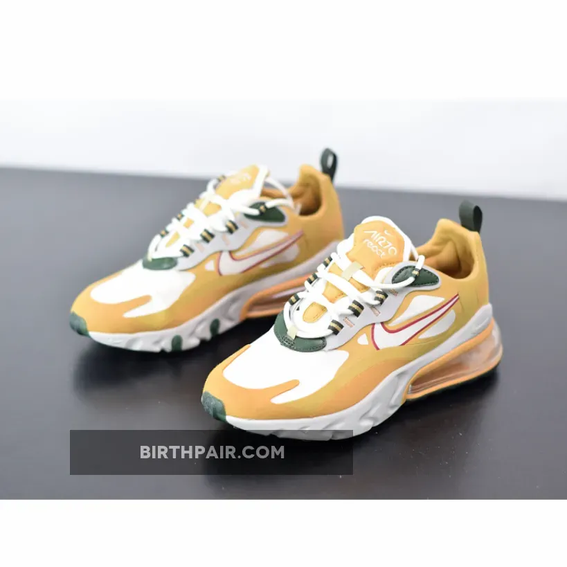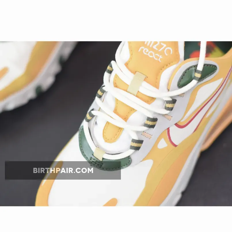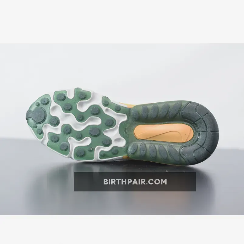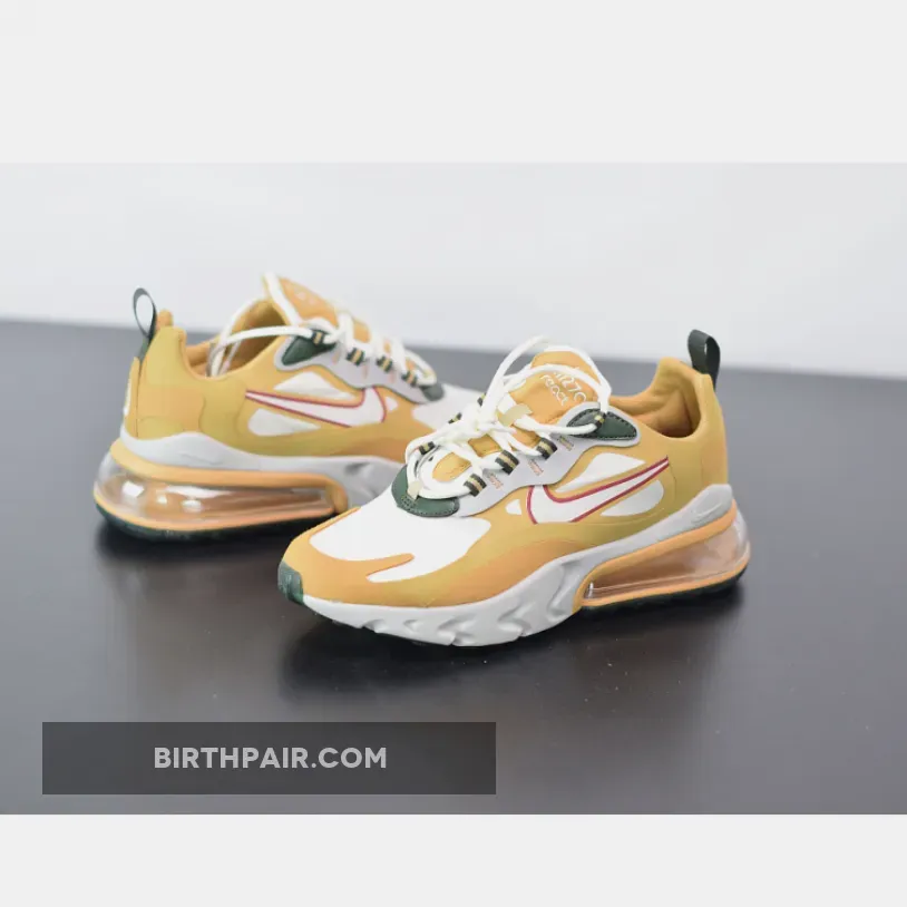 “I’m really impressed with my new Nike Air Max 270 React Gold Light Bone ?♀️! The no-sew upper is genius ? and the React midsole provides amazing comfort ?. I love how the gold and green colors pop against the white background ?. Definitely a head-turner ?, perfect for casual or athletic wear ?.”