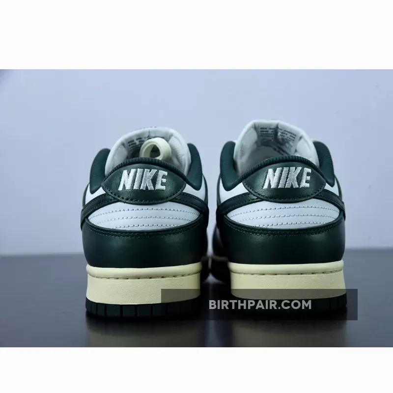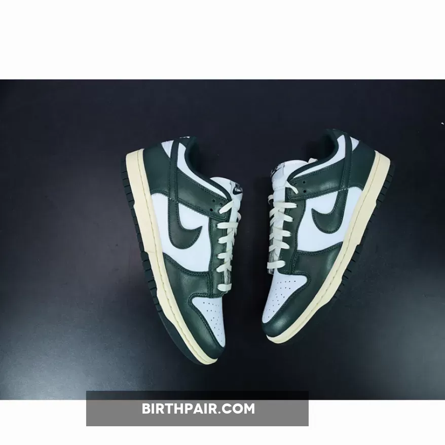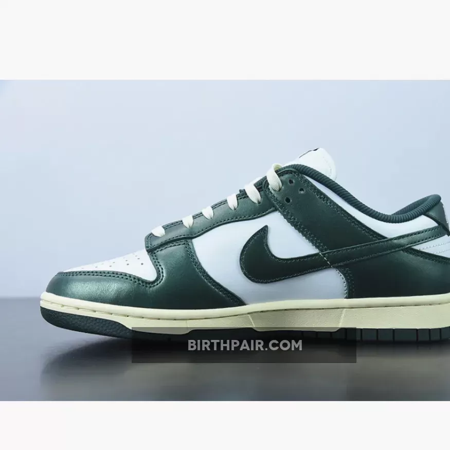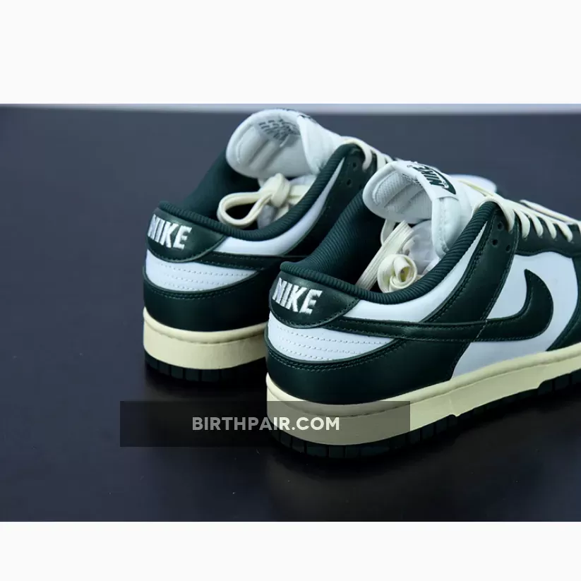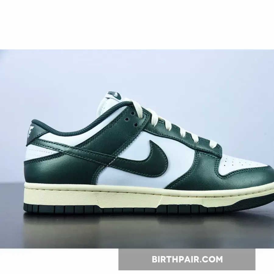 The Nike Dunk Low is another Nike silhouette that’s sporting the vintage look. Check out its latest iteration, the Nike Dunk Low Vintage Green.The base of the upper is a “colourless” white. The overlays are all highly polished leather in emerald Green on the toe cap, the mudguard, the eyestay panel, the foxing and the heel tab. The signature profile Swooshes are also the same glossy leather in emerald Green. Emerald Green repeats on the Nike branding on the tongue tab and the ribbed fabric sockliner.