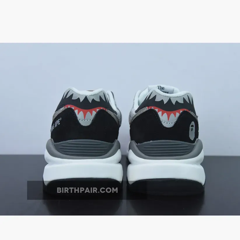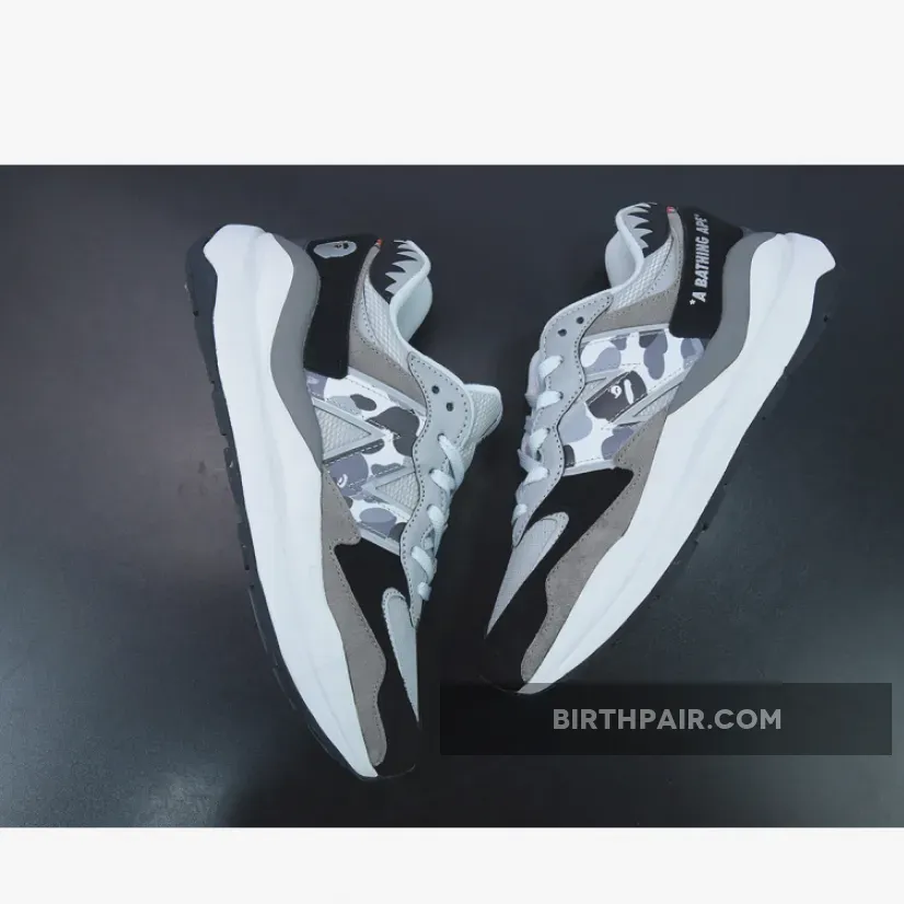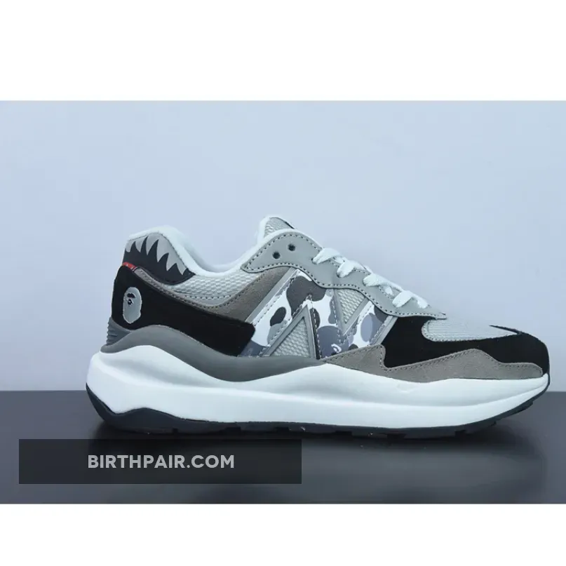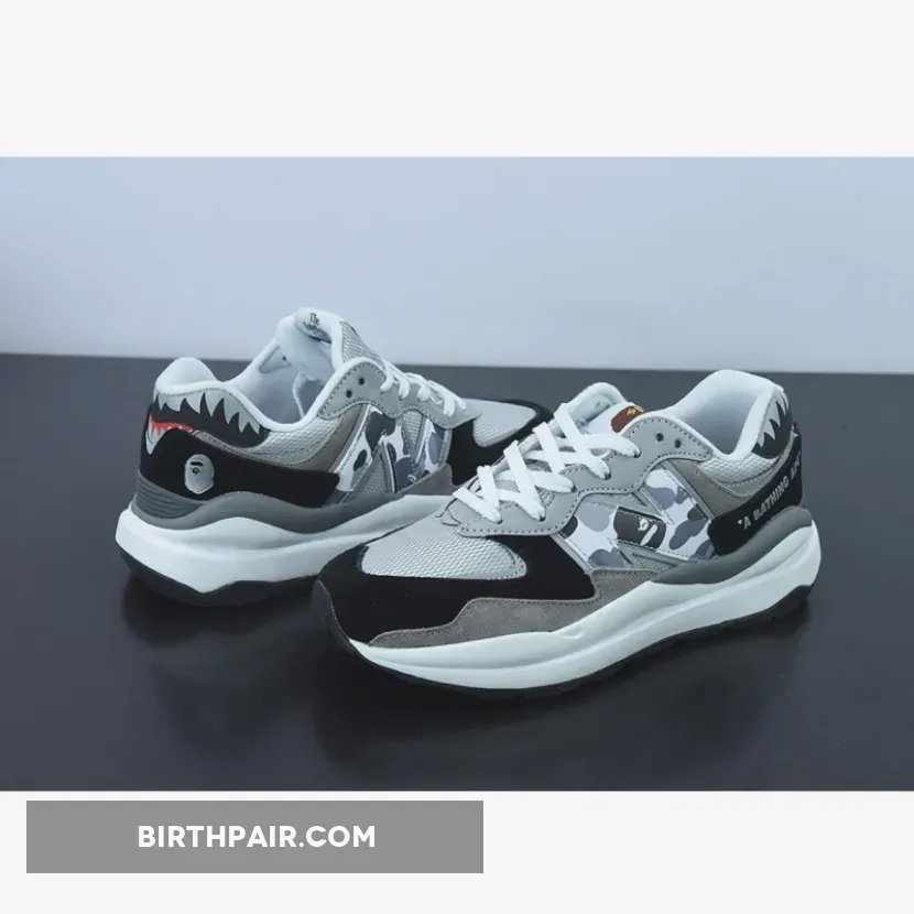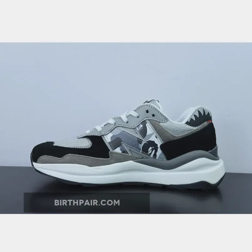 It’s been almost a year since BAPE, cult Japanese fashion brand, and New Balance released a 2002R collab. The duo partner up again on the 57/40 silhouette. Meet the BAPE x New Balance 57/40 Black Grey. For this edition of the NB 57/40, BAPE uses its signature camo design on the New Balance “N” logo. The shoe has grey and black suede overlays while the base is made with a silver fabric topped with grey mesh. Silver accents also appear on the eyestay and the lining alongside the New Balance “N” logo. The lateral heel panel is embossed with a silver BAPE head on the right shoe and “A BATHING APE” text on the left shoe. Shark teeth are printed around the ankle collar, a design detail also found on the 2002R.