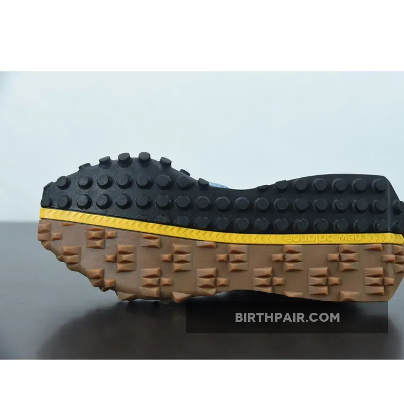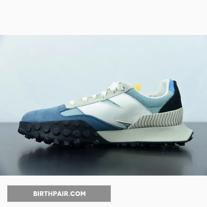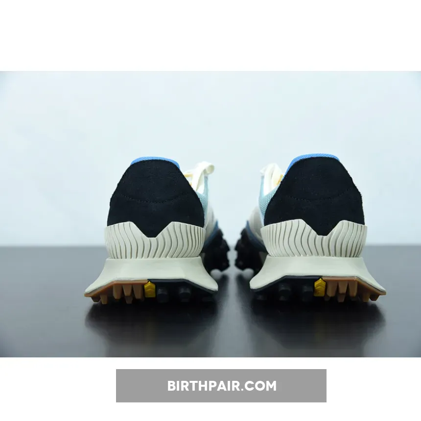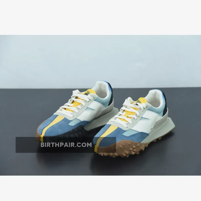 The pair flaunts light blue crinkled nylon uppers that are complemented by suede overlays on the toe in a similar shade. Unexpectedly, the tongue indulges in a bright yellow coloring that extends onto the toe as a vertical suede strip.