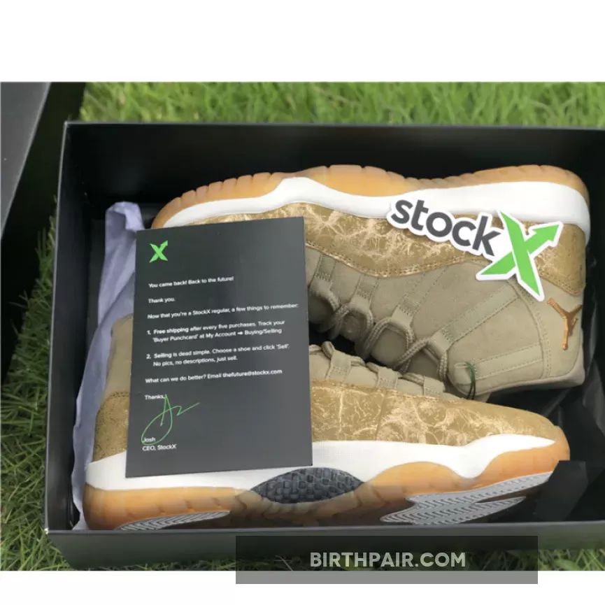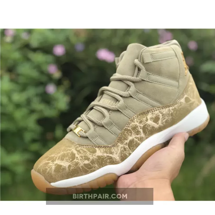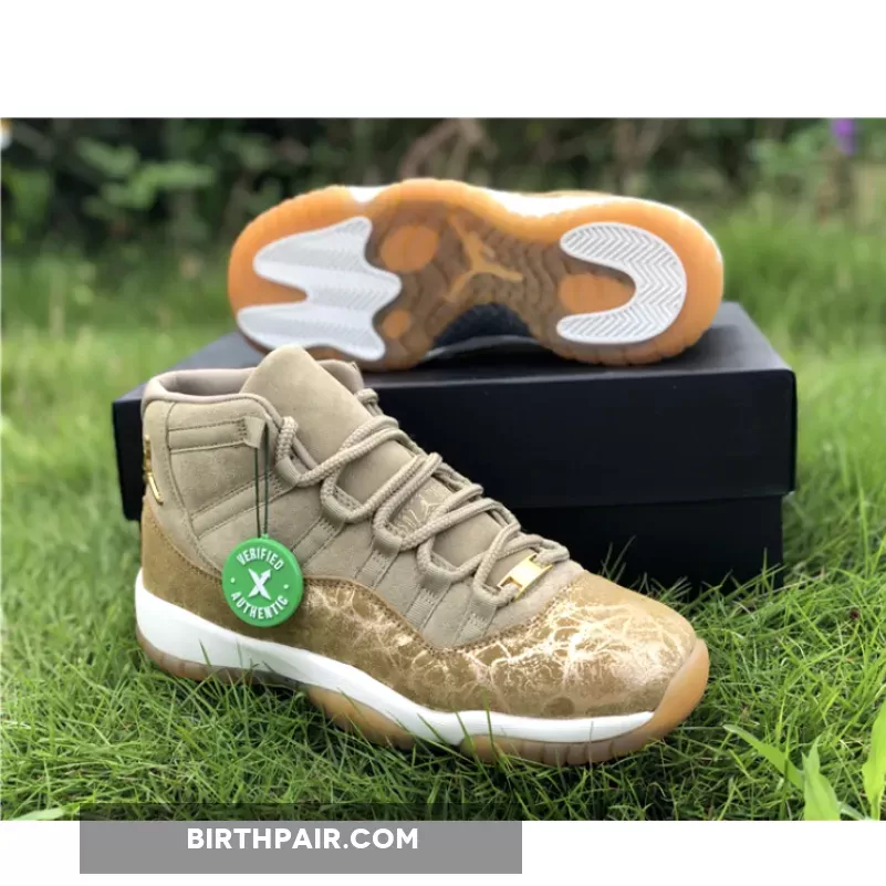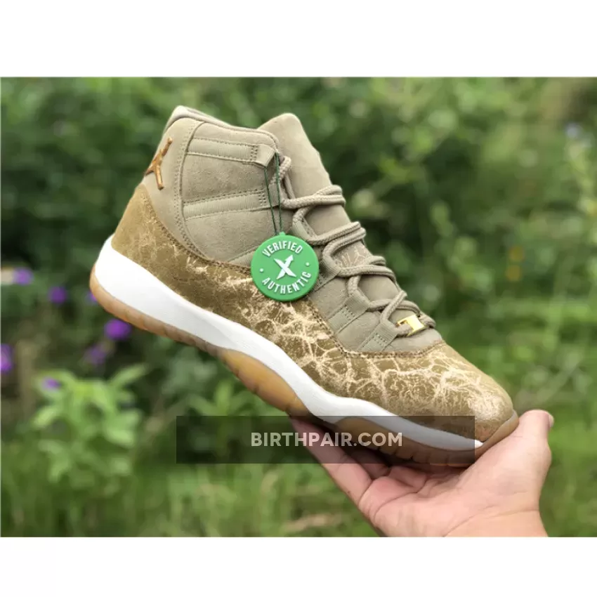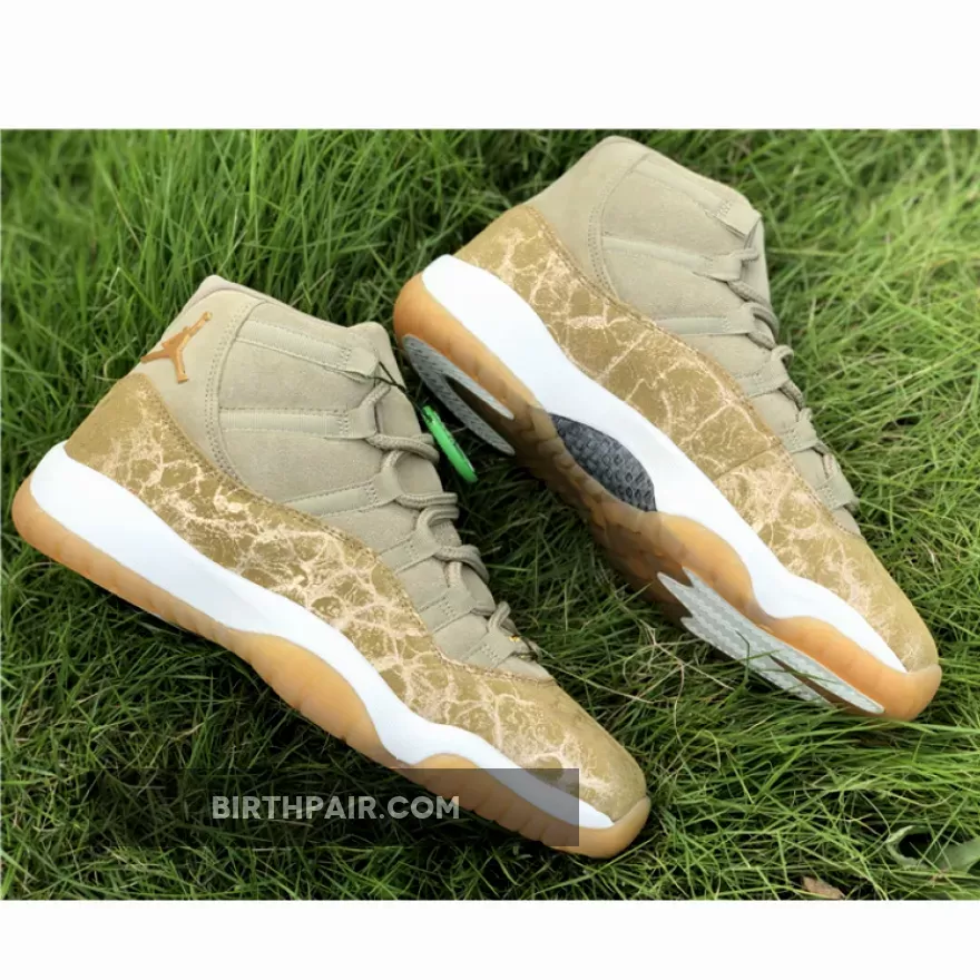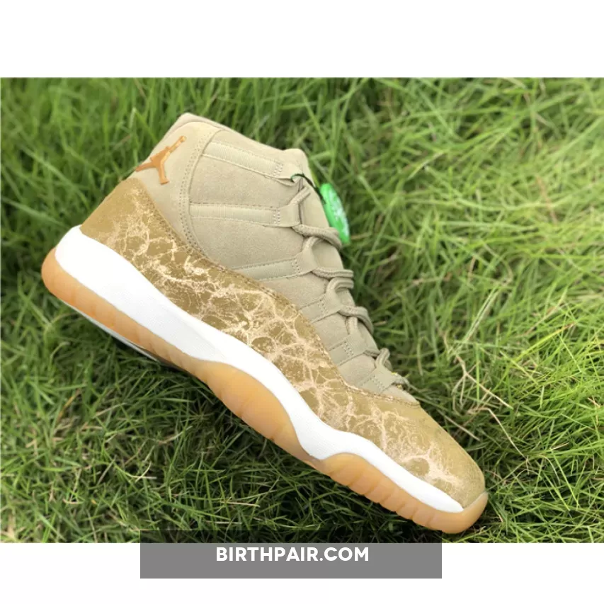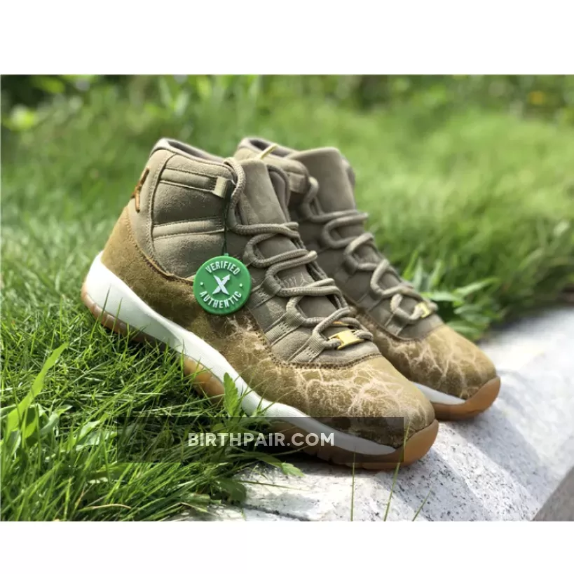 Dressed in a Neutral Olive, Sail, Gum Light Brown and Metallic Stout color scheme. This Air Jordan 11 features an Olive upper with a glitter texture replacing its patent leather overlay.