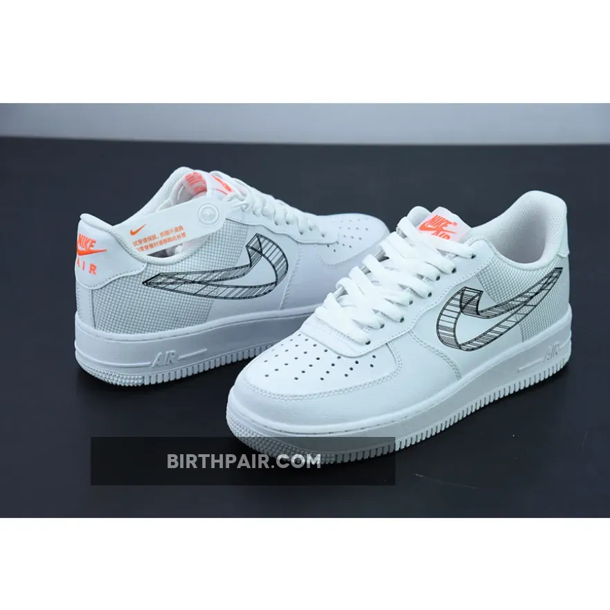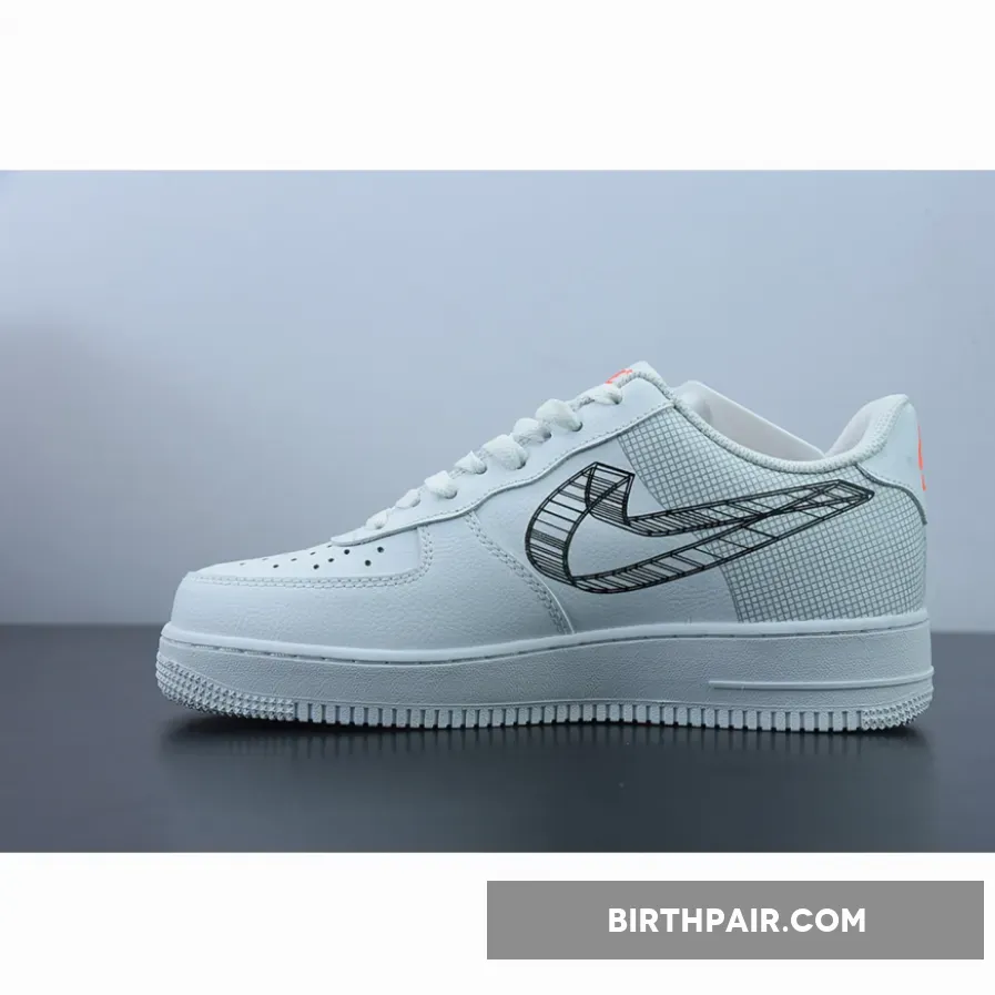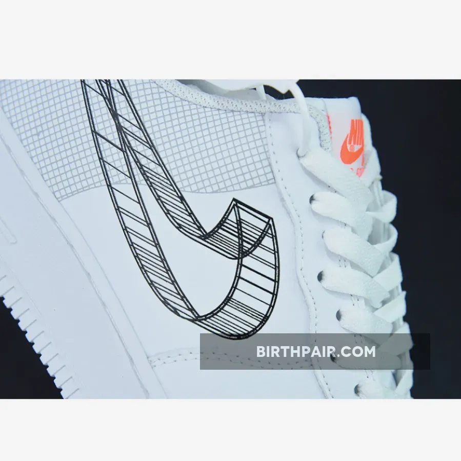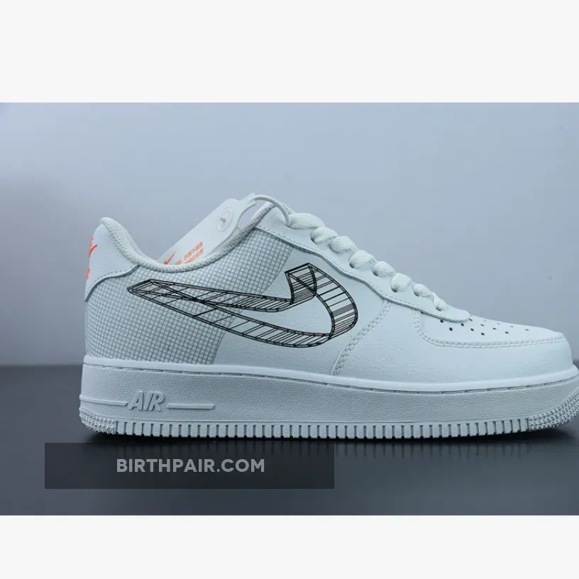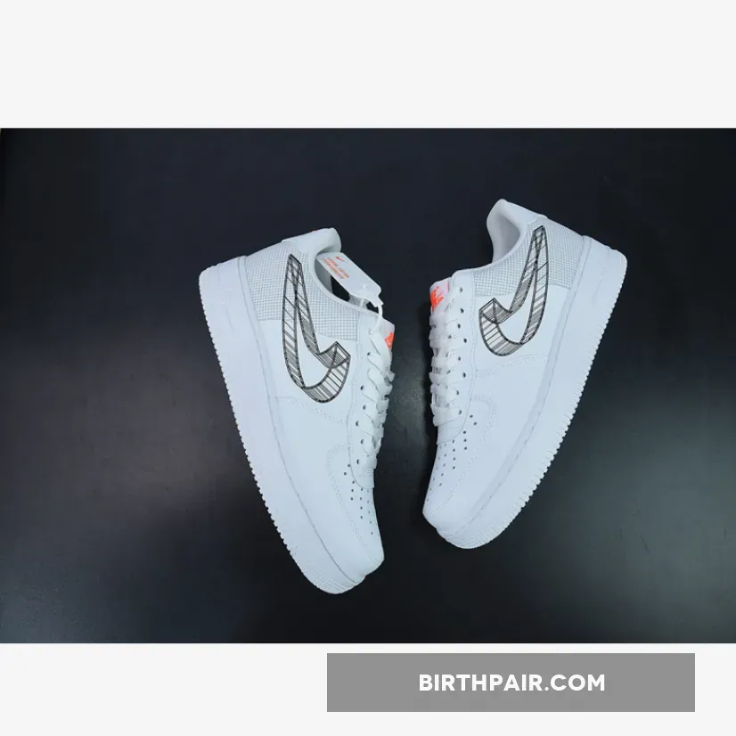 Make your style extra animated with the Nike Air Force 1 Low 3D Swoosh White. This unique pair’s main attractions are the unconventional medial and lateral black 3D Swoosh drawings which replaced the traditional leather overlay. The blueprint motif of this Air Force 1 Low extends to the heel which sees a sleek grid pattern that’s reminiscent of an architect’s graph paper. The rest of the shoe revels in a pristine colourless look, with hits of orange peppered throughout the silhouette via tongue tag, heel tab and footbed.