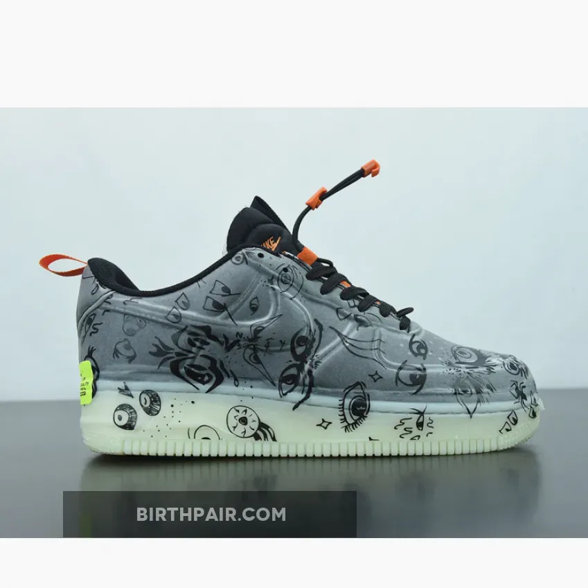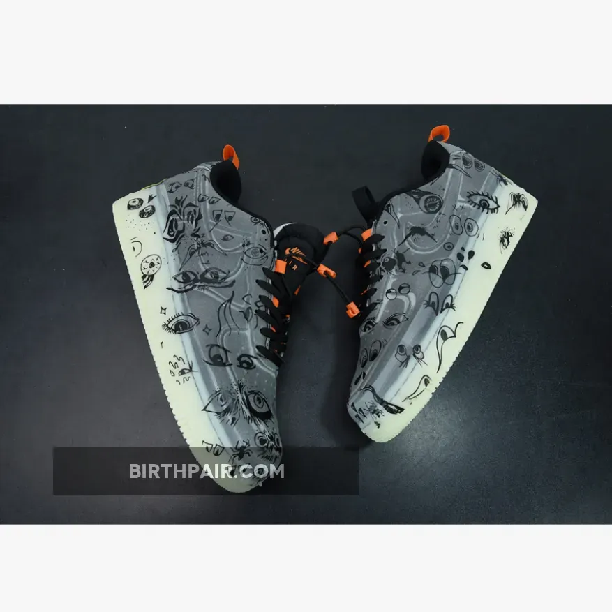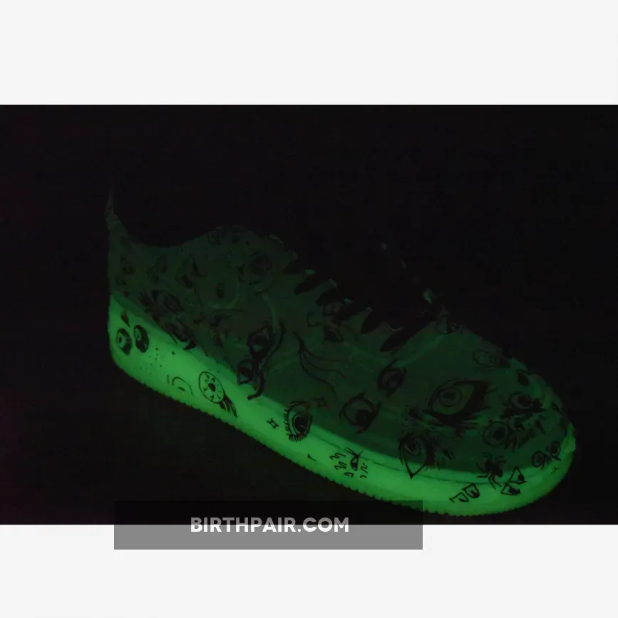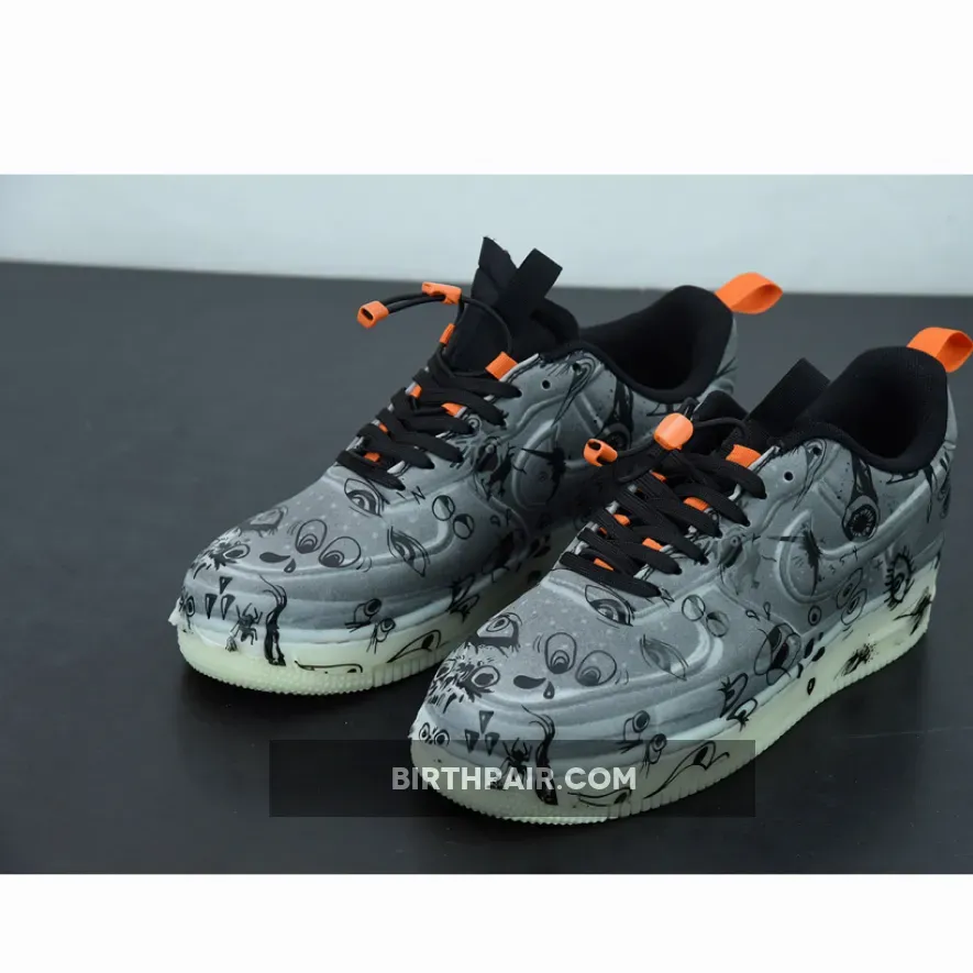 Dressed in a Black, Starfish, and White color scheme. This Nike Air Force 1 features the spooky eye graphics seen on the other models from the pack while having a full glow-in-the-dark upper and outsole.