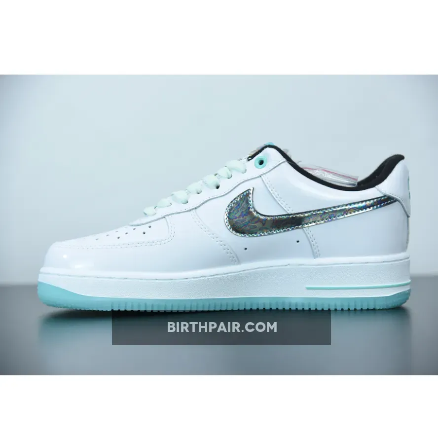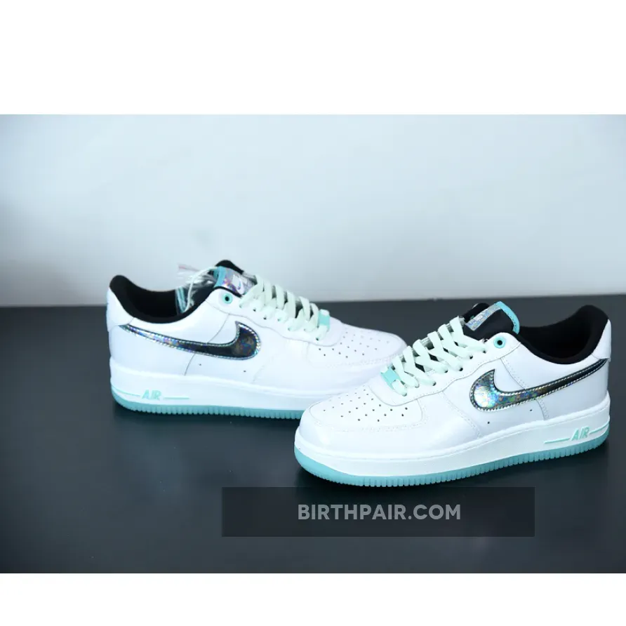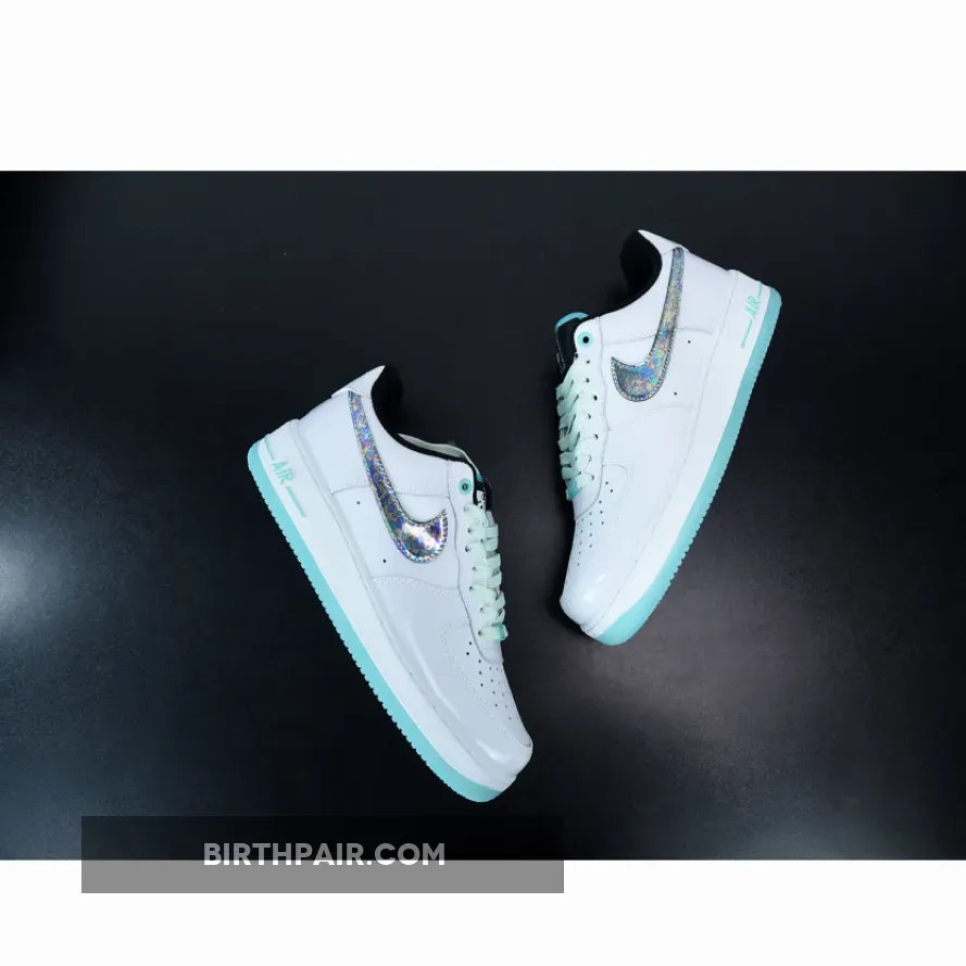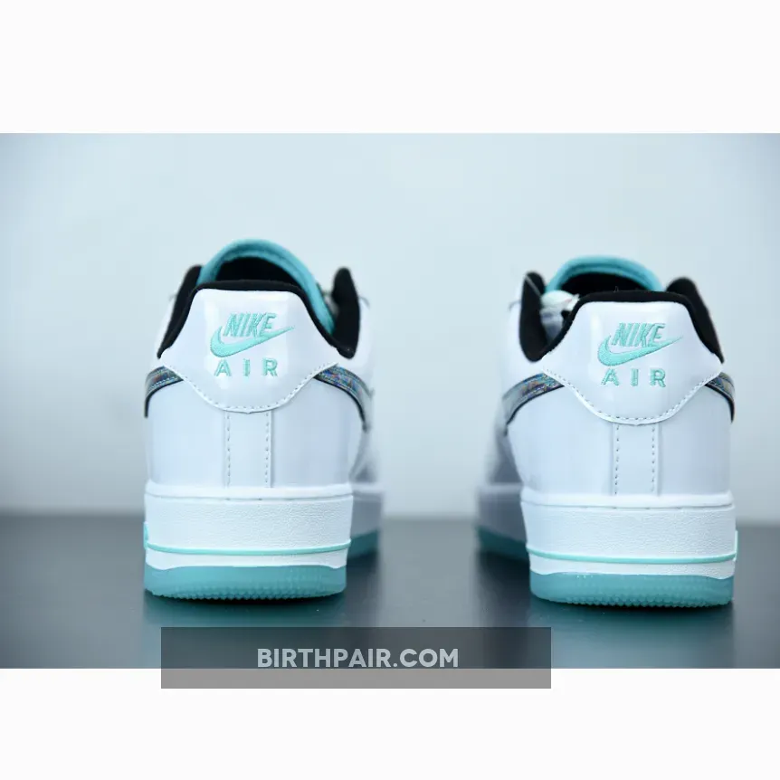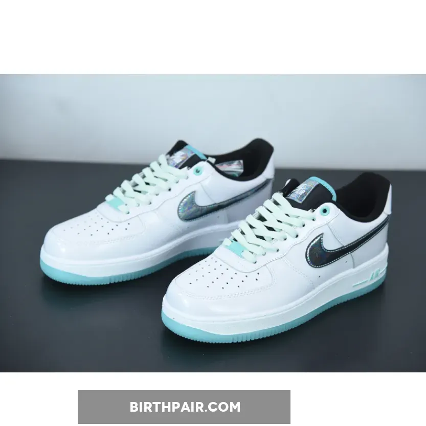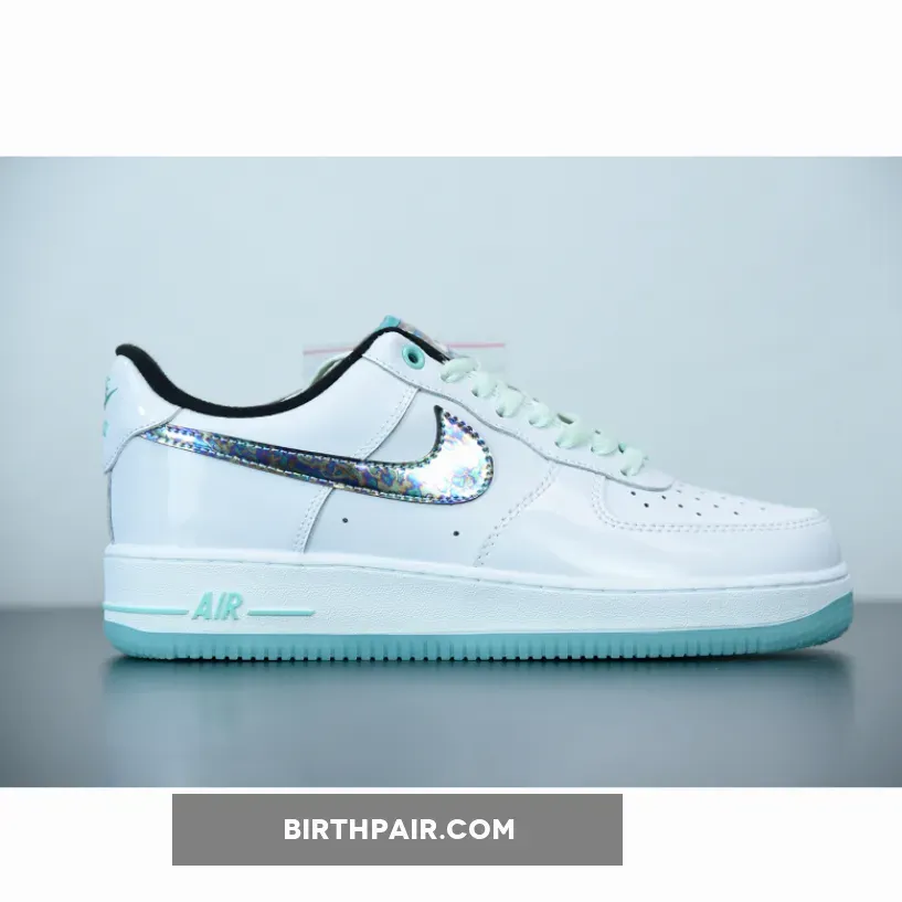The abalone shell-like swoosh, which is an iridescent collage of blues, greens, and purples, sits atop a clean white leather base. The black used on the tongue and the inside sharply deviates from the stark white. Furthering the sea theme and adding extra pops of color, a bright aqua shade paints the outsole, piping on the tongue, and branding on the heel and midsole. This color gets softened to a mint-like shade for the laces, creating a balance of colors that allows for the shimmery swoosh to stand out.