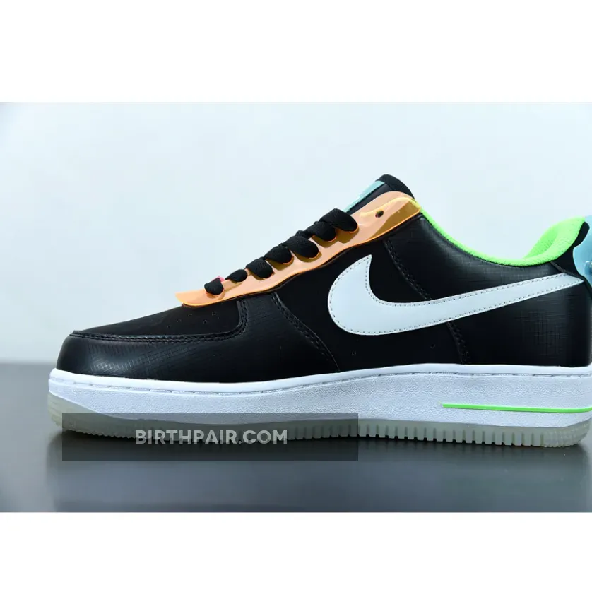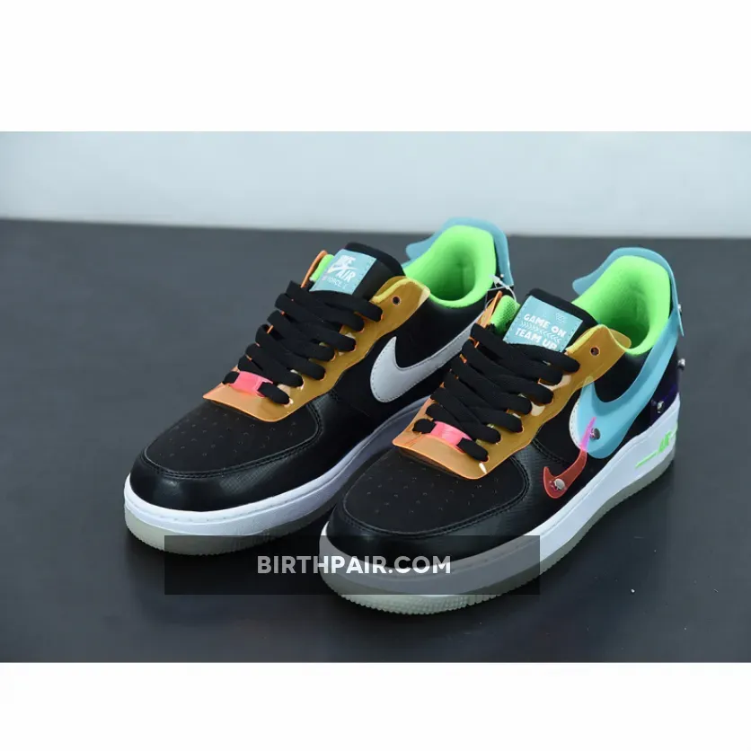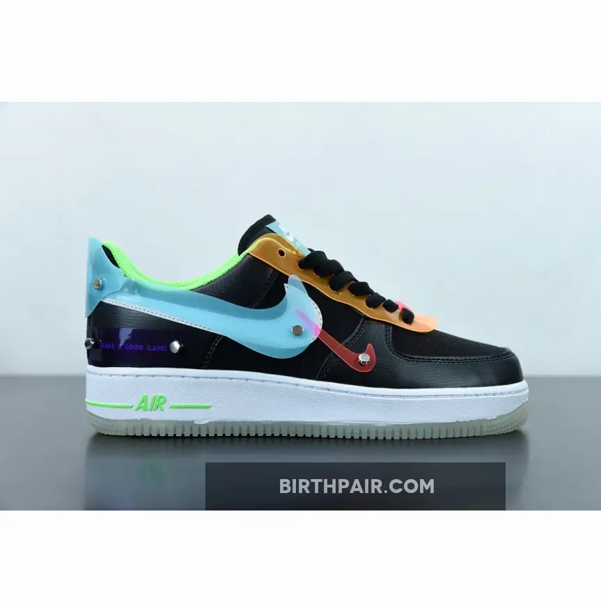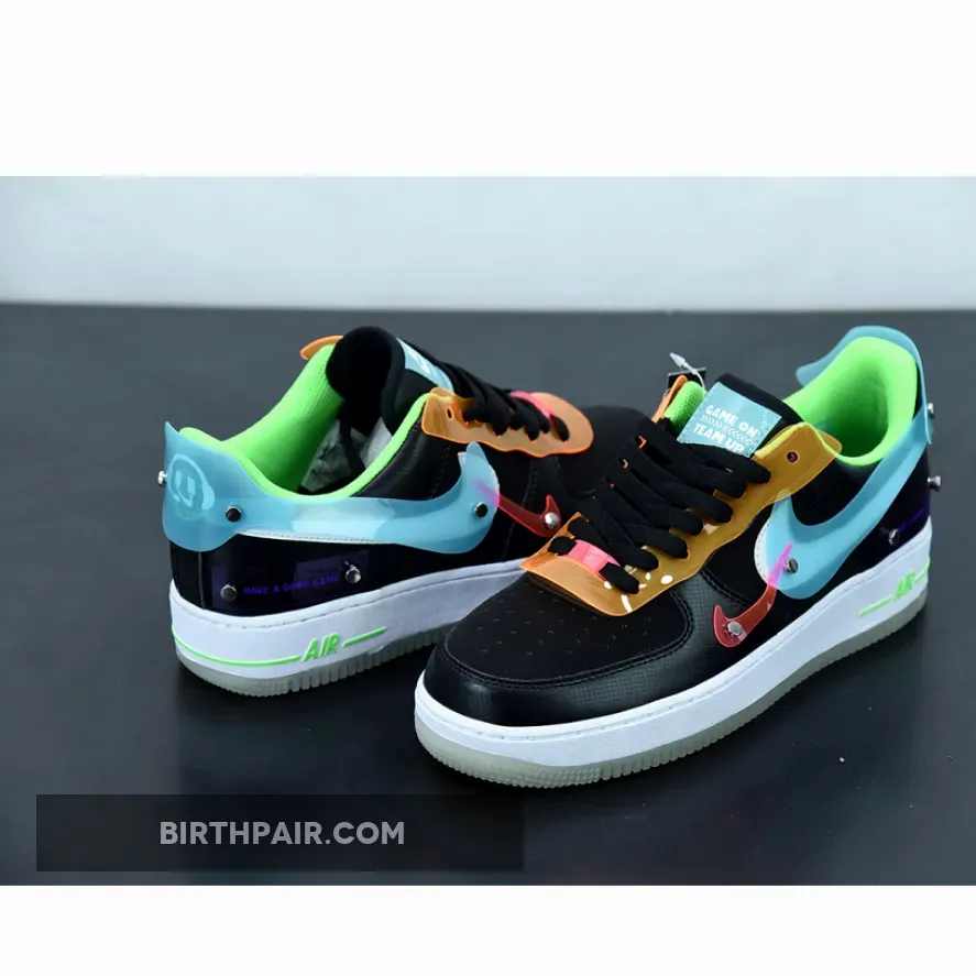 The Nike Air Force 1 Low Have A Good Game Black joins Nike Sportswear’s “Have A Good Game” capsule, featuring a futuristic gamer look. A black synthetic leather forms the base of the upper mixed in with colourful vinyl overlays. The lace guards are a bright orange, the profile Swooshes are white leather overlaid with baby blue vinyl, and there’s also a mini Swoosh in bright pink.