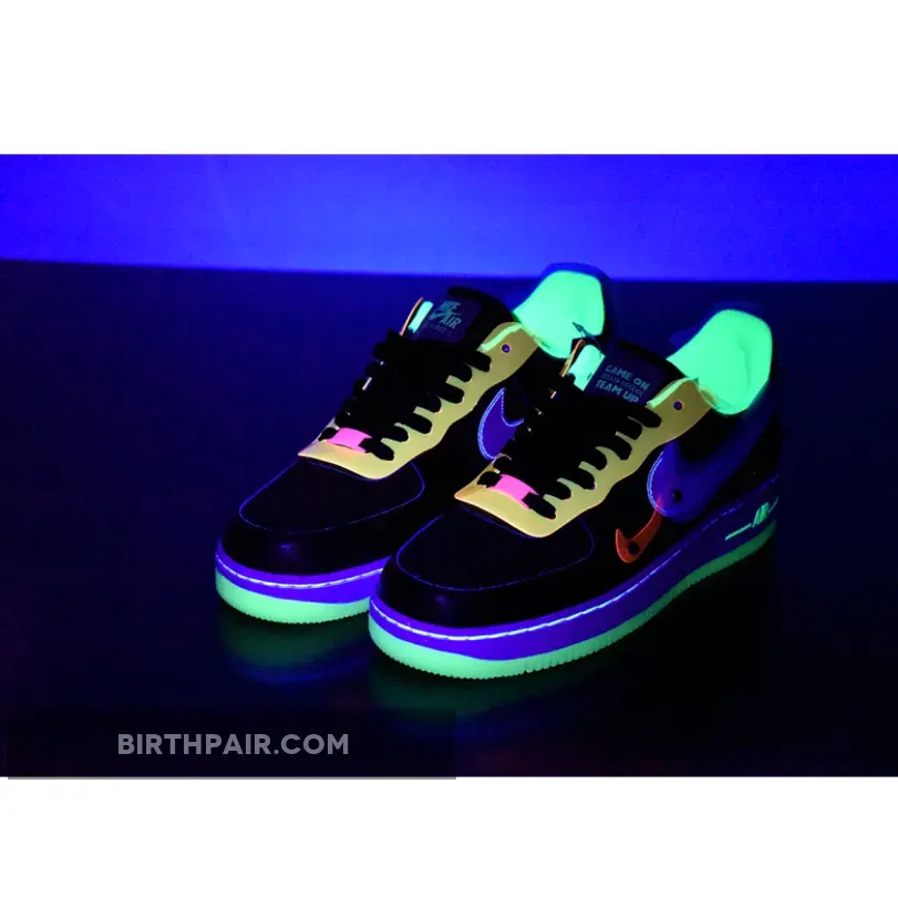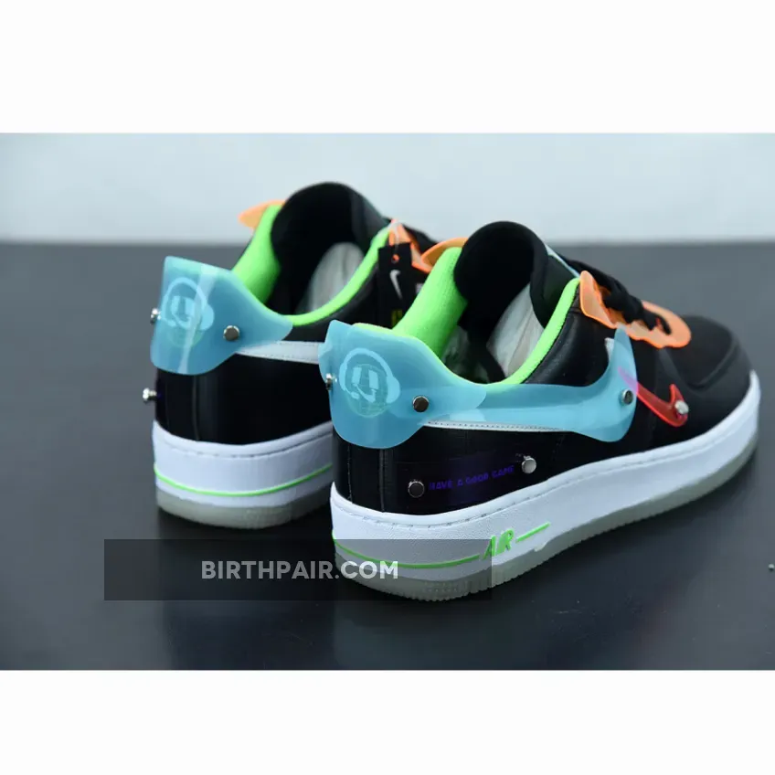 Bright green sock liners in mesh, matching the bright green Air branding on the all-white midsole, as well as the purple “Have A Good Game” branding on the hind quarter complete the multi-coloured gamer look. The two headset-wearing icons on the heel tabs and the glow-in-the-dark outsoles are a nice touch, too. Get your game on by picking up the Nike Air Force 1 Low Have A Good Game Black on Our Store Supplier app. You’ll always be on top of the latest Nike news, too.
