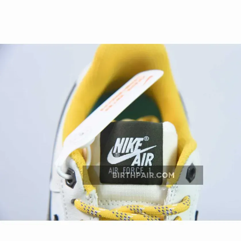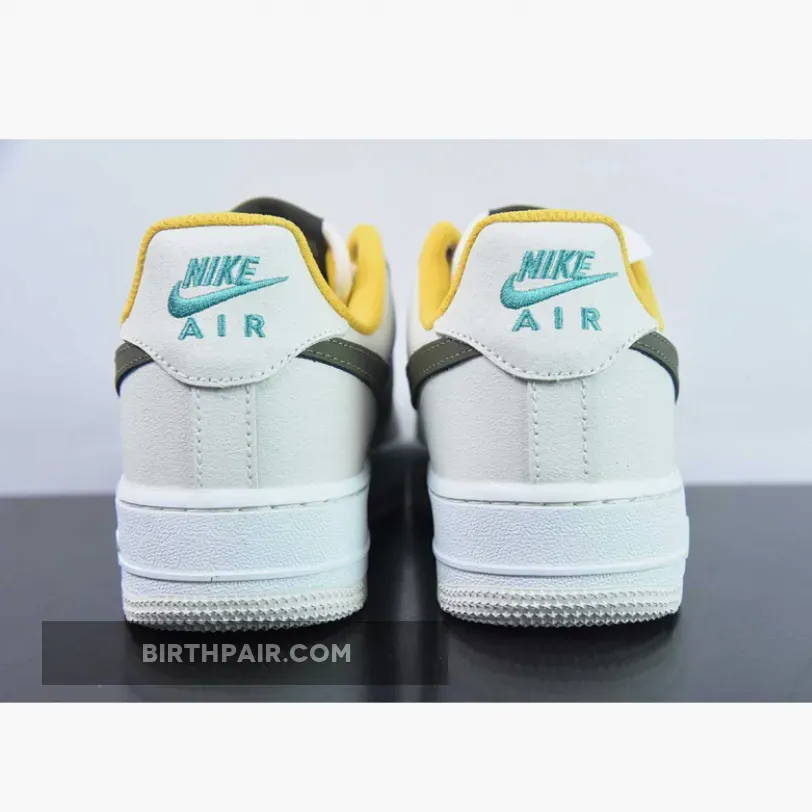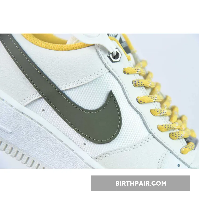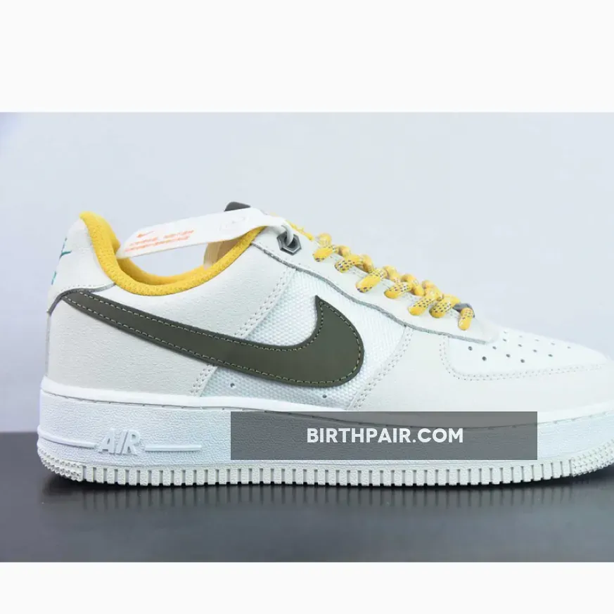 This shoe boasts a mix of high-quality materials like textured leather, suede, and mesh. The design showcases a Summit White base with Light Bone overlays, complemented by Cargo Khaki Swooshes and tongue labels, catching everyone’s attention. Notably, it includes Vivid Sulfur rope laces and inner lining, along with Clear Jade insoles and heel branding, adding a unique touch. The metal upper eyelets contribute to its premium look, while the White midsole and Grey rubber outsole complete the overall design.