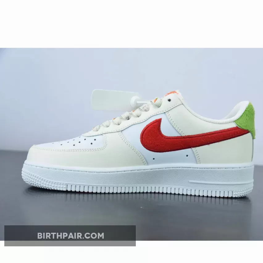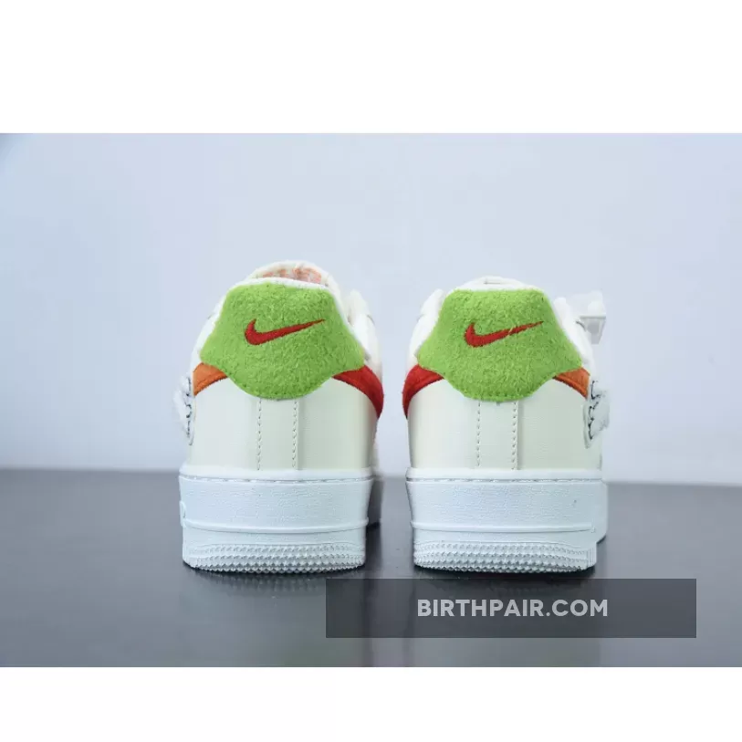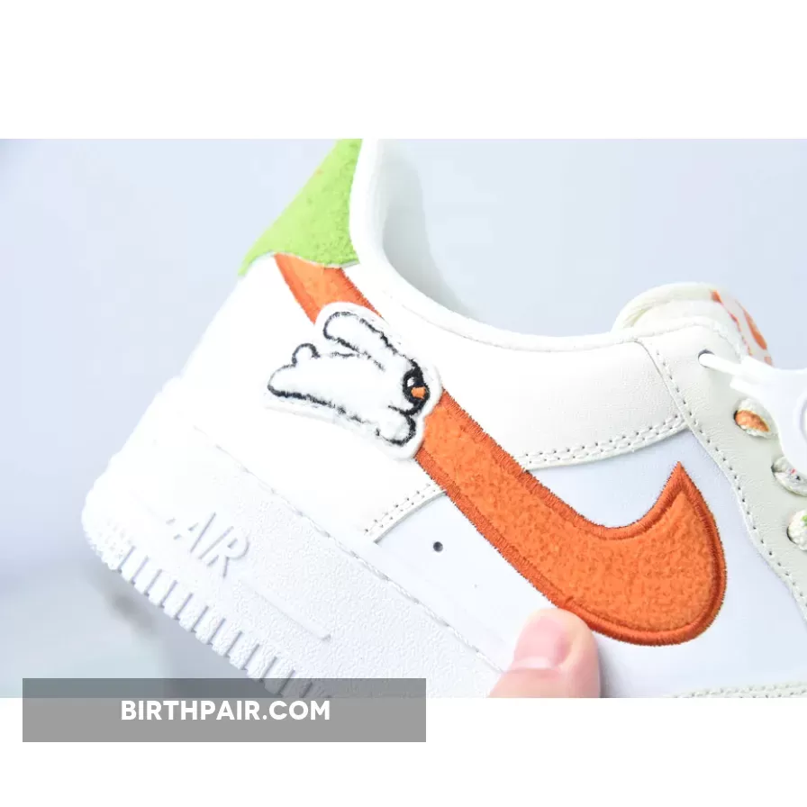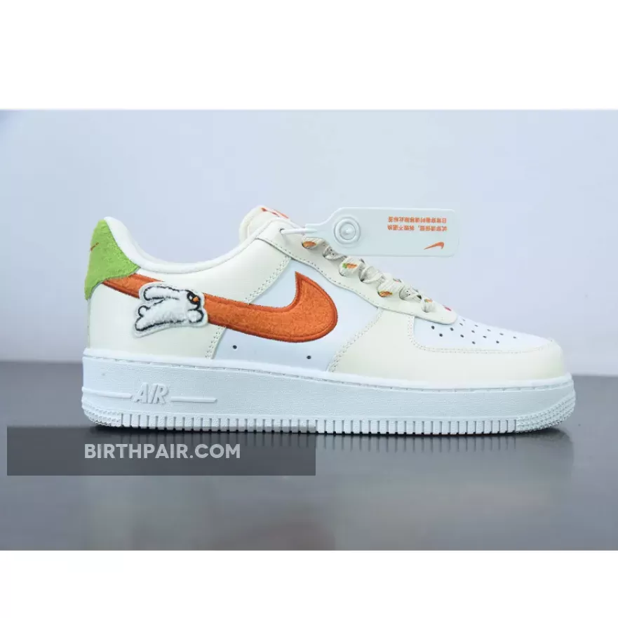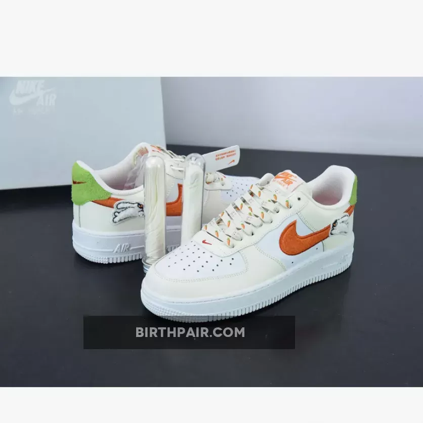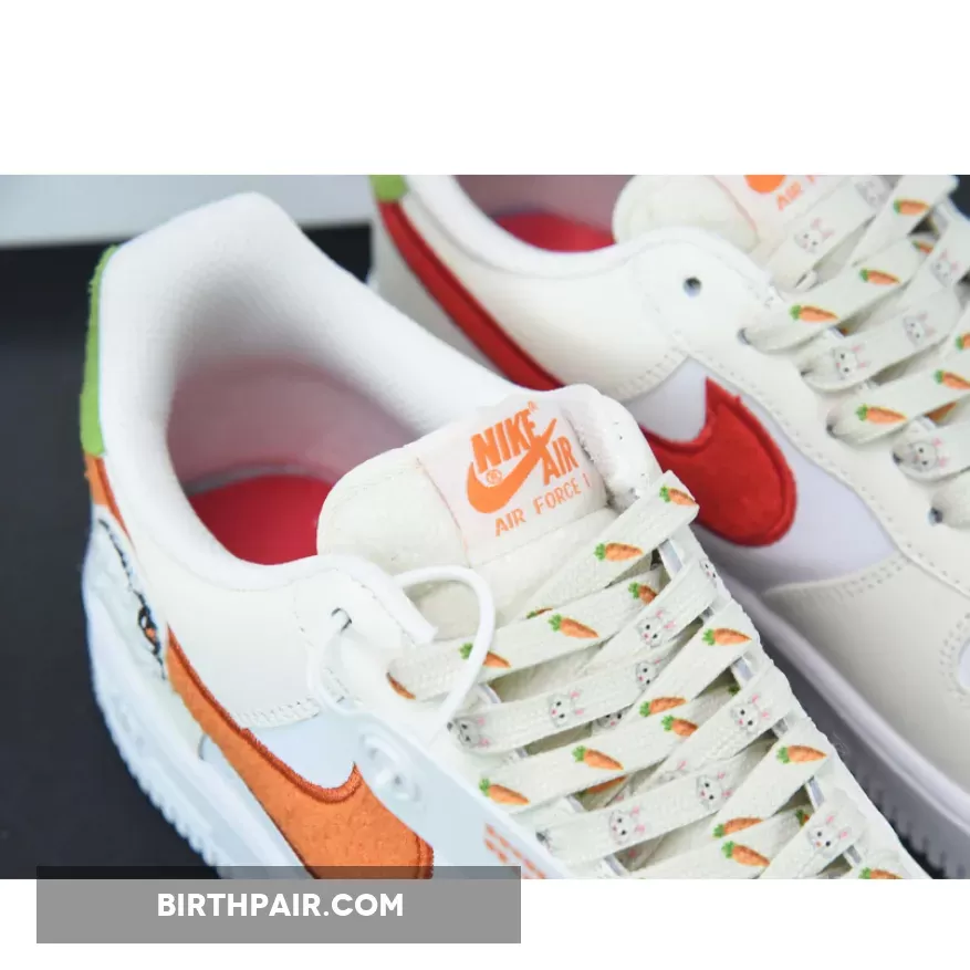 This offering of the Nike Air Force 1 Low features a White leather upper with Sail overlays. Highlighting the shoe are chenille carrot-inspired Orange and Red Swooshes, Green heel tabs along with a bunny dangling from the lateral ankle.