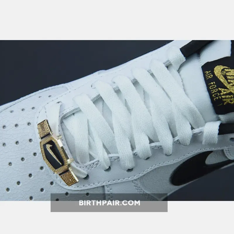 this Nike Air Force 1 comes with White leather on the base while cracked leather appears on the toe and mid-panel. Next, Black patent leather fills in the Swoosh logos and heel while Gold adorns the tongue labels. Sticking out the most, we have wrestling belt-inspired lace jewels.