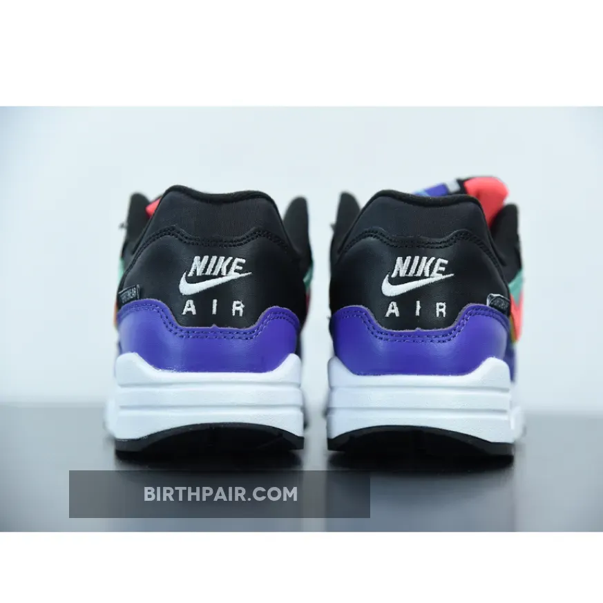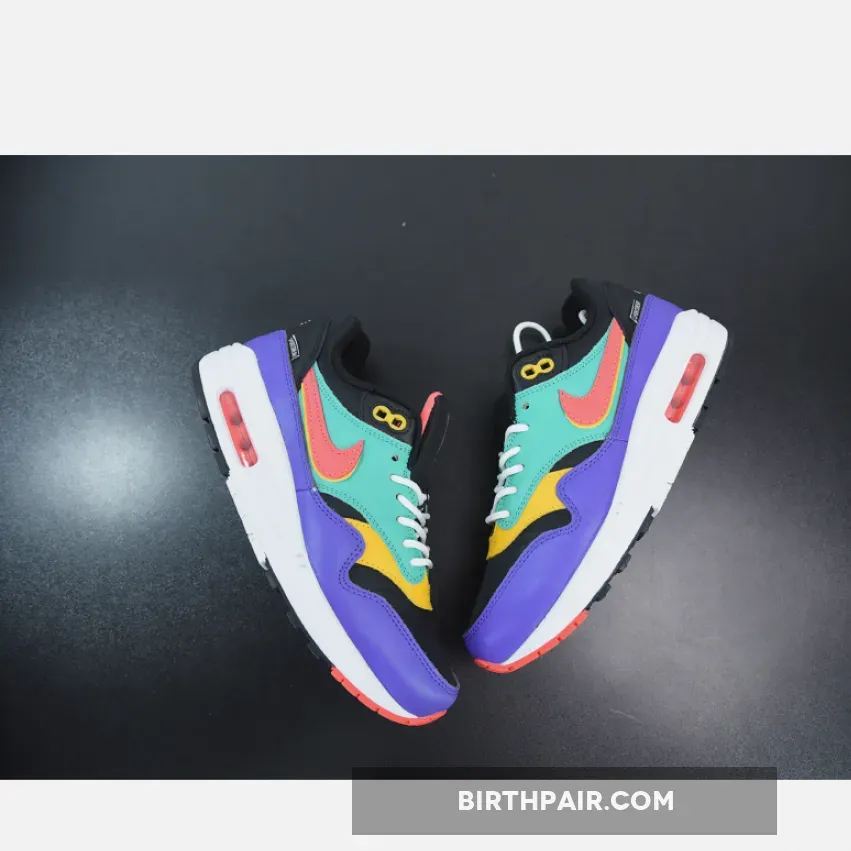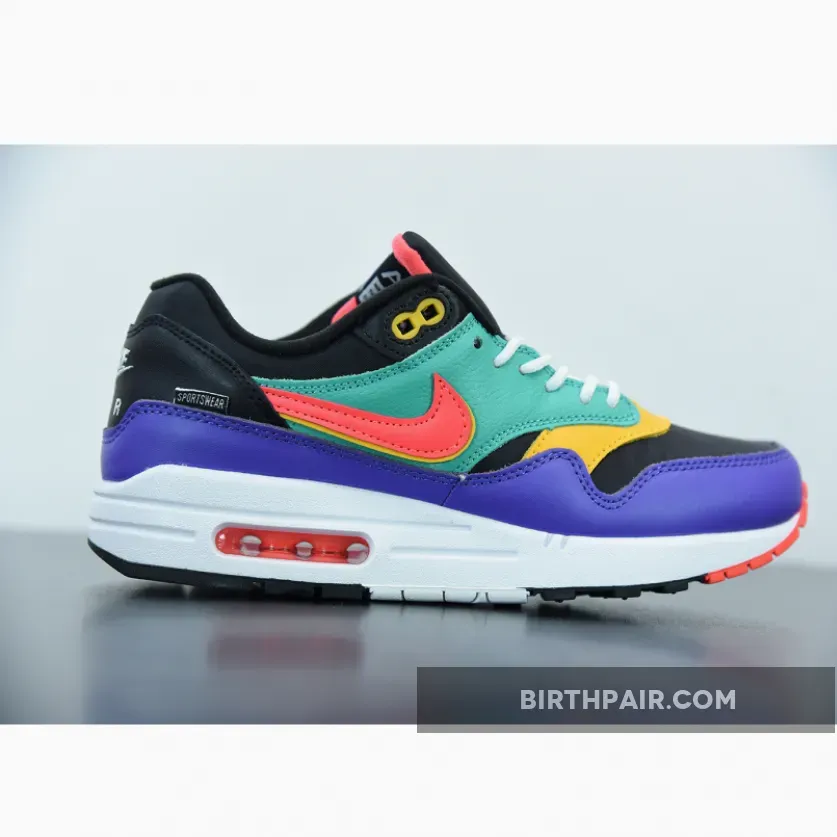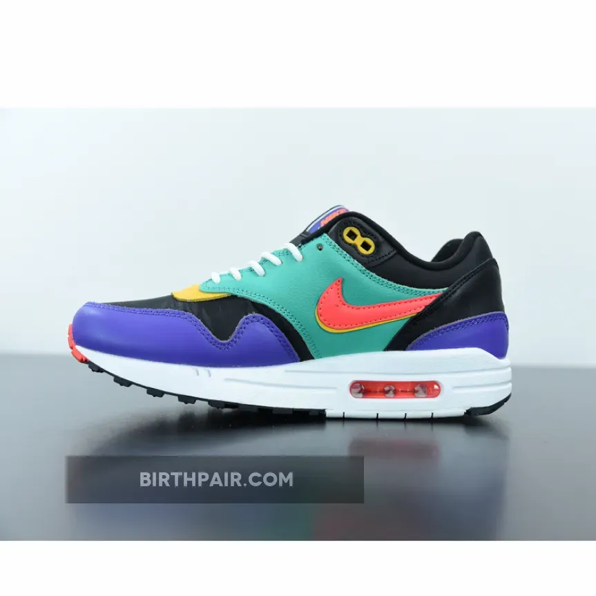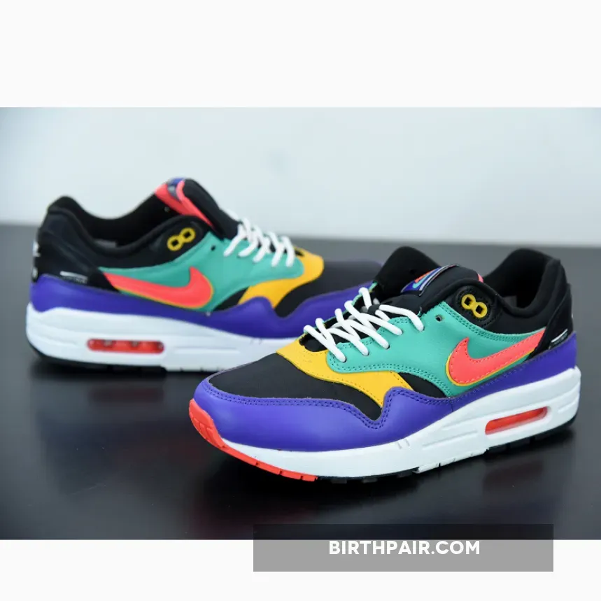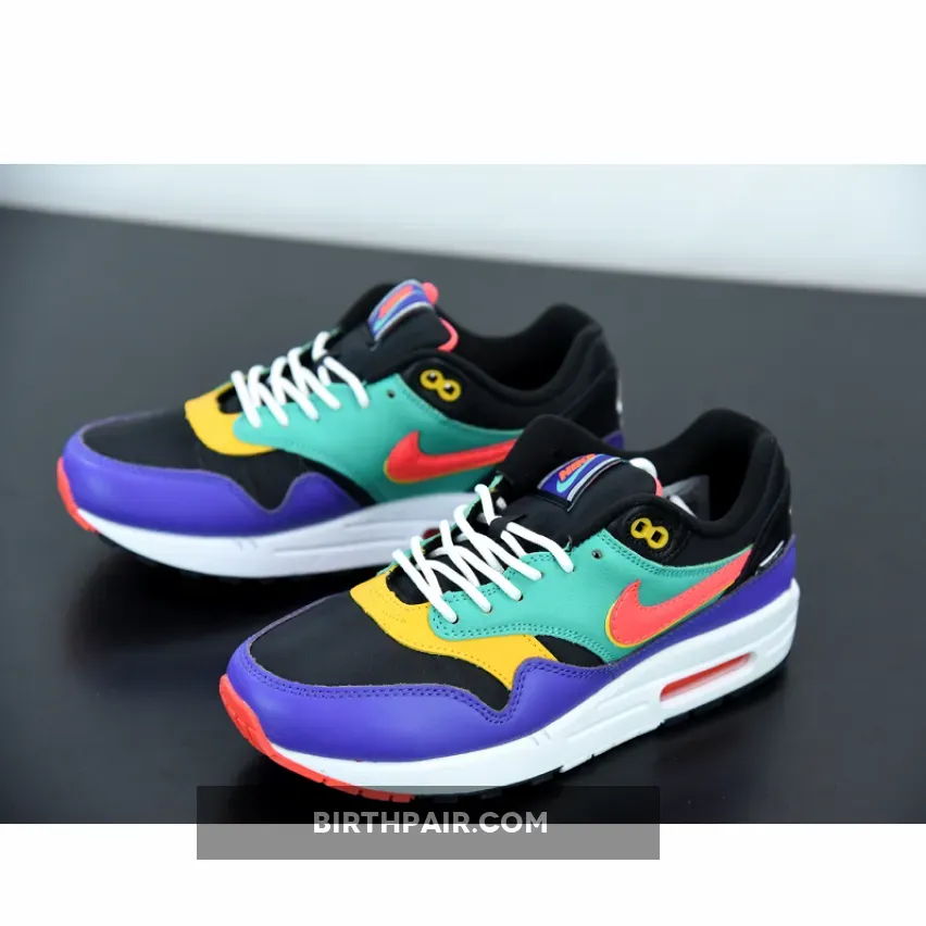 A straight nod to Nike Windbreakers from the ’90s, this Nike Air Max 1 features a Black upper with Yellow, Teal, Crimson, and Orange tones on the overlays.