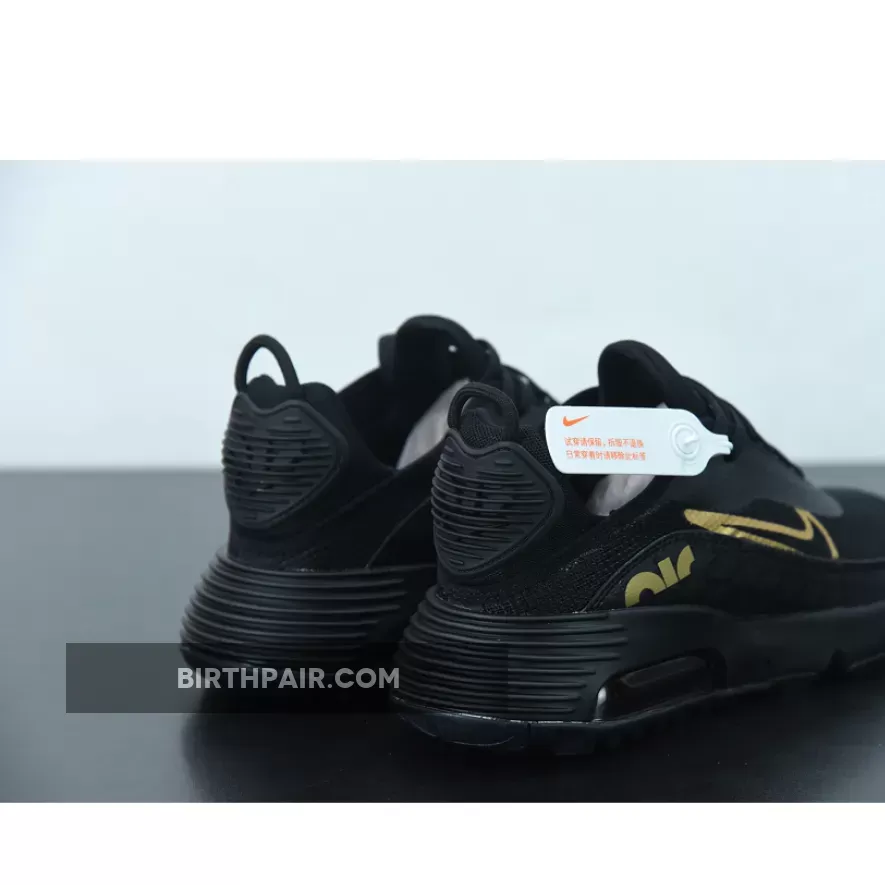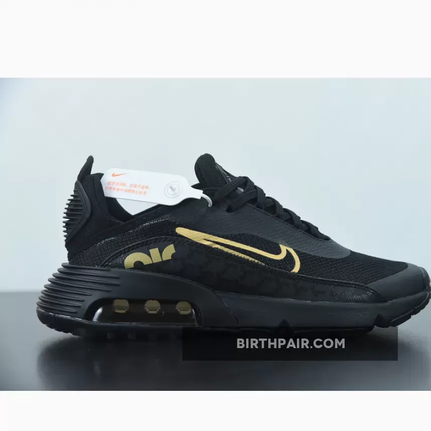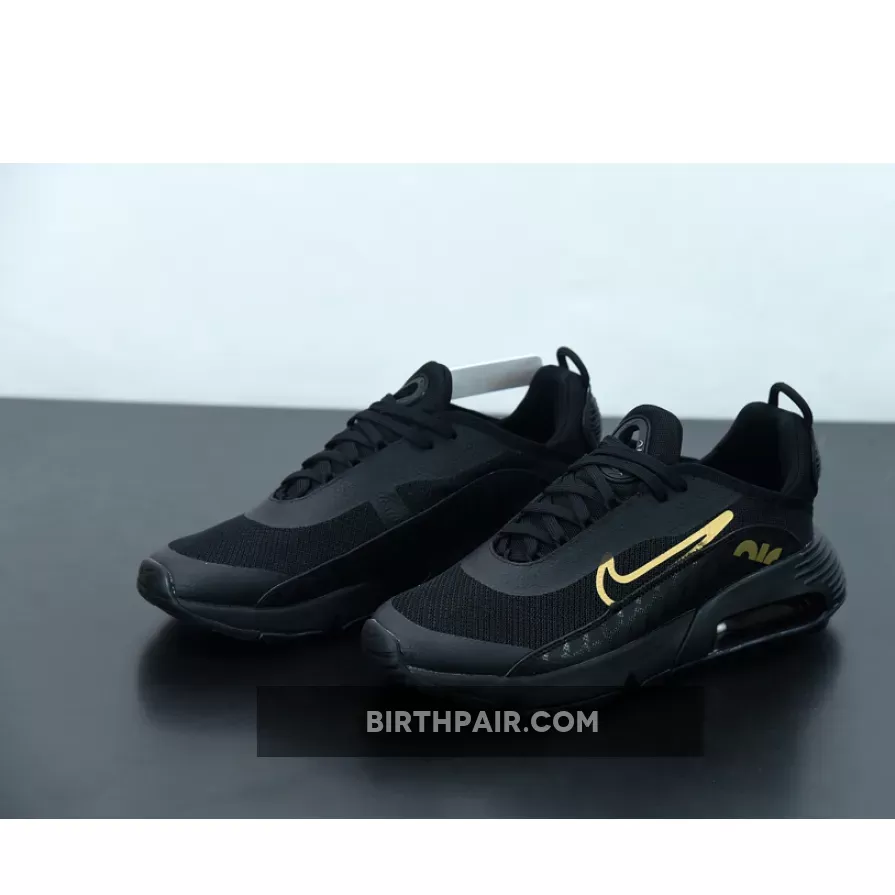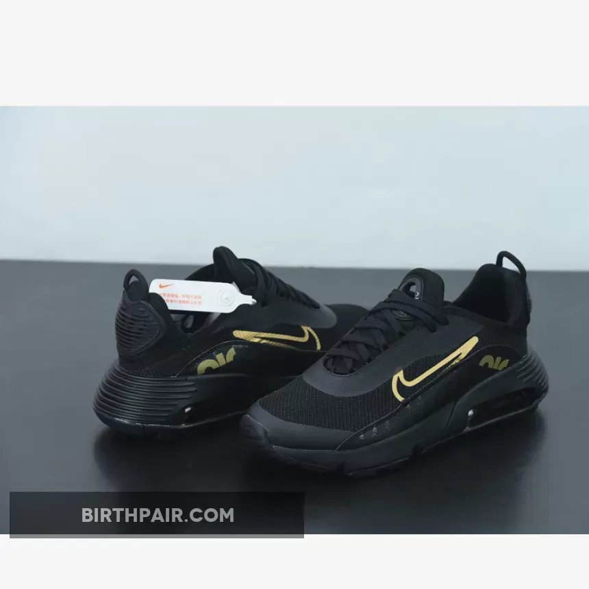 this Air Max 2090 comes dressed in a Black and Gold color combination. In addition, they feature a glossy Nike screen print along with mudguard, while most of the upper comes in Black.