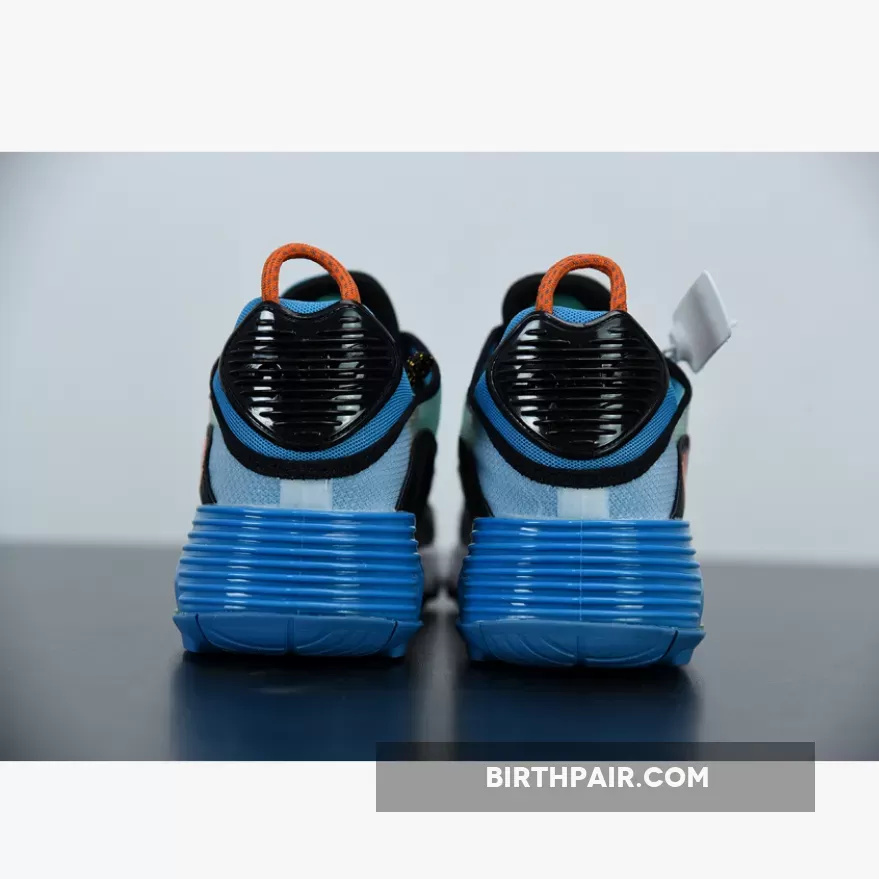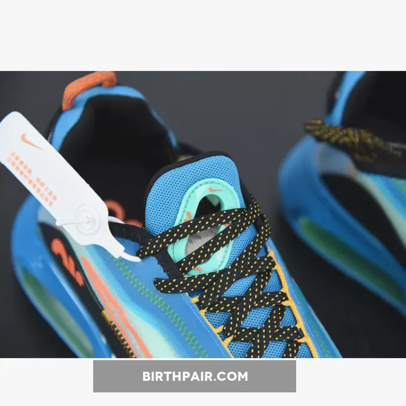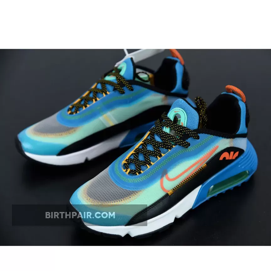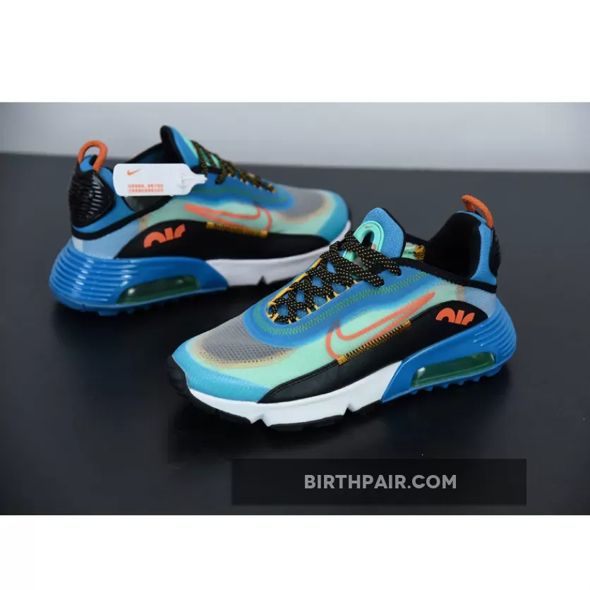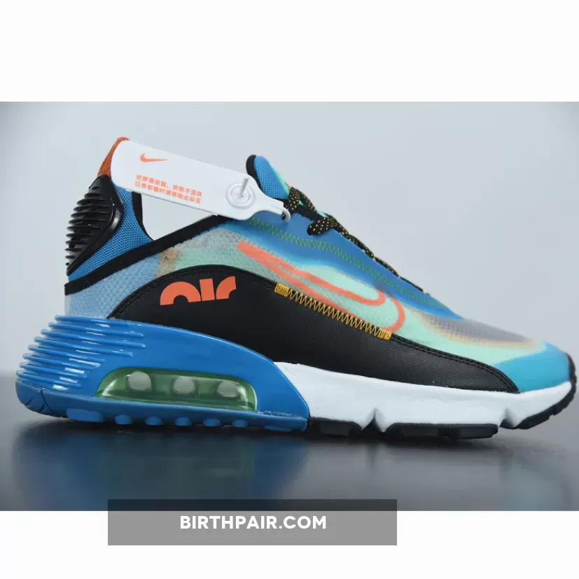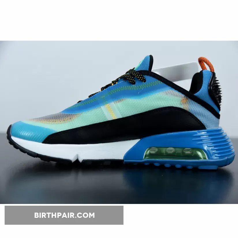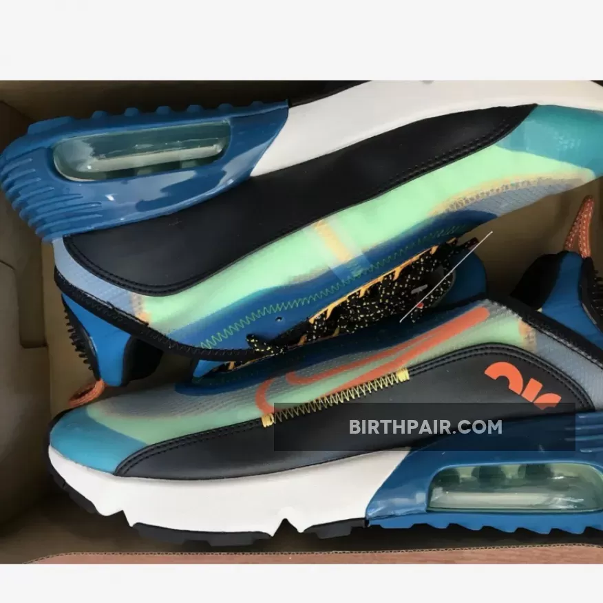 this Air Max 2090 comes dressed in a Green Abyss, Starfish and Illusion Green. Constructed with a transparent upper while Black textile is applied to the mudguard. Following we have shades of Green, Blue and Orange spread across the upper while a White midsole and Black rubber outsole finishes the look.