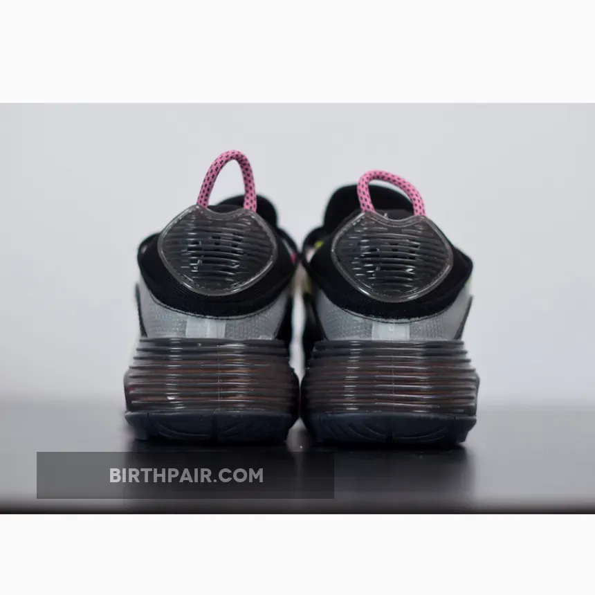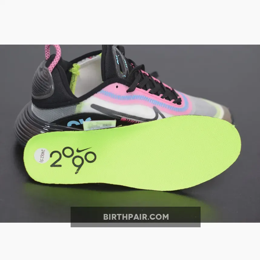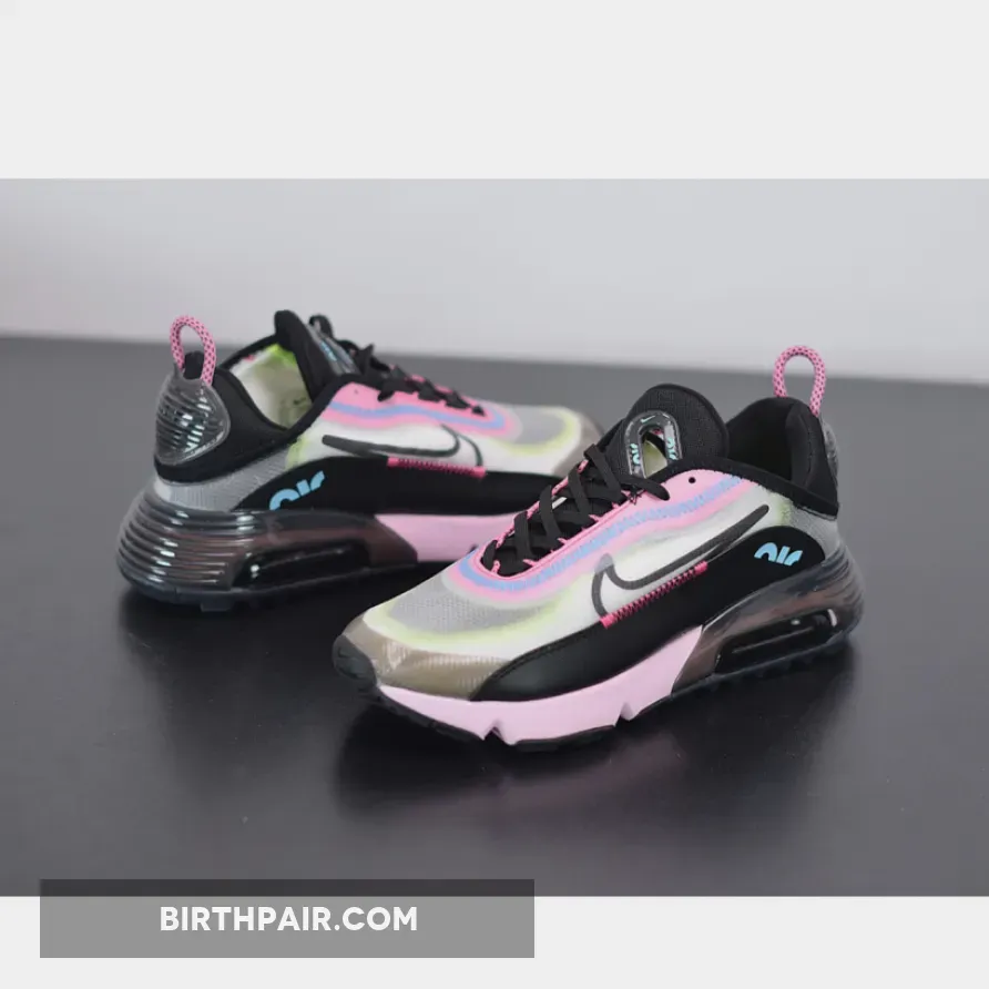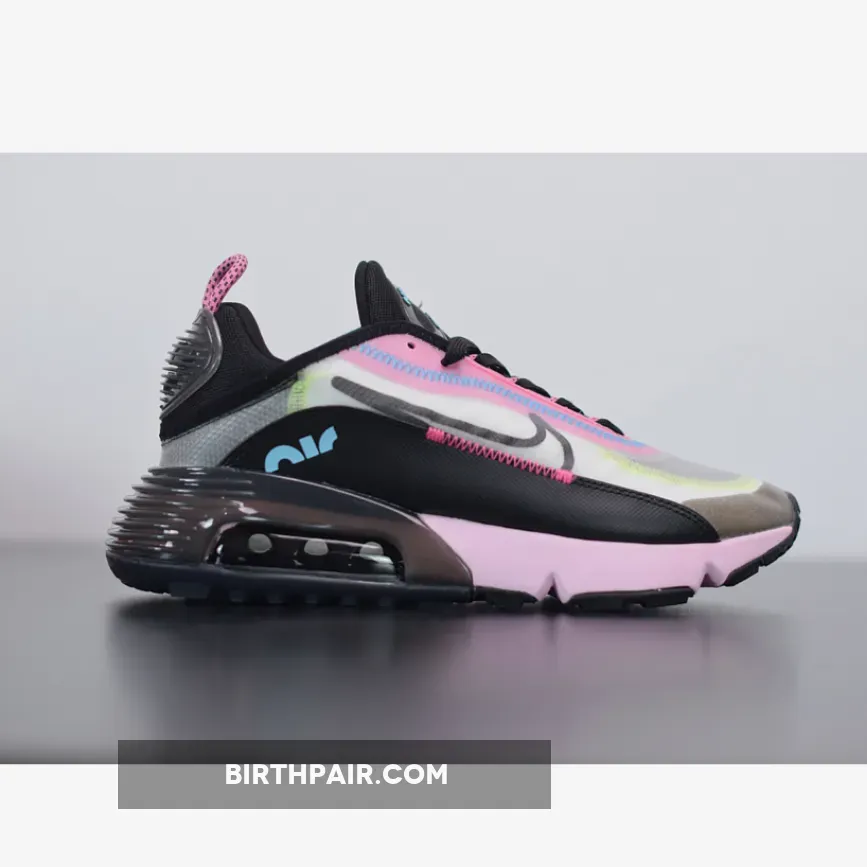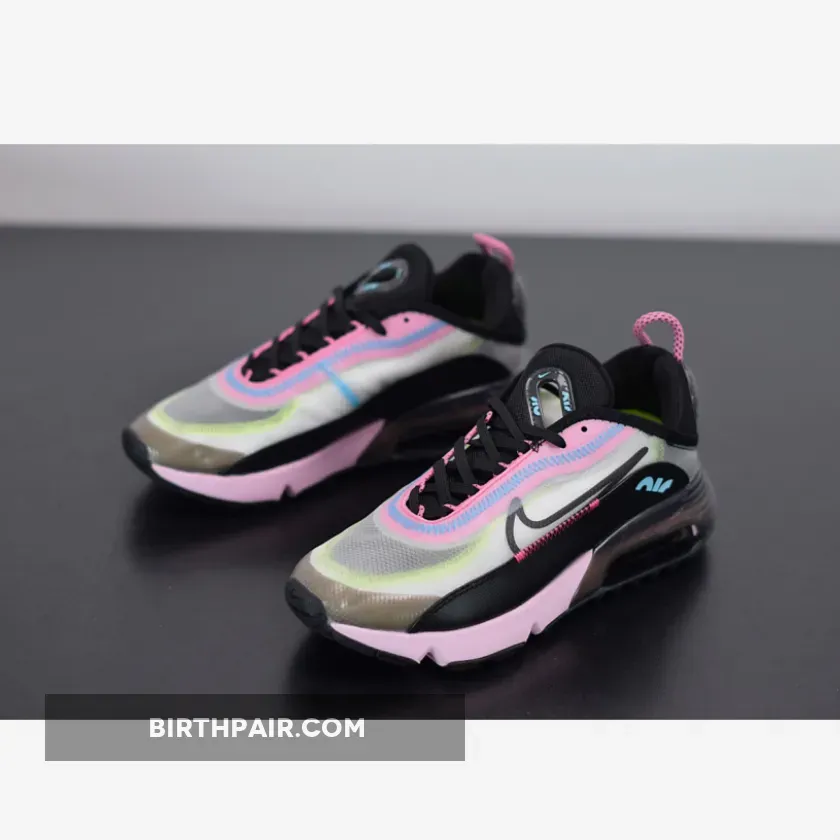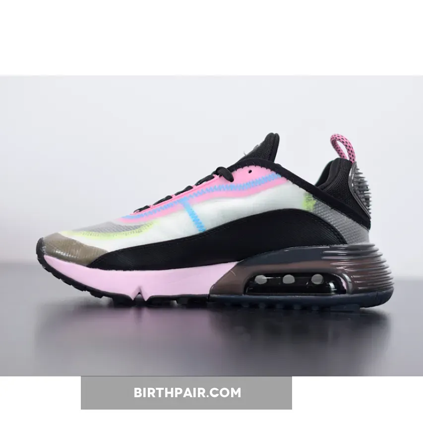 Dressed in a White, Black, Pink Foam, Lotus Pink, Volt, and Blue Gaze color scheme. This Nike Air Max 2090 features a transparent mesh upper with Black textile leather on the mudguards along with Black mesh on the tongues and heels.