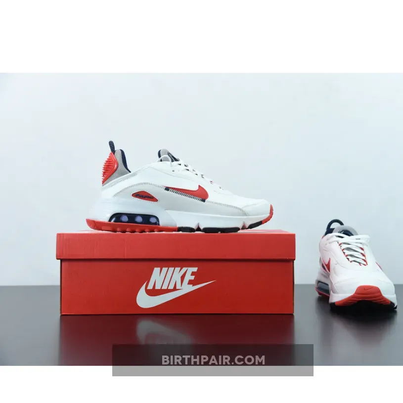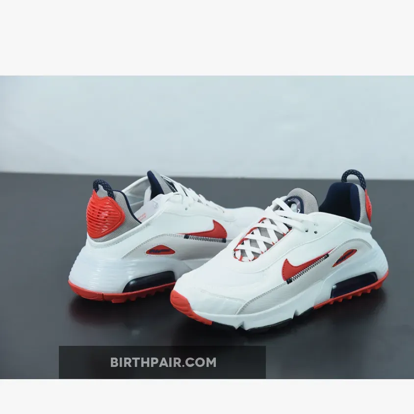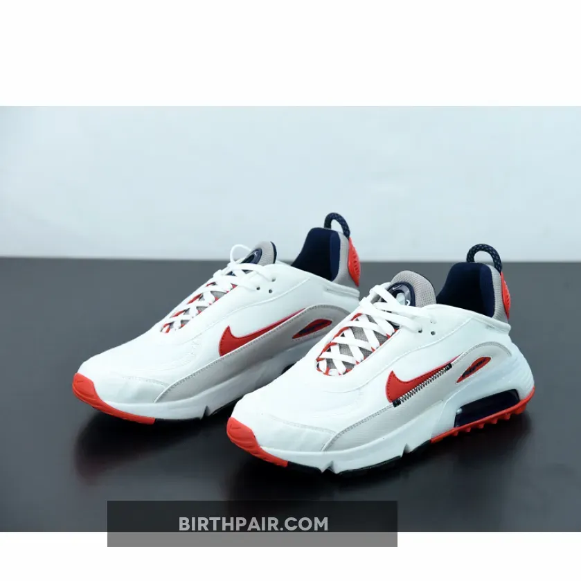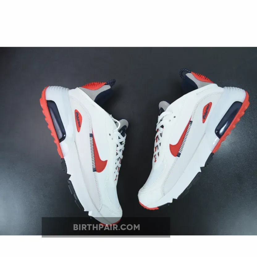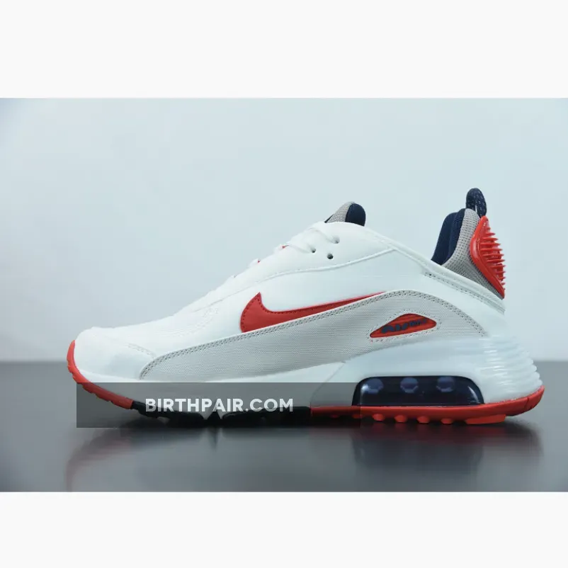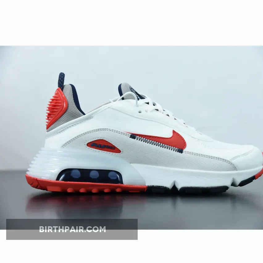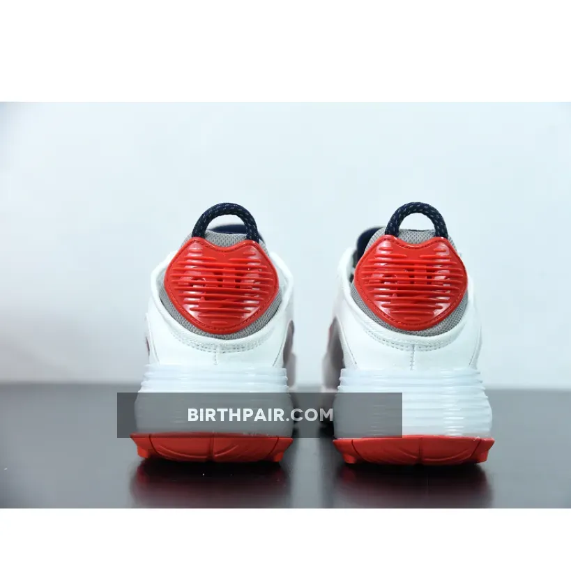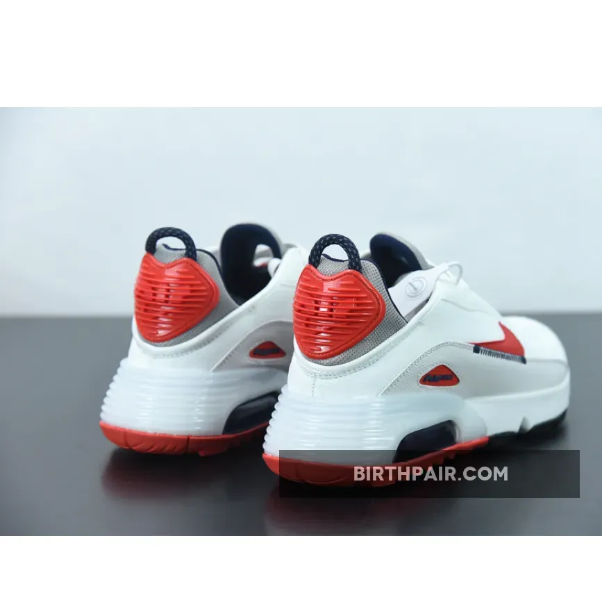 This offering of the Nike Air Max 2090 features a White base constructed with mesh on the toe, fleece covering majority of the upper and textile leather mudguards. Red leather Swooshes, Grey mesh tongues and heels paired with Navy detailing throughout completes the design.